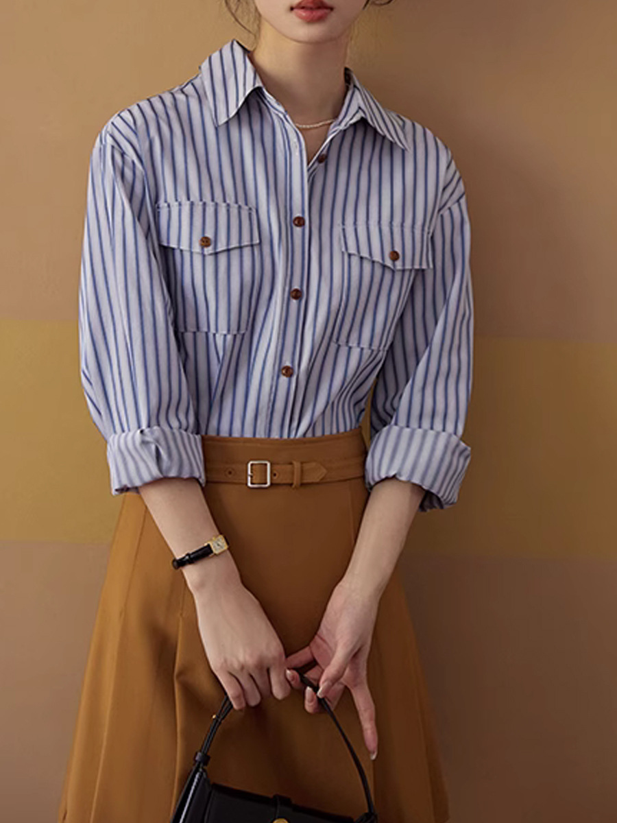 콩 페이스트 핑크 더블 포켓 긴팔 셔츠 여성 봄 새로운 프랑스 복고풍 옷깃 우아한 탑스토어 가기