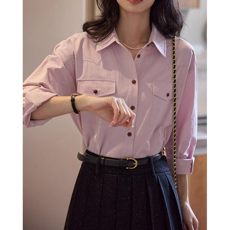콩 페이스트 핑크 더블 포켓 긴팔 셔츠 여성 봄 새로운 프랑스 복고풍 옷깃 우아한 탑