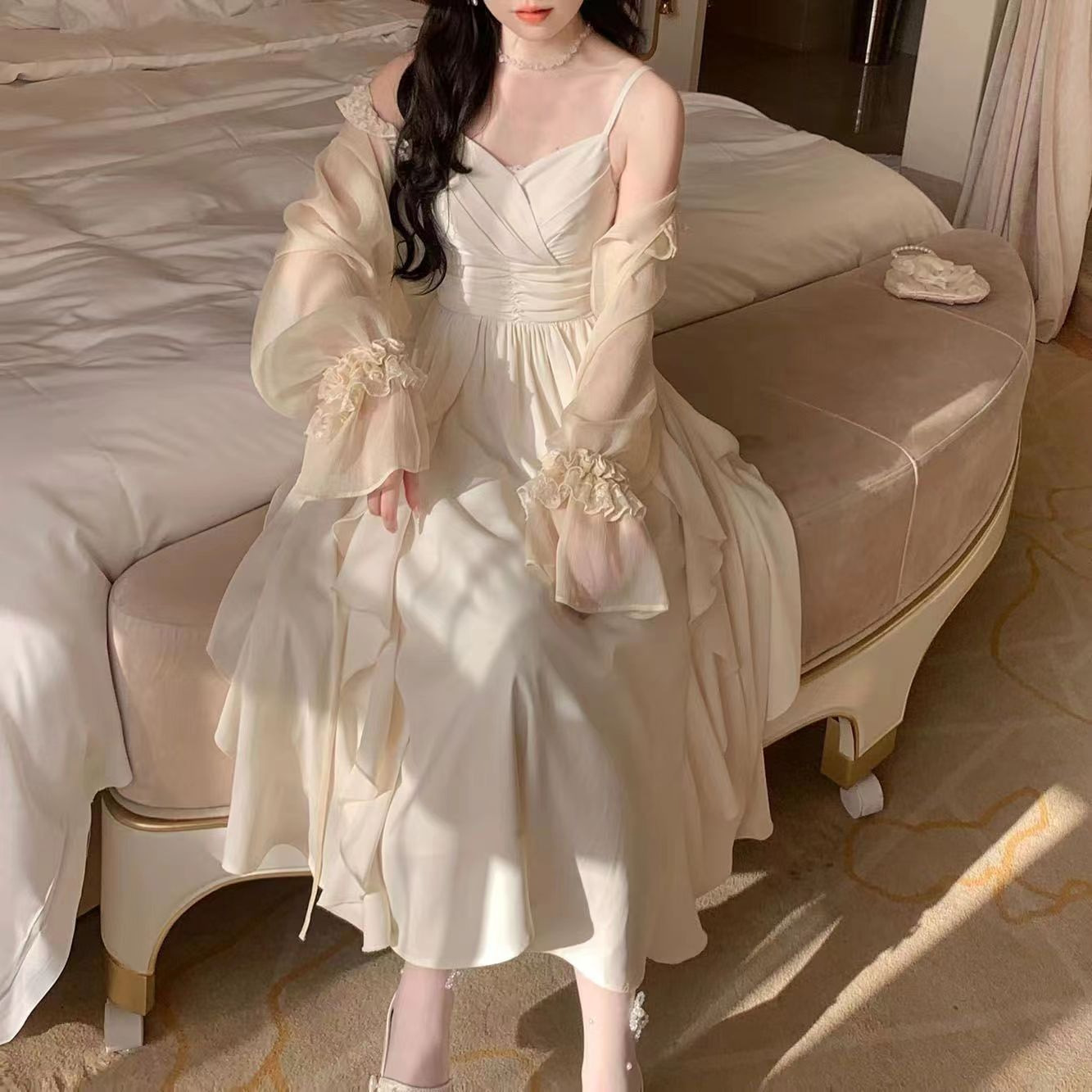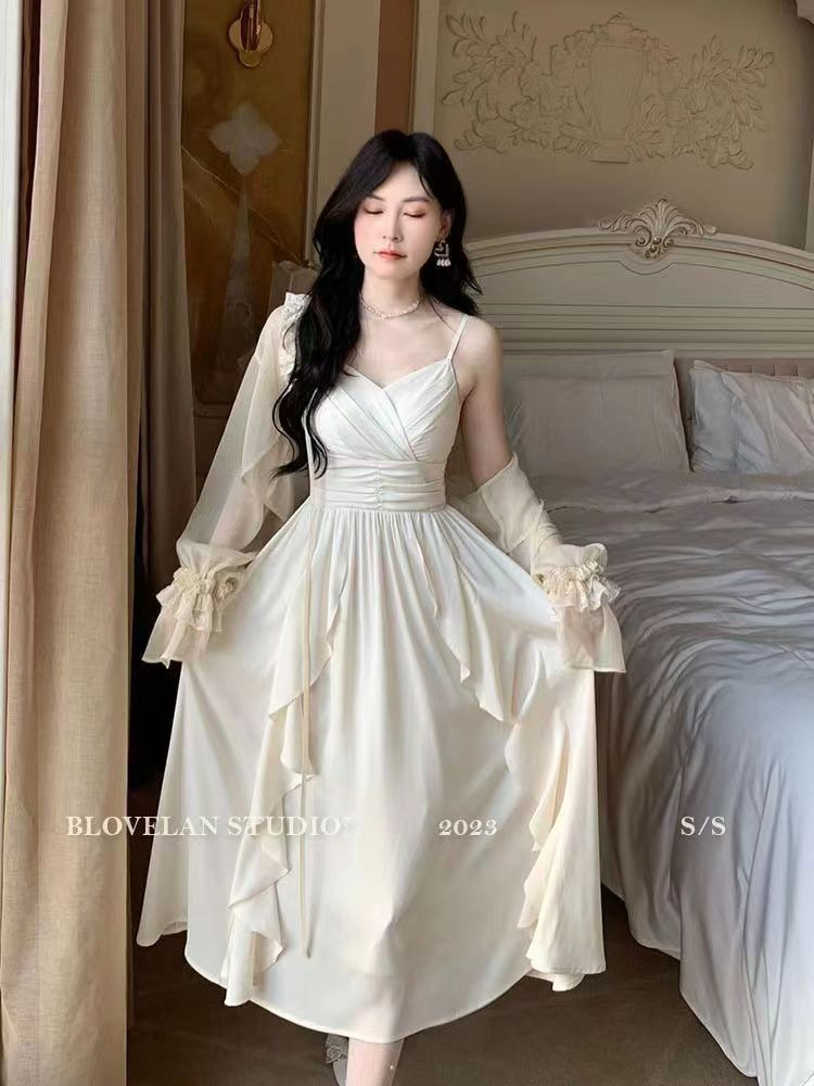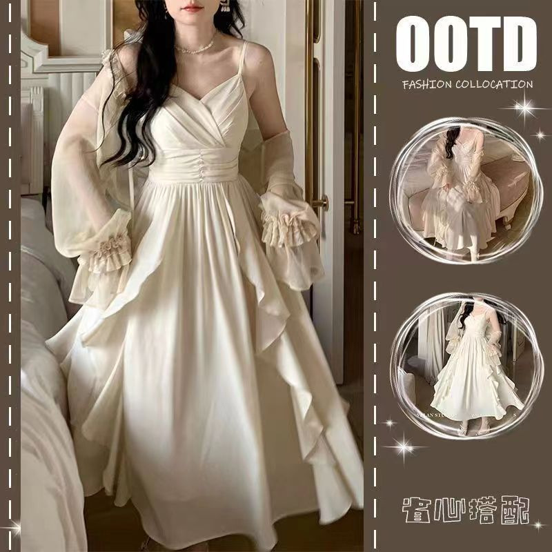 플러스 사이즈 여성 의류 봄/여름 세트 여성 2024 새로운 프랑스 슈퍼 요정 카디건 데이트 타이트한 허리 원피스 슬링 원피스스토어 가기