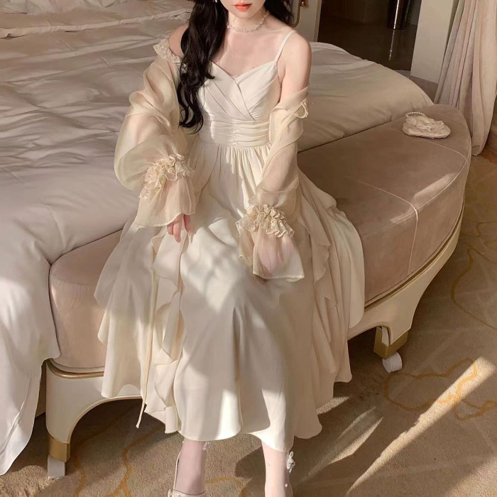 플러스 사이즈 여성 의류 봄/여름 세트 여성 2024 새로운 프랑스 슈퍼 요정 카디건 데이트 타이트한 허리 원피스 슬링 원피스
