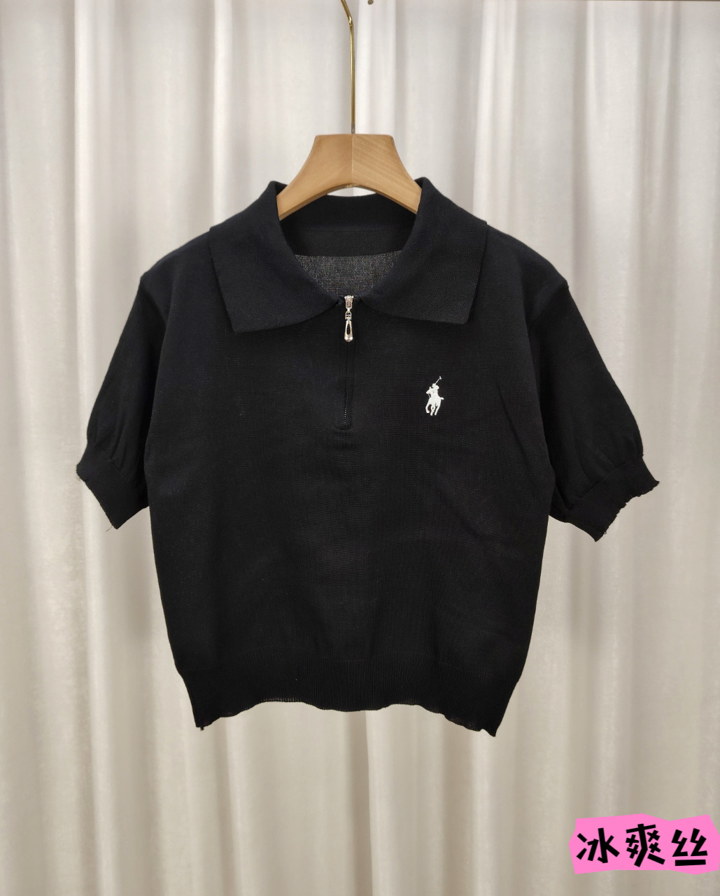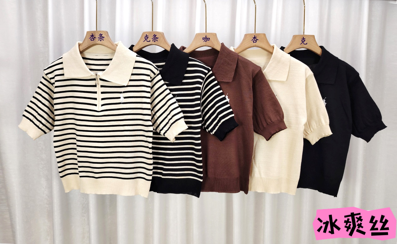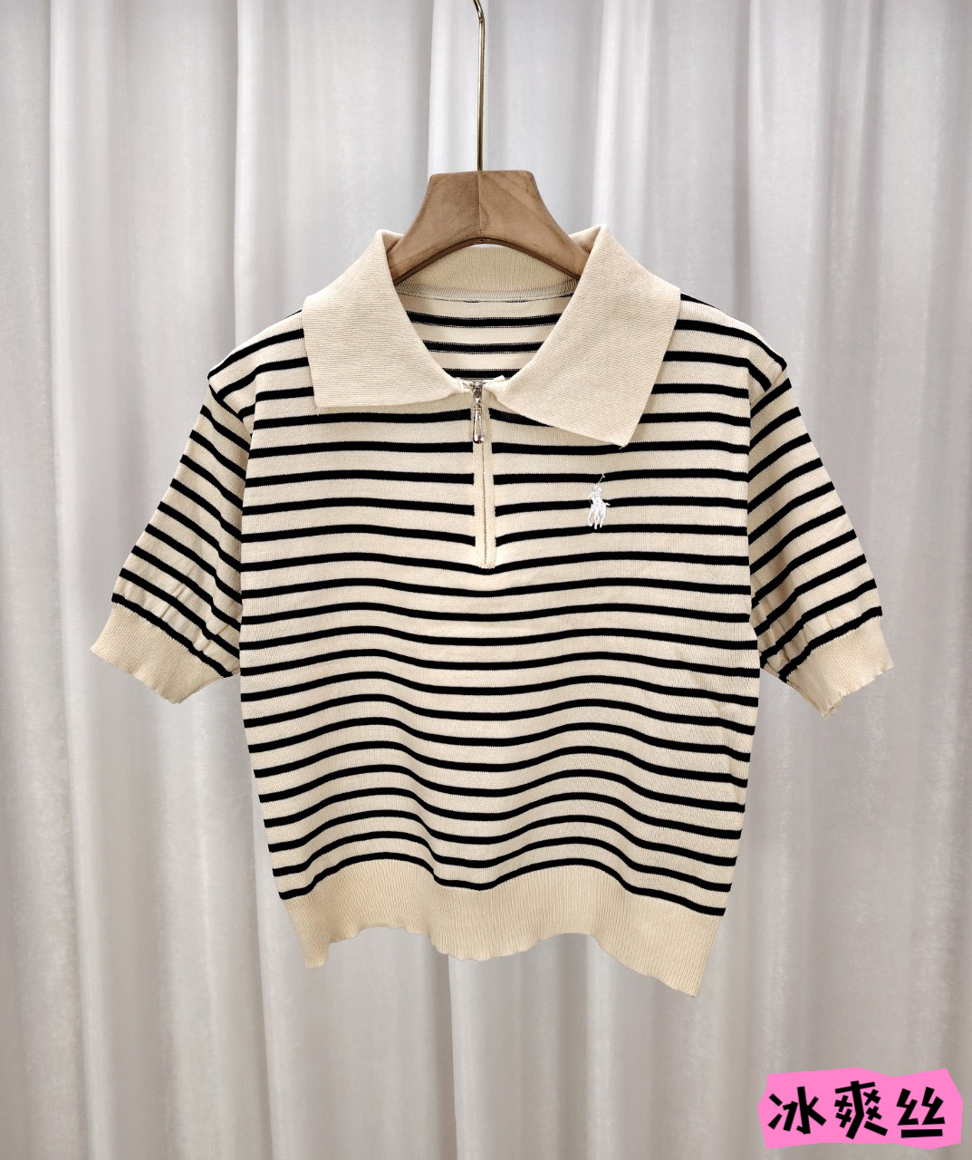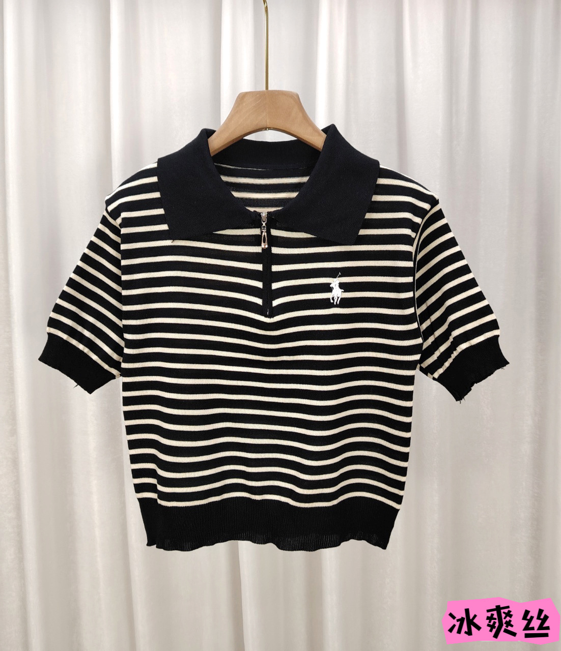 여성 의류 디자인 옷깃 줄무늬 짧은 소매 약간 뚱뚱한 소녀 여름 새로운 슬리밍 어깨 니트 탑스토어 가기