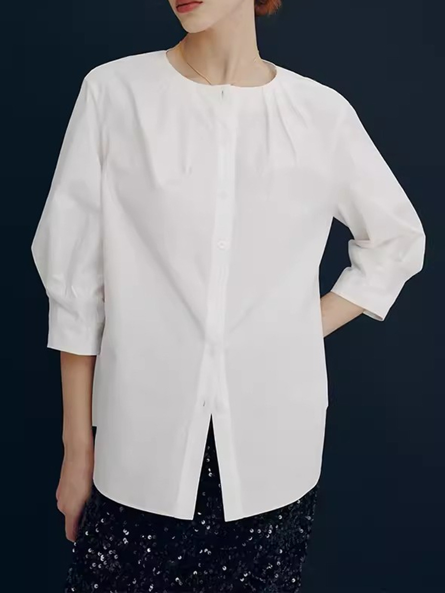 흰색 3/4 소매 라운드 넥 프랑스 스타일 셔츠 여성 높은 감각 2024 봄과 여름 새로운 가벼운 럭셔리 코튼 탑