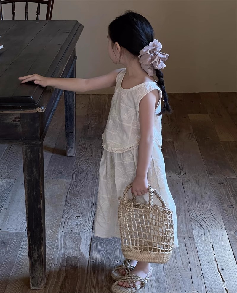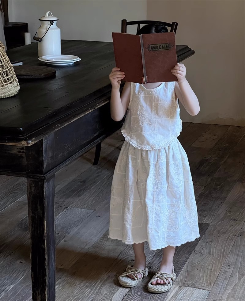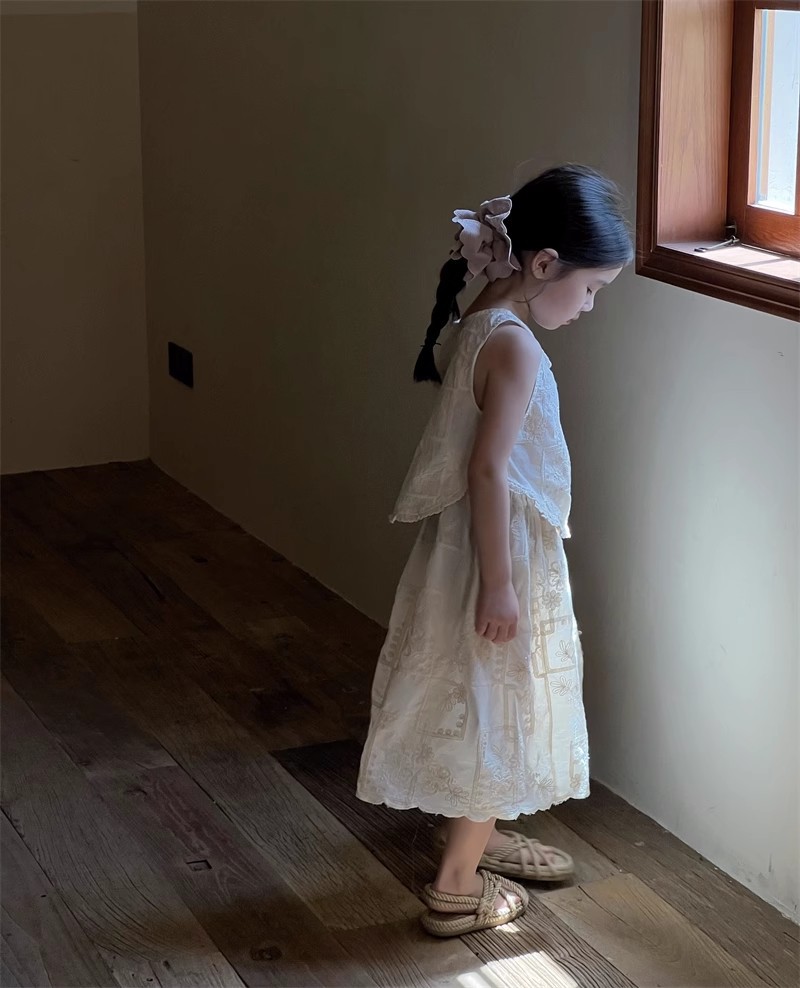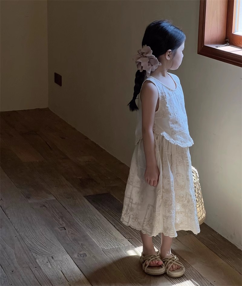 여아용 한국 자수 세트 반치마 2025 여름 의류 아동용 조끼 스커트 아기용 세련된 숲풍 여아 의류스토어 가기