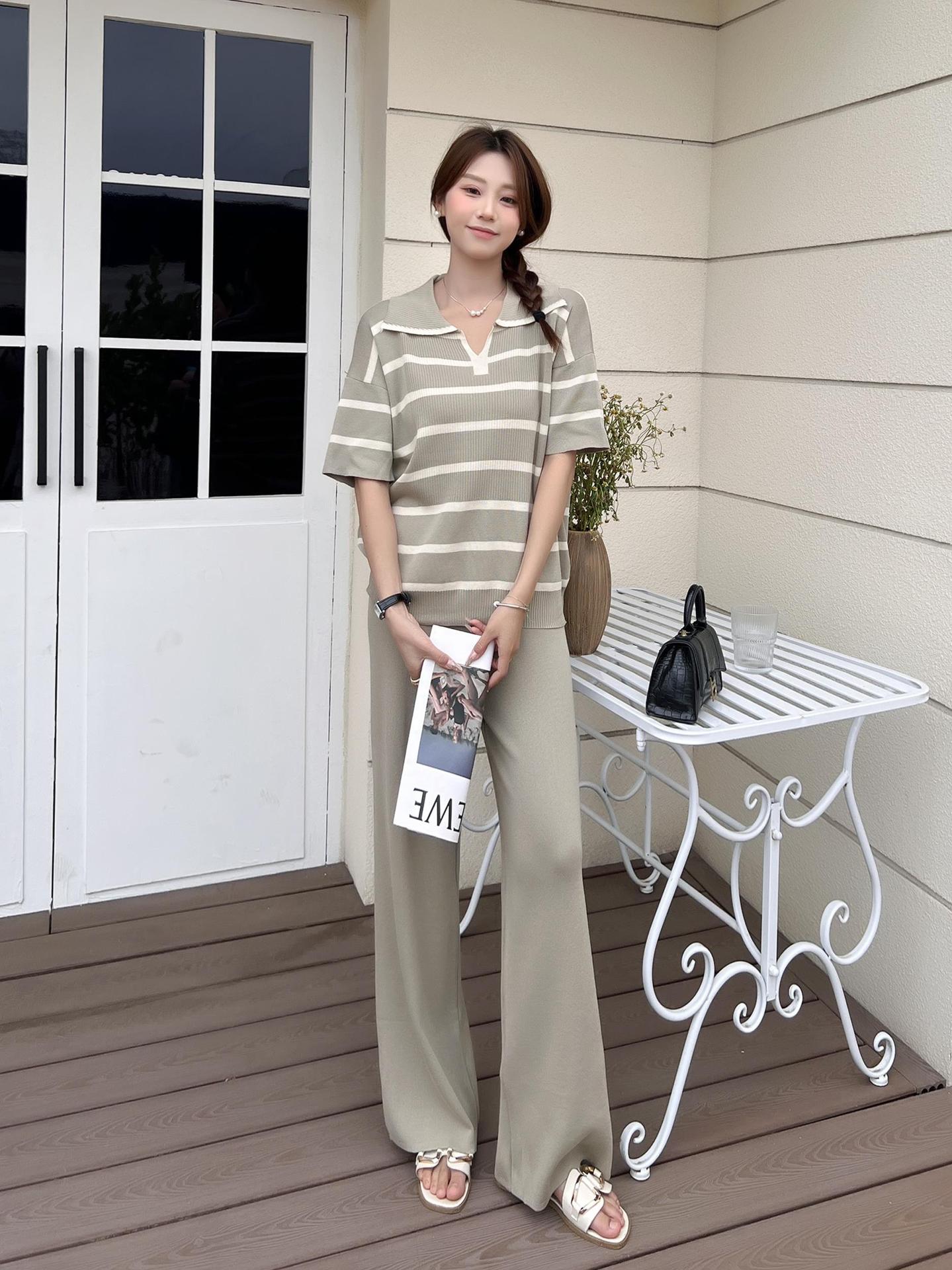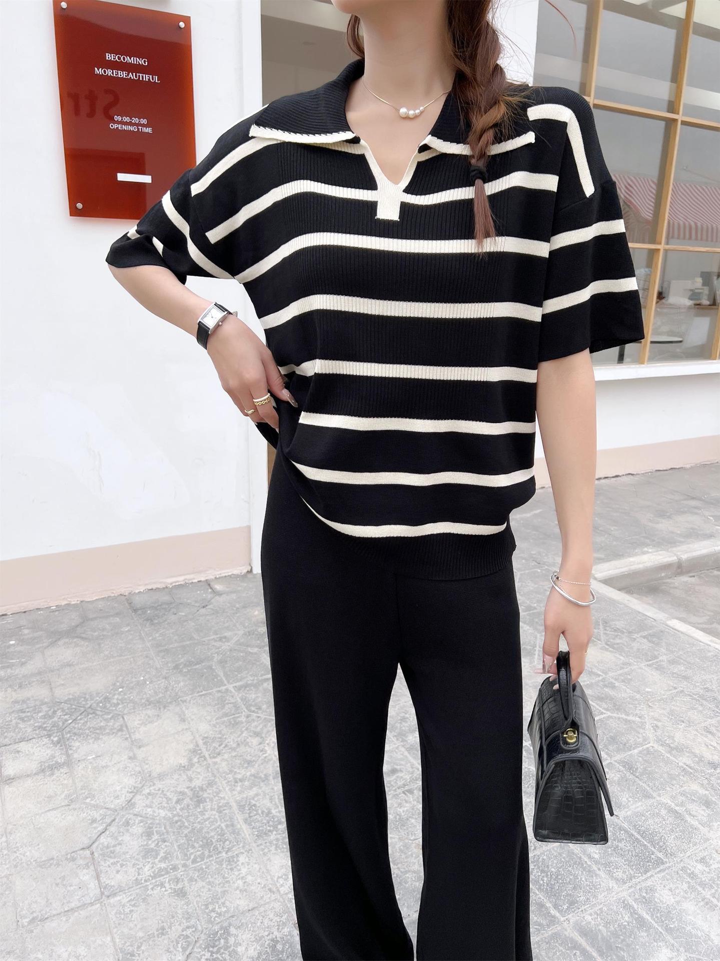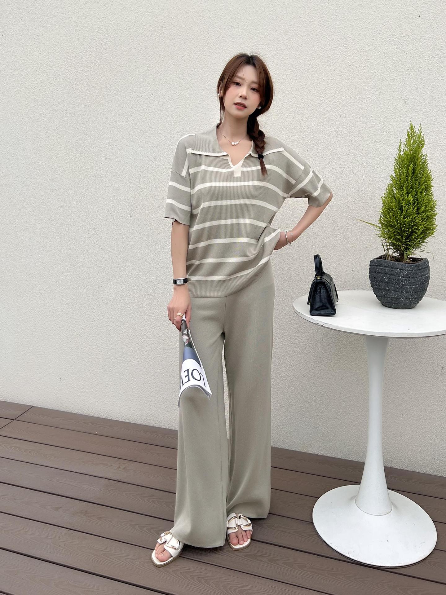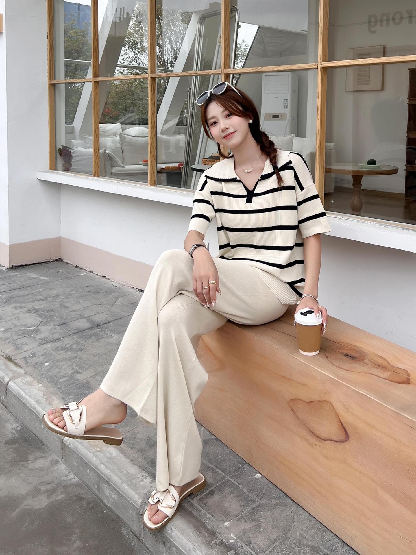 2024 새로운 여름 대비 컬러 패션 세트 느슨한 줄무늬 옷깃 니트 탑 캐주얼 하이 허리 니트 세트스토어 가기