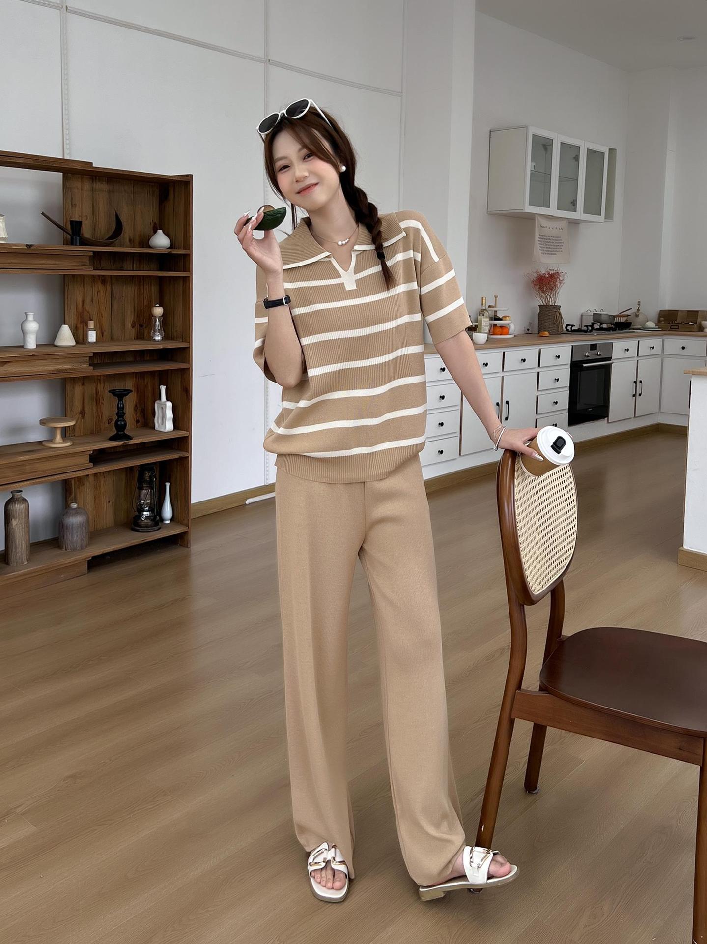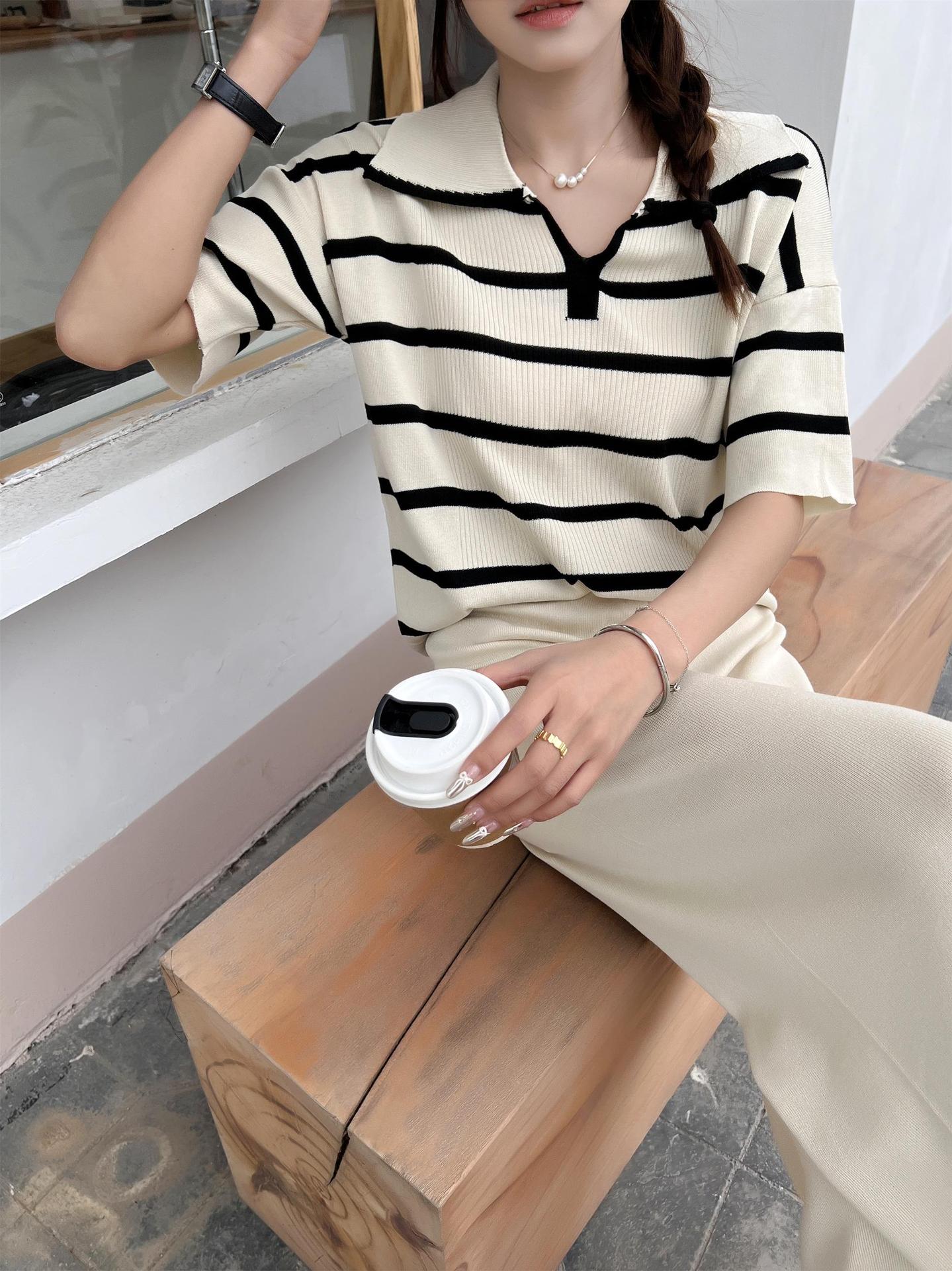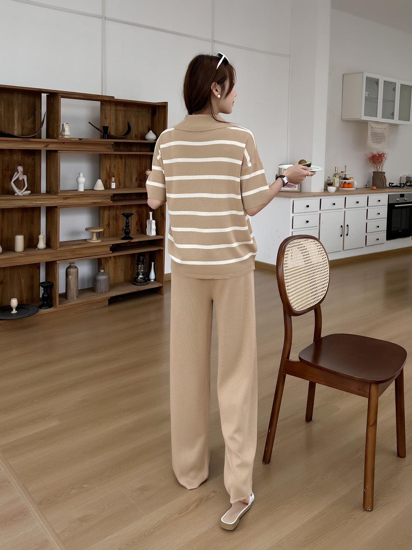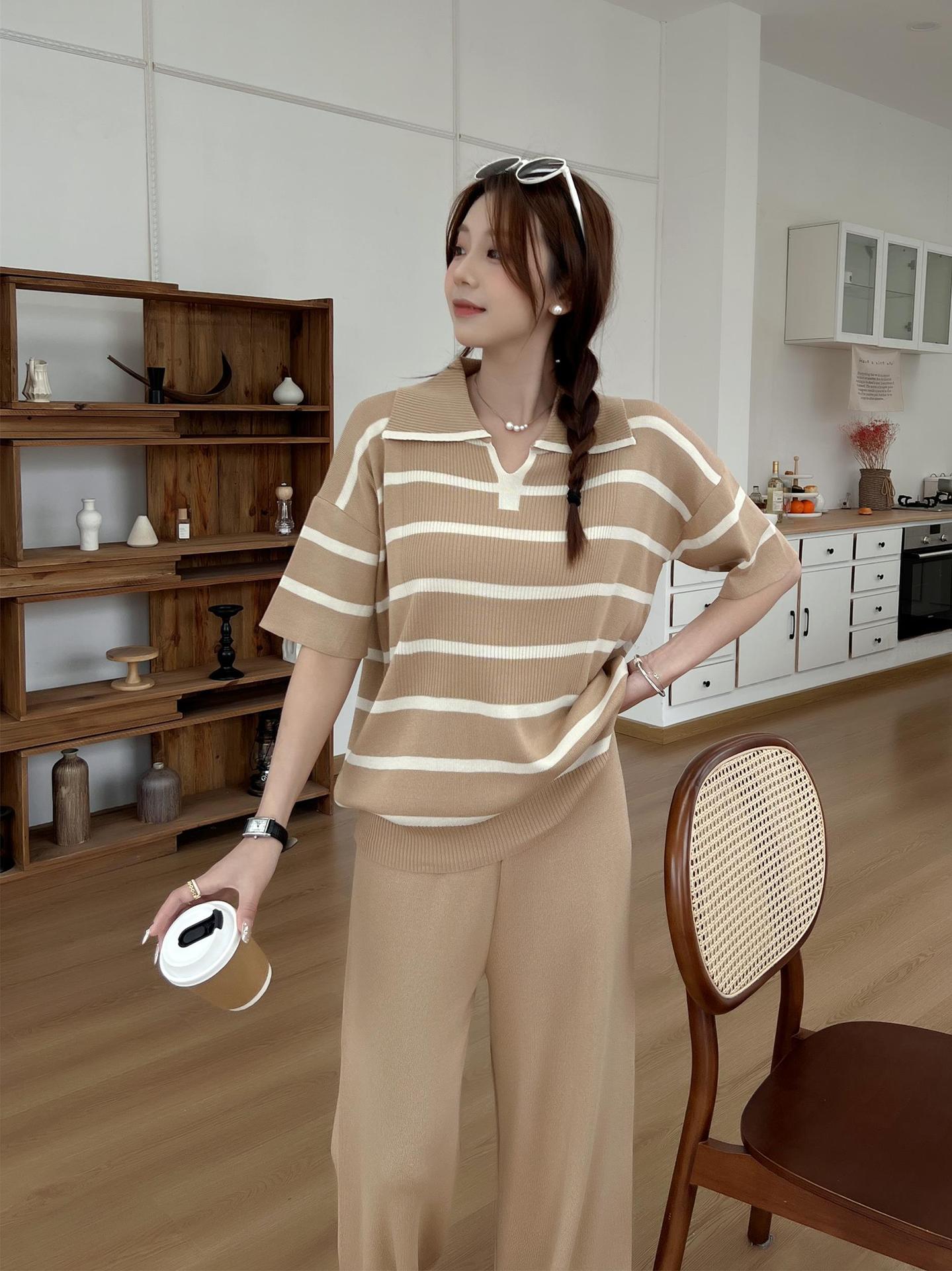 2024 새로운 여름 대비 컬러 패션 세트 느슨한 줄무늬 옷깃 니트 탑 캐주얼 하이 허리 니트 세트스토어 가기