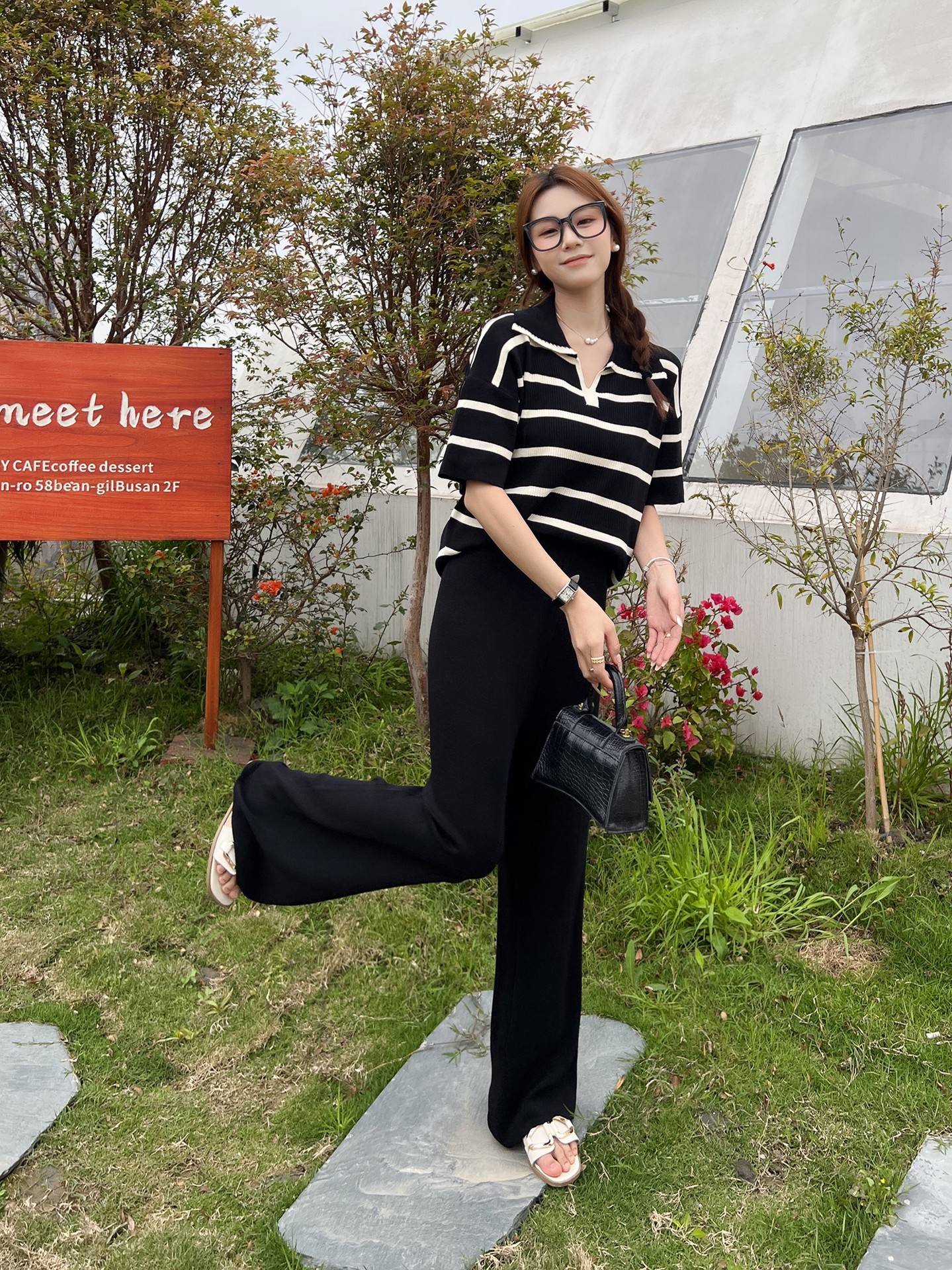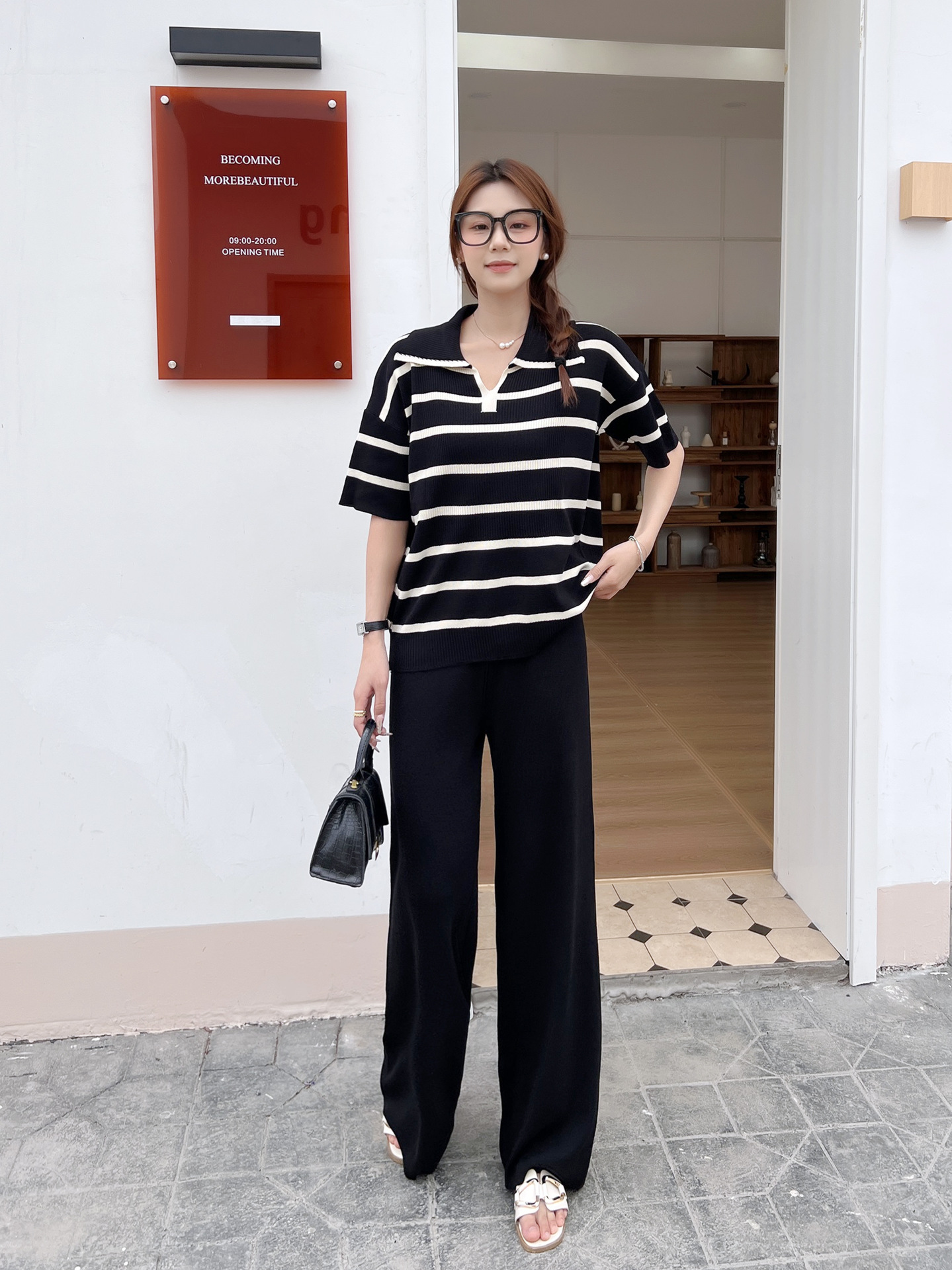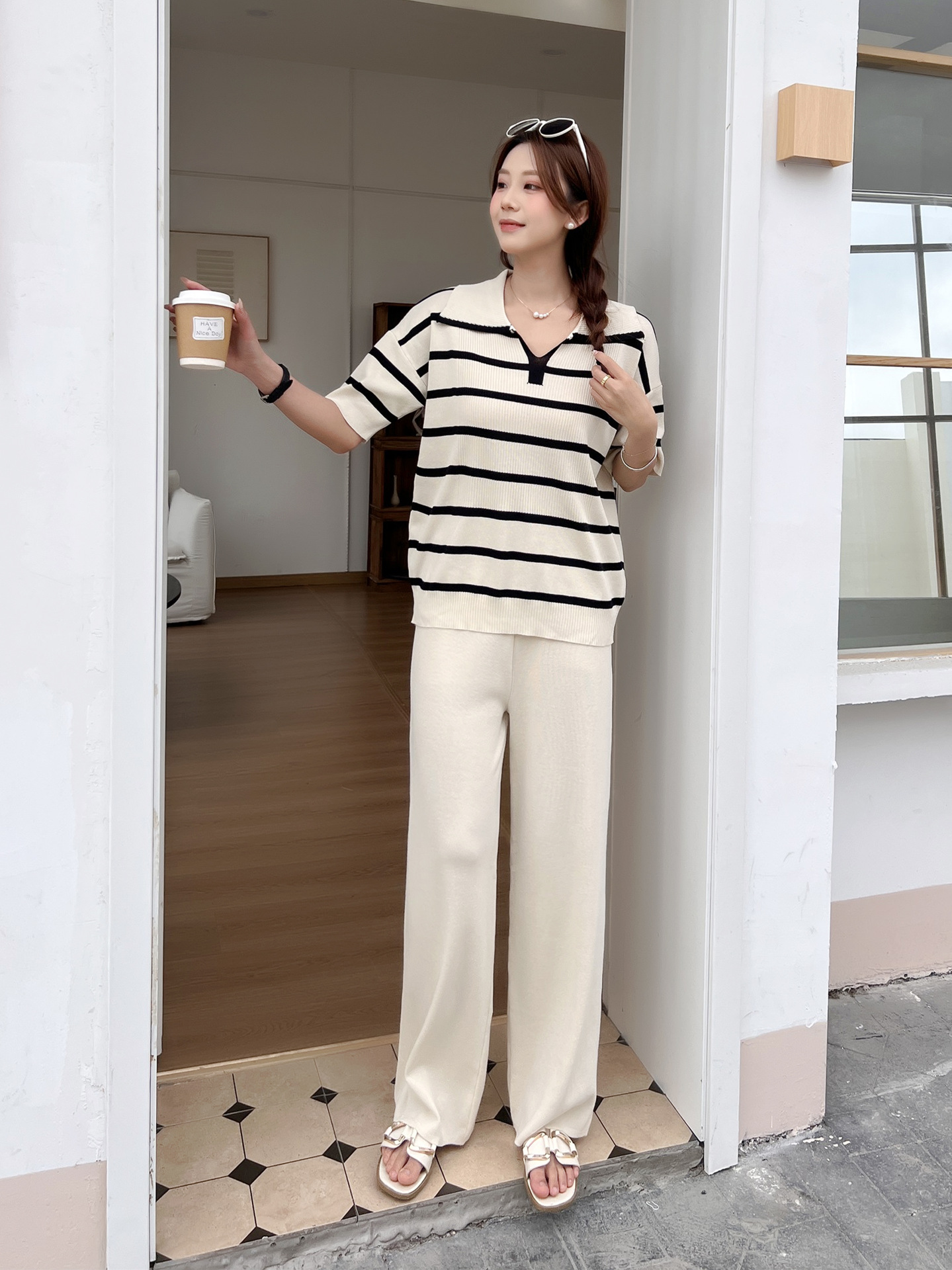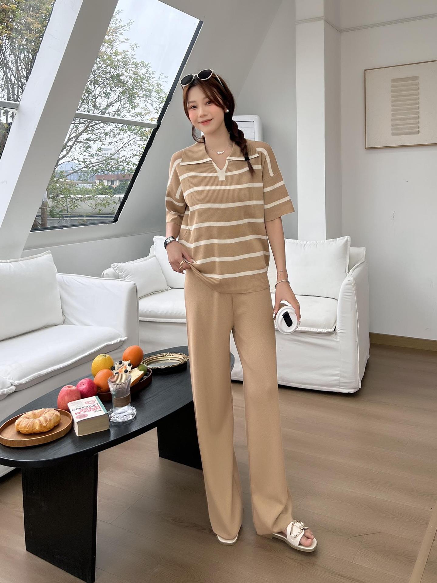 2024 새로운 여름 대비 컬러 패션 세트 느슨한 줄무늬 옷깃 니트 탑 캐주얼 하이 허리 니트 세트스토어 가기