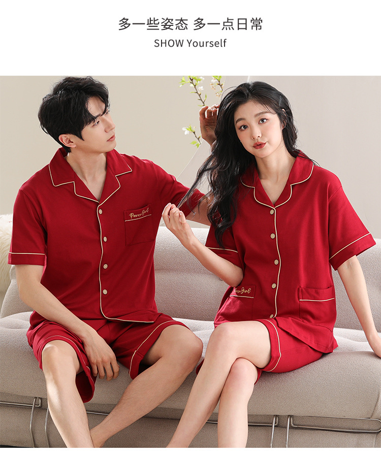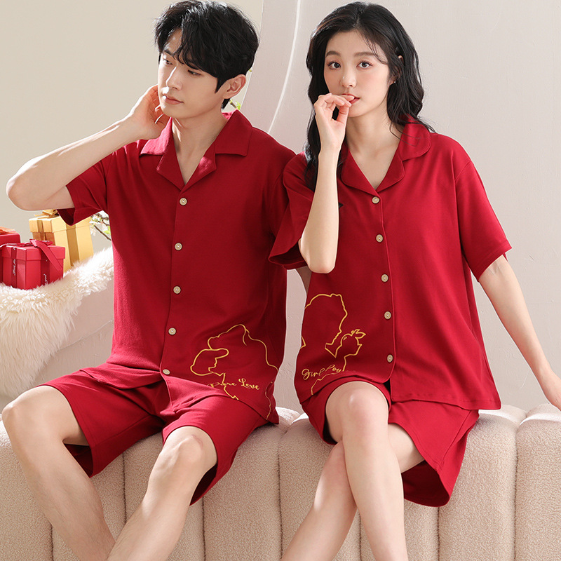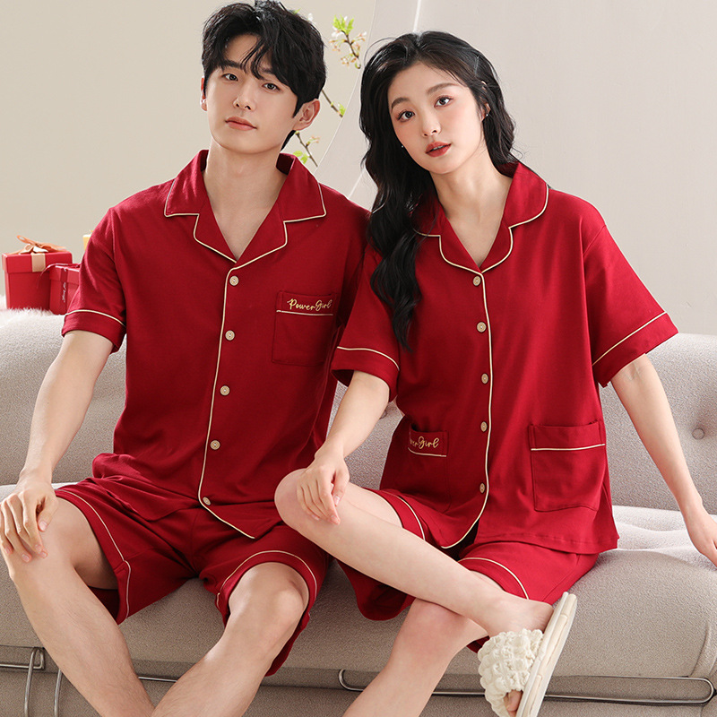 커플 잠옷 여름 순수한면 짧은 소매 밝은 빨간색 행운의 결혼식 축제 남자와 여자의 가정 세트스토어 가기