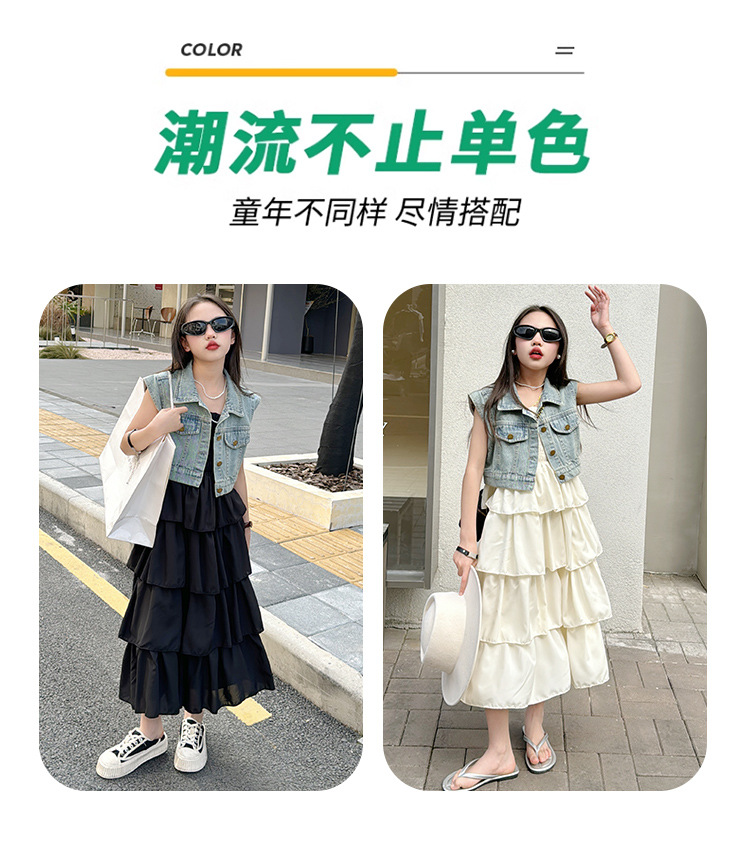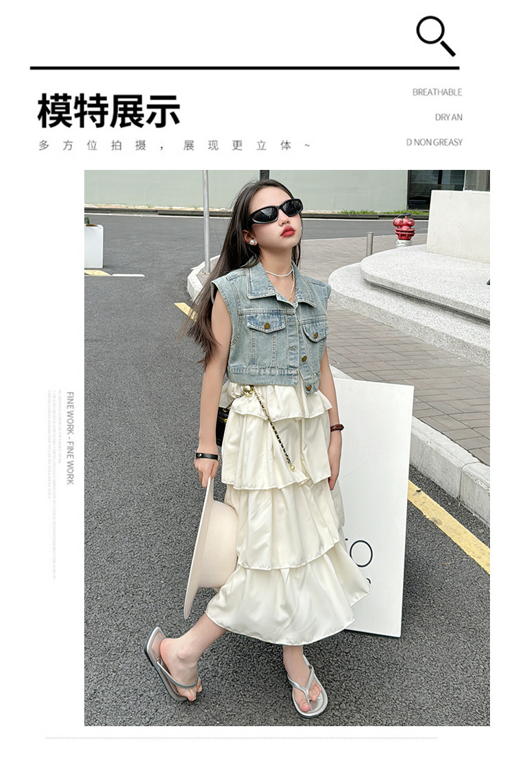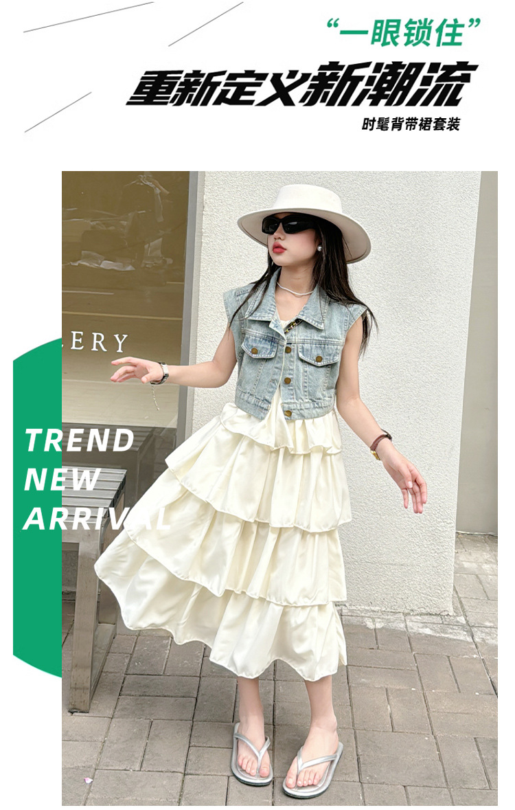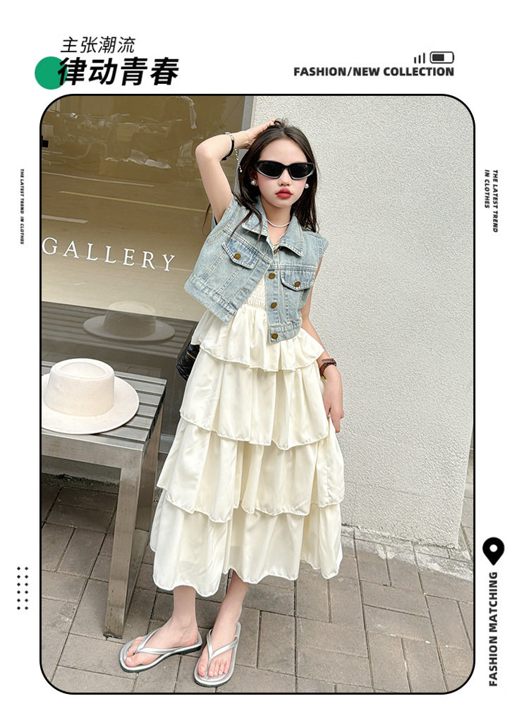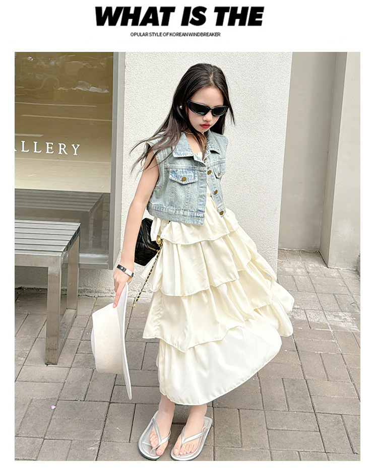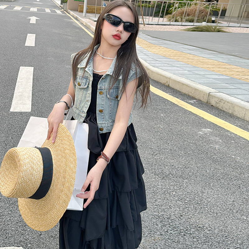 소녀 여름 의류 세트 2023 새로운 큰 아이들 데님 조끼 여름 어린이 케이크 스커트 세트 서양식 세트