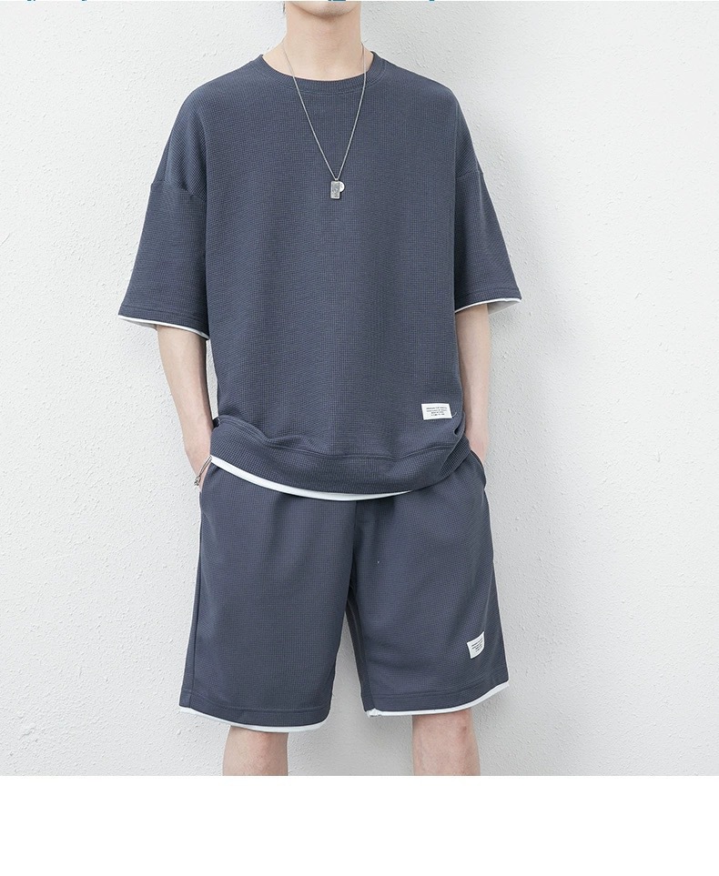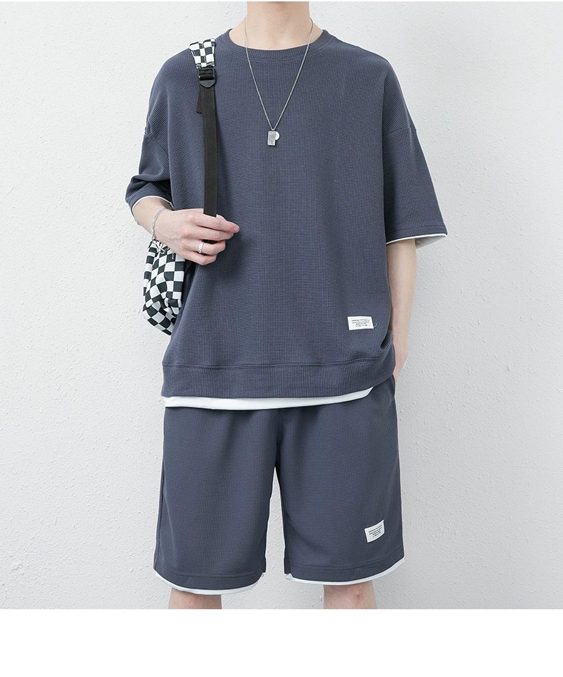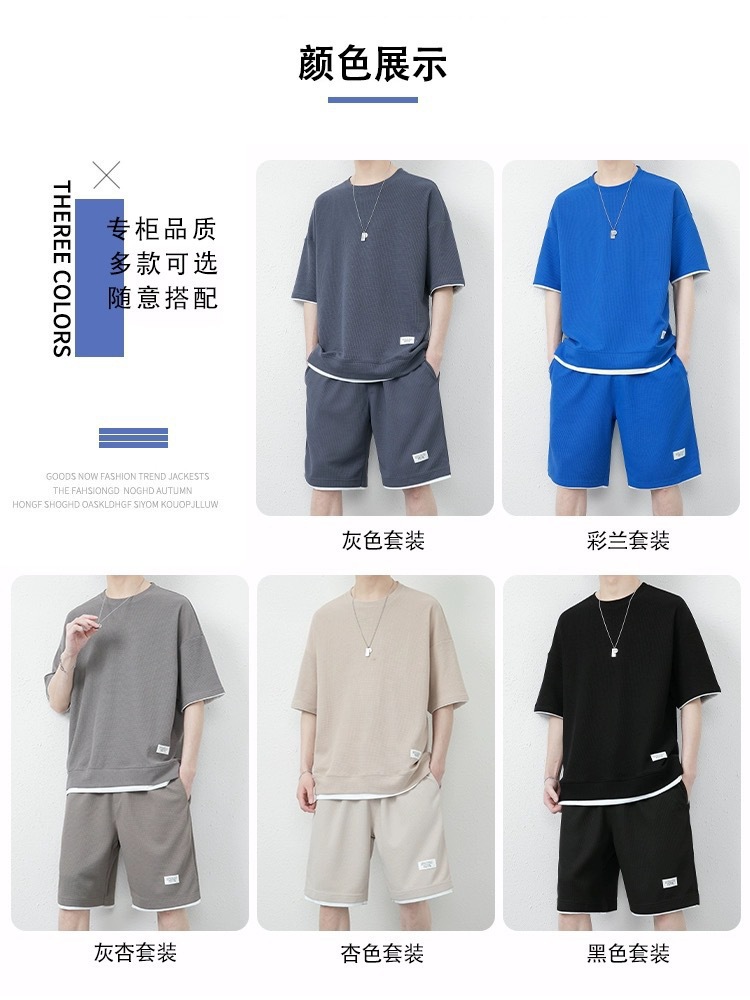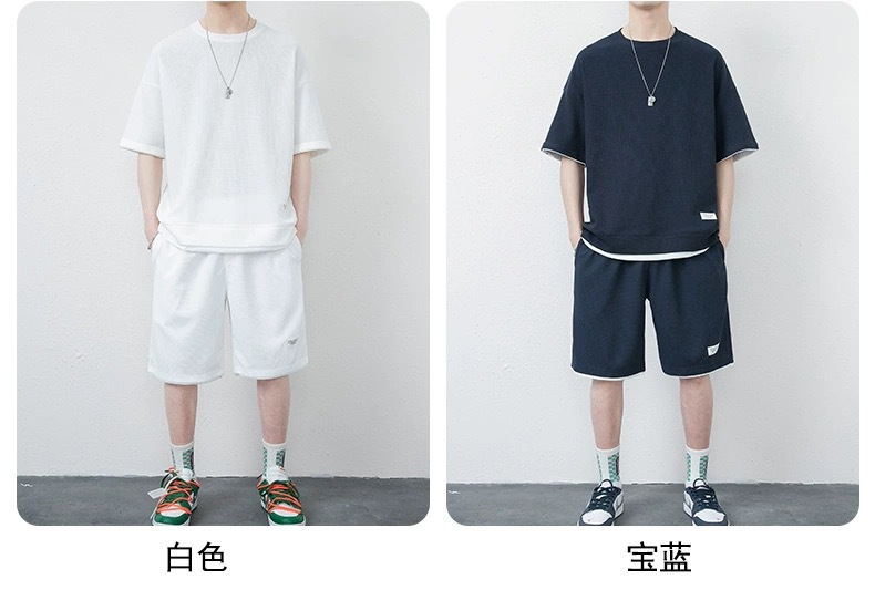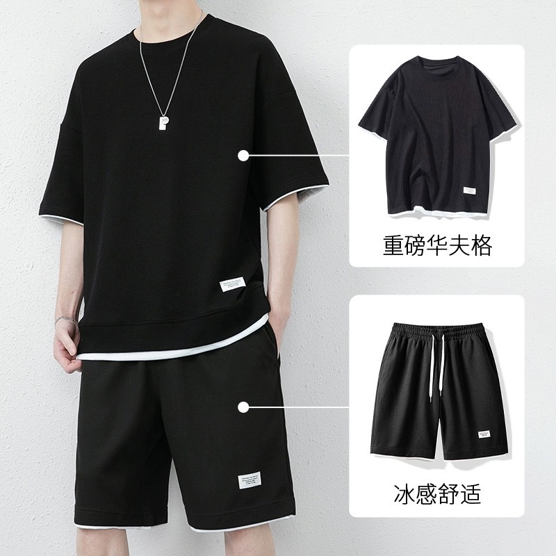 미국식 가짜 투피스 아이스 실크 와플 캐주얼 스포츠 세트 남자 여름 느슨한 플러스 사이즈 통기성 그룹 빌딩 클래스 의류스토어 가기