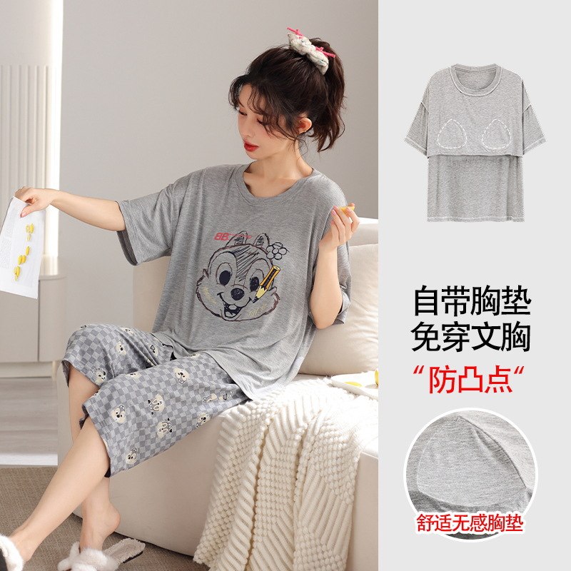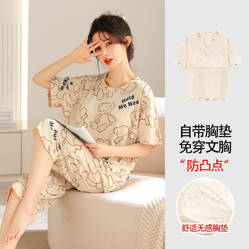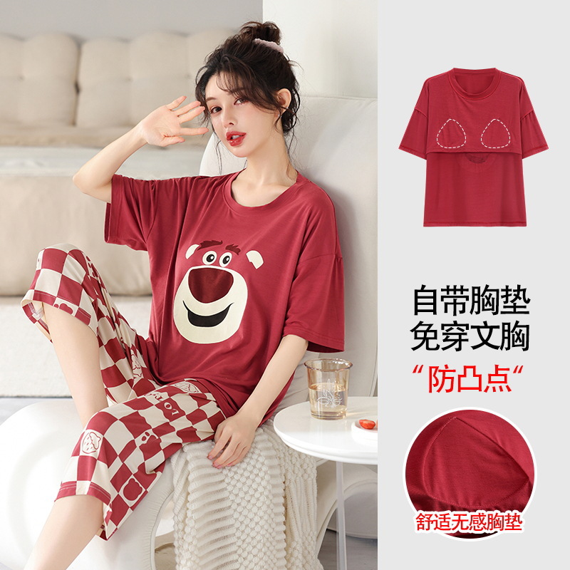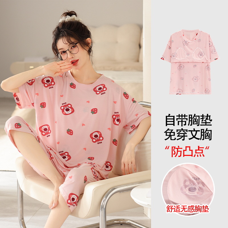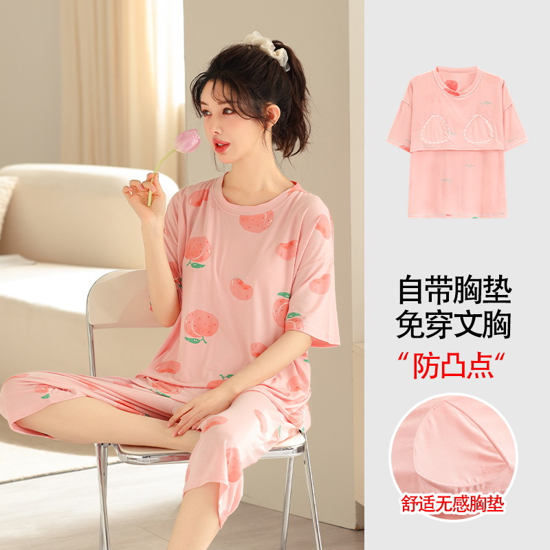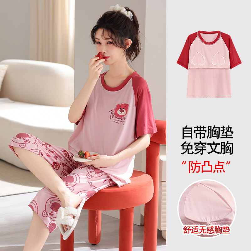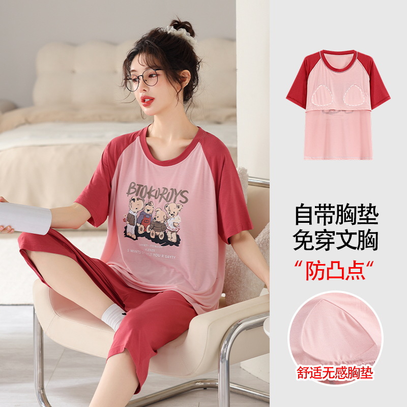 가슴 패드가 달린 플러스 사이즈 여성 잠옷 여름 둥근 목 짧은 소매 크롭 팬츠 세트 겉옷 플러스 사이즈 5XL220kg 의 홈웨어스토어 가기