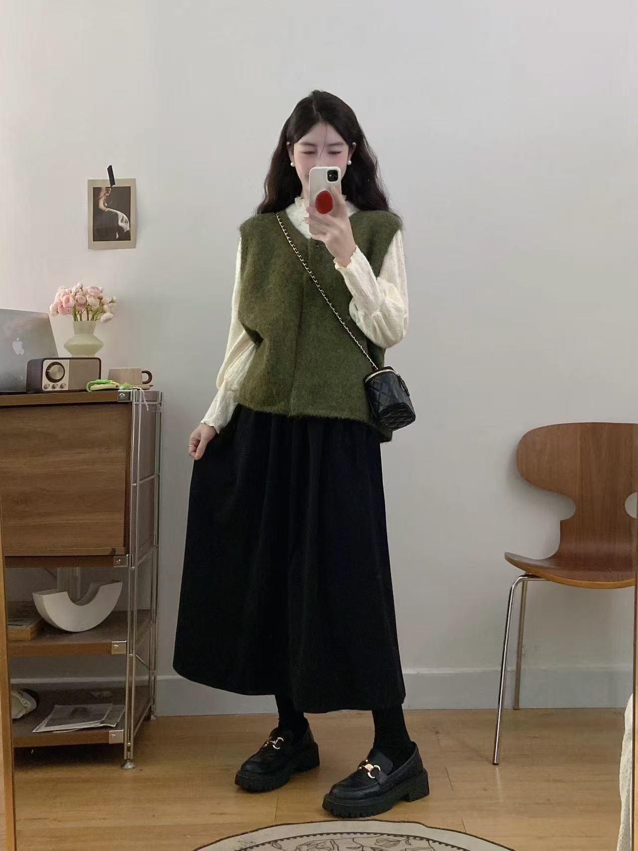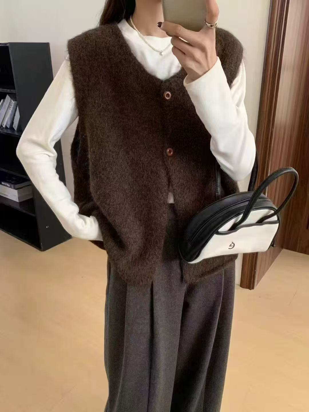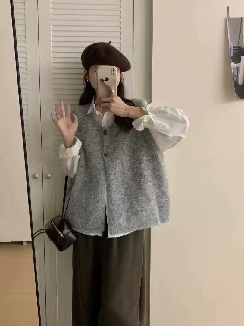 한국 스타일 레트로 심플 빅사이즈 루즈핏 레이어드 디자인 투버튼 조끼 여성용 플러시 민소매 니트 탑