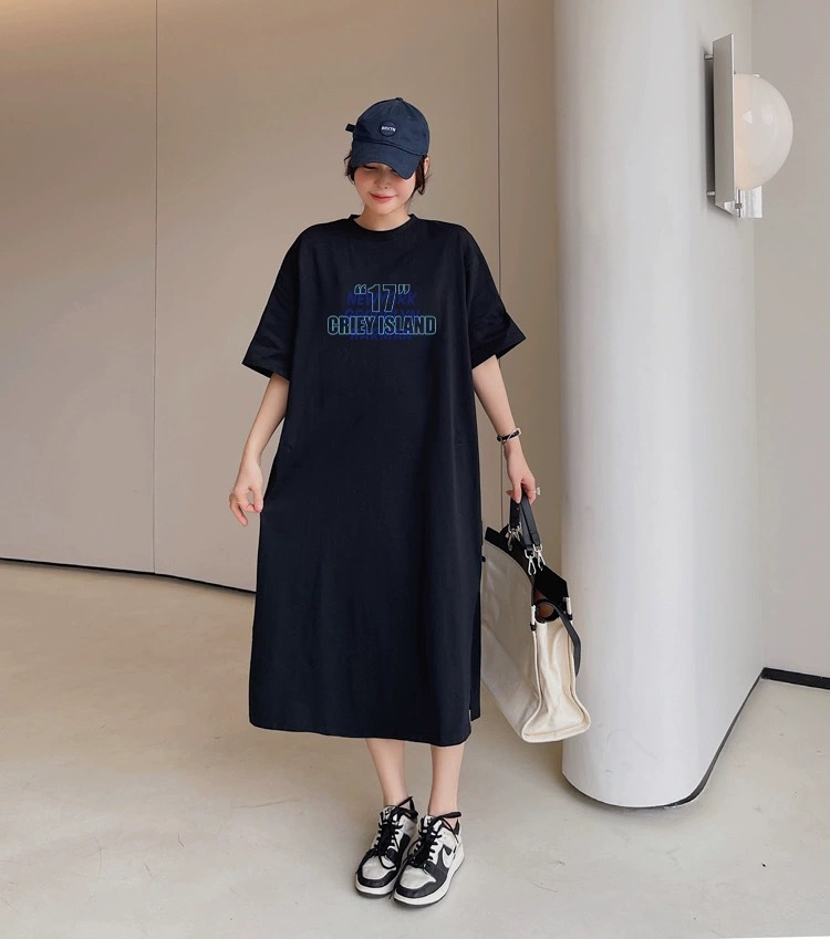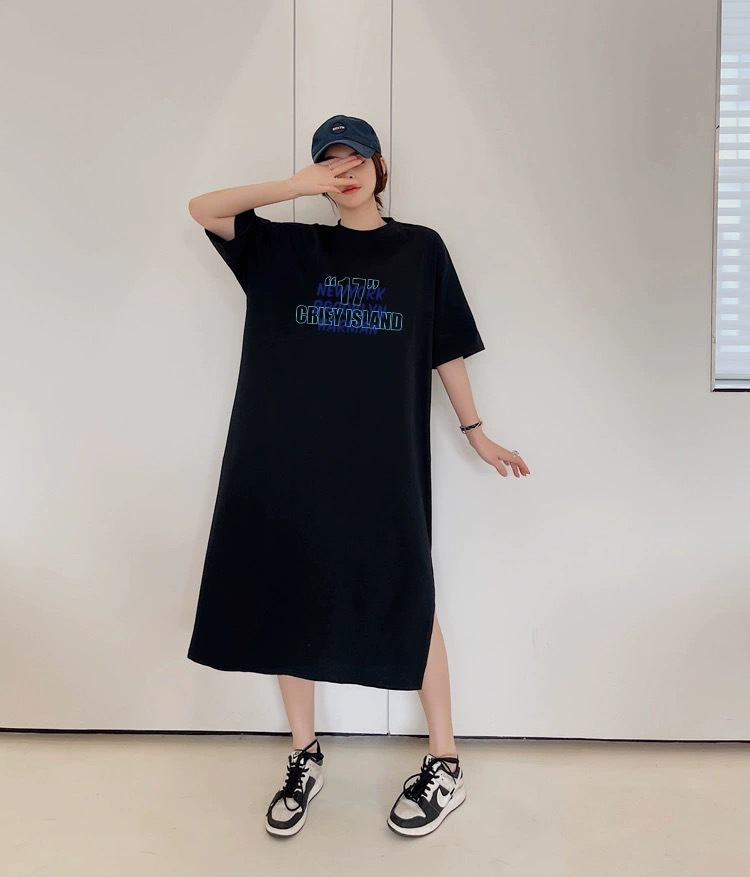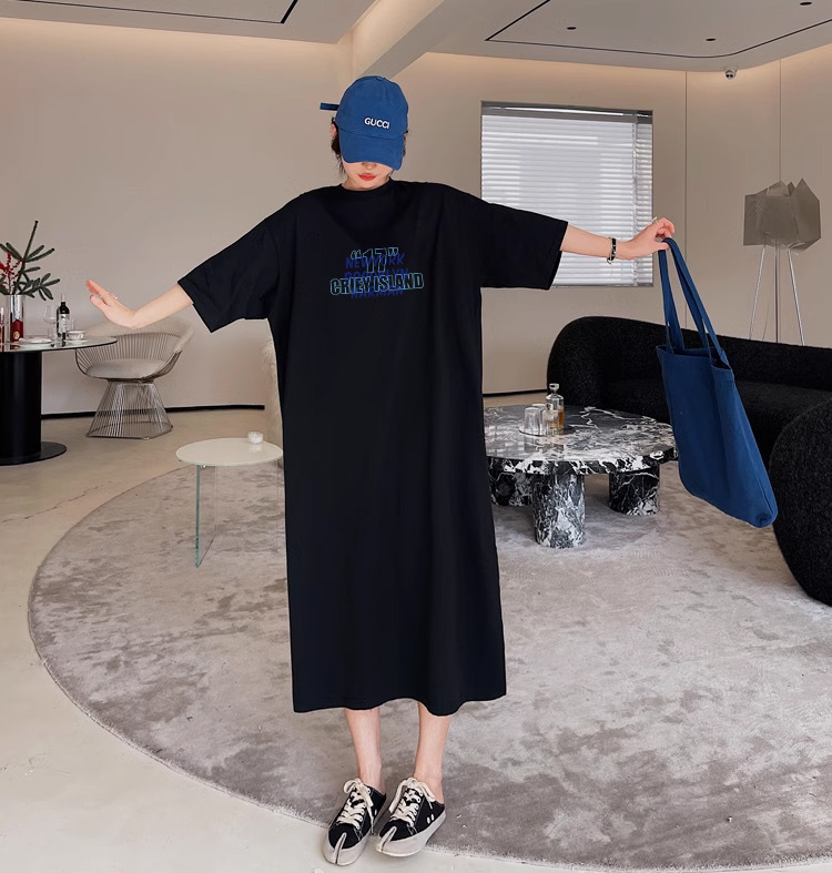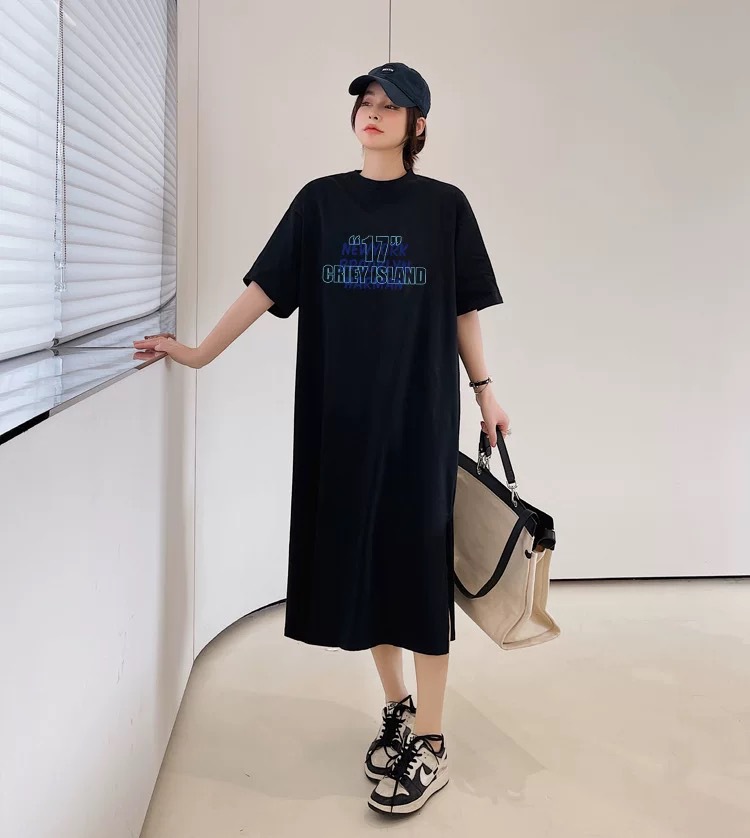 코튼 같은 우유 실크 # 여름 반팔 중간 길이 스플릿 티셔츠 원피스 여성용 한국식 게으른 스커트스토어 가기