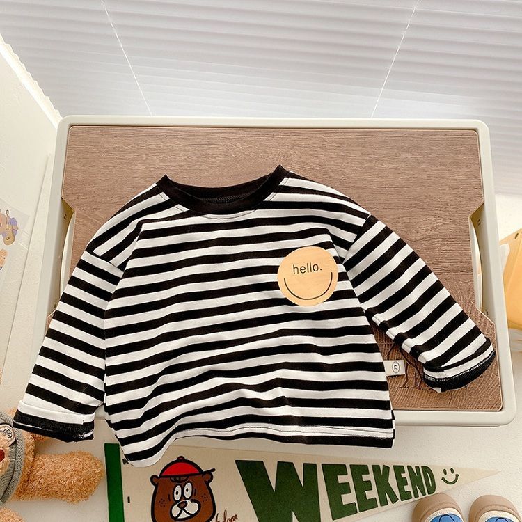 25 봄 가을 신상 남녀 아동용 면 스트라이프 스마일 프린트 아기 긴팔 티셔츠 루즈핏 유아용 이너웨어 상의스토어 가기