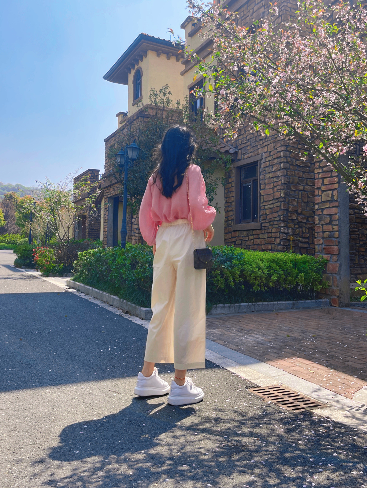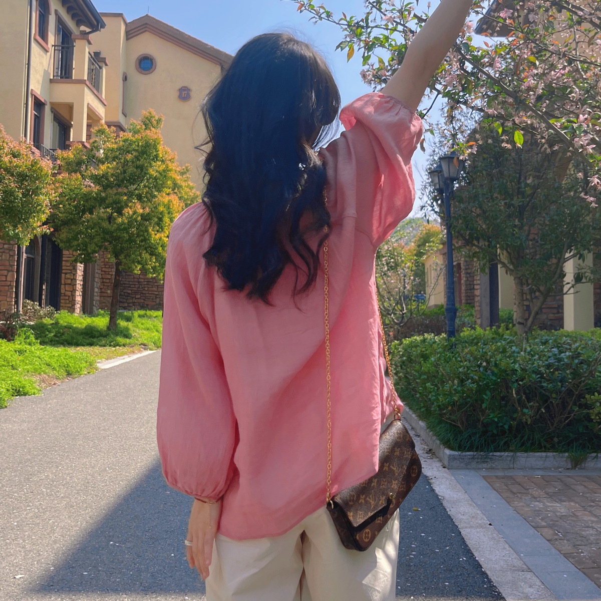 화이트 파우더! 염색 된 자연스러운 강한 트위스트 100 조각 암호화 Ramie 8 쿼터 소매 라운드 넥 셔츠 여성의 느슨한 여름