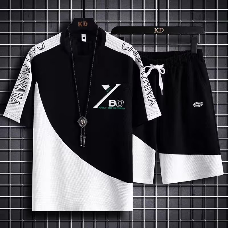 와플 캐주얼 세트 남자 여름 청소년 플러스 사이즈 남자 스포츠 반팔 반바지 1/2 개 세트