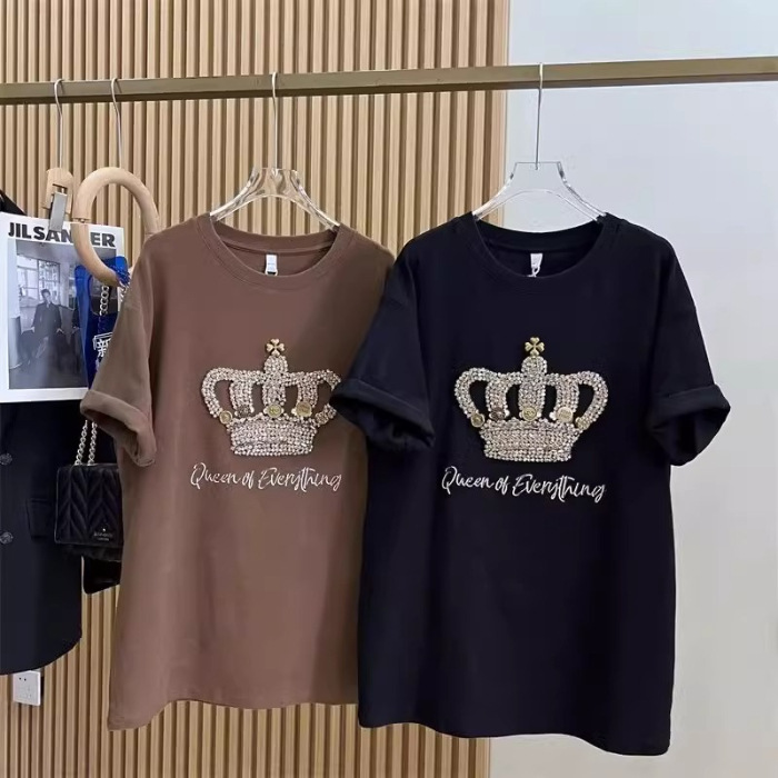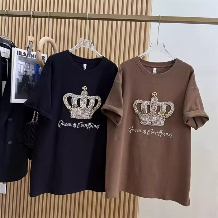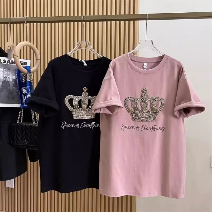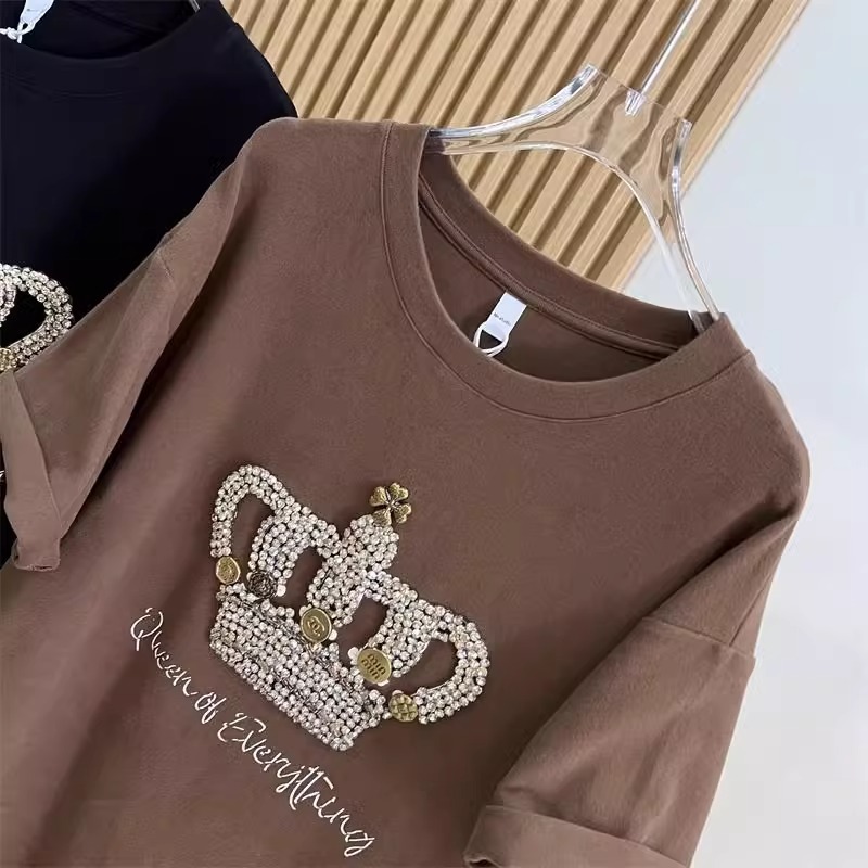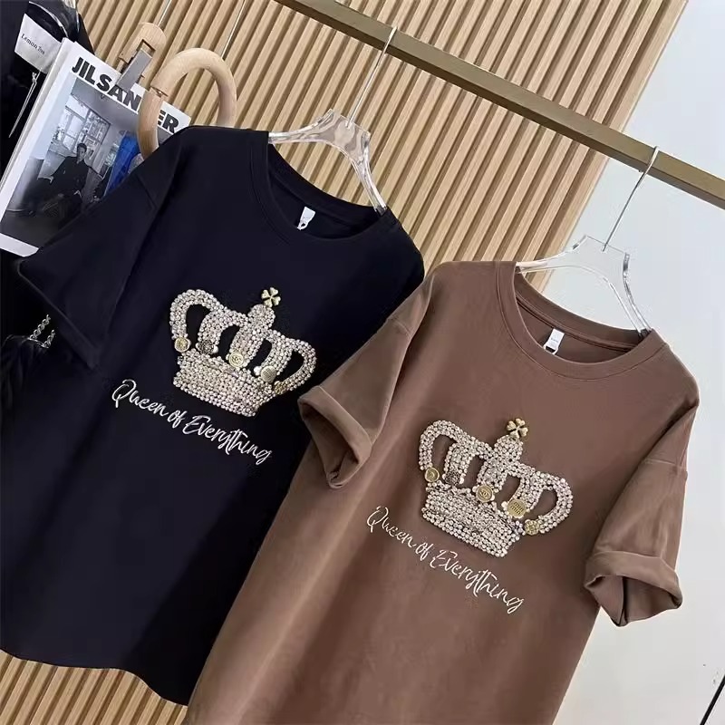 1.00 kg-150.00 kg 통통녀 초대형 여름 무거운 자수 크라운 반팔 티셔츠 여성베이스 셔츠 느슨한 연령 감소 탑