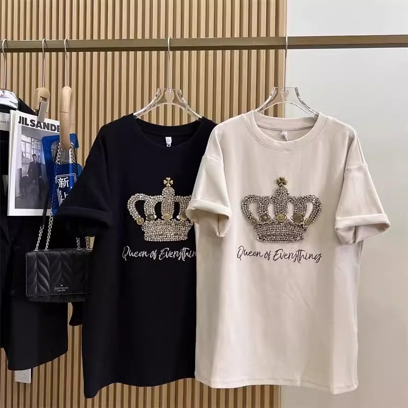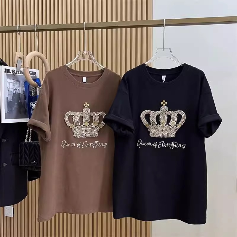 1.00 kg-150.00 kg 통통녀 초대형 여름 무거운 자수 크라운 반팔 티셔츠 여성베이스 셔츠 느슨한 연령 감소 탑스토어 가기