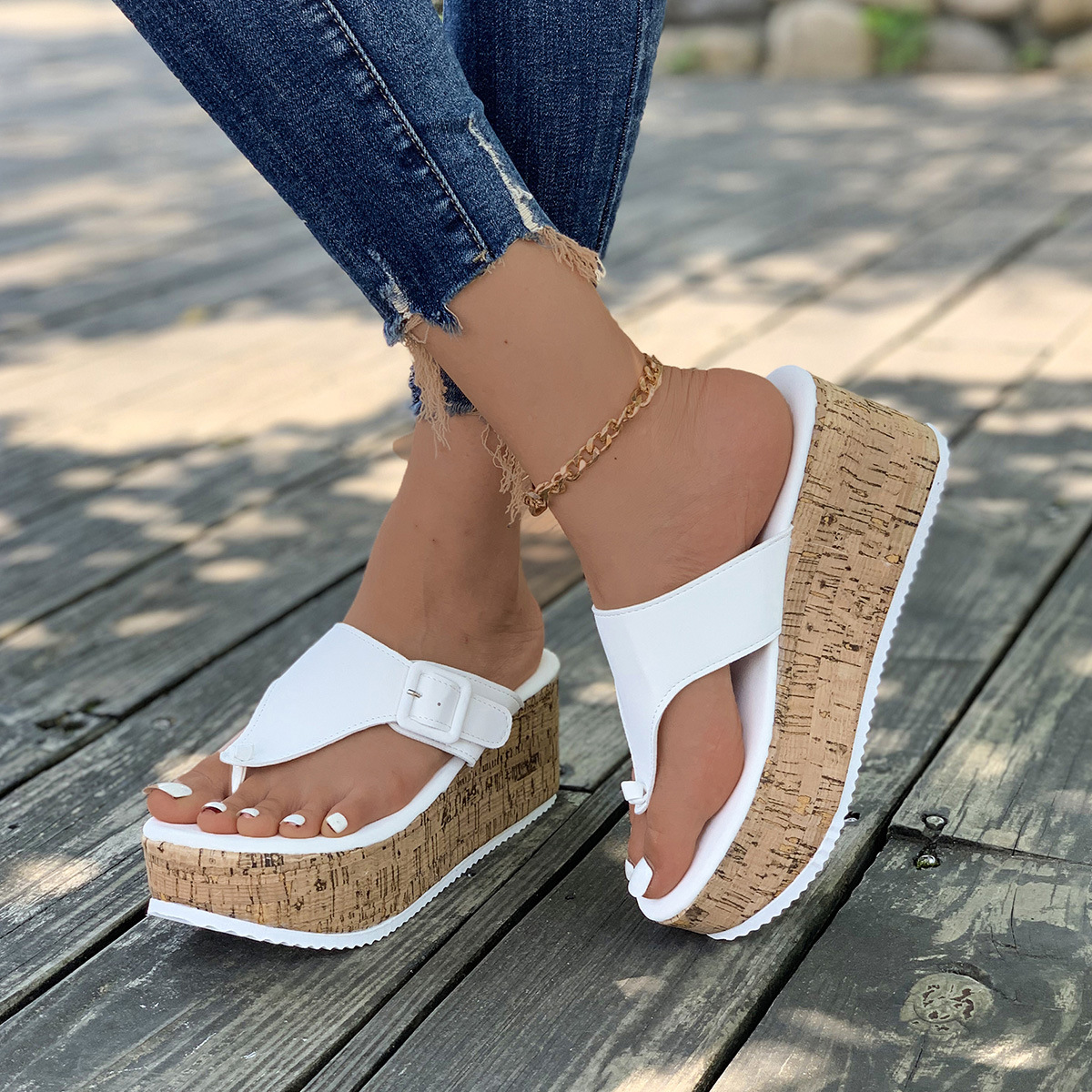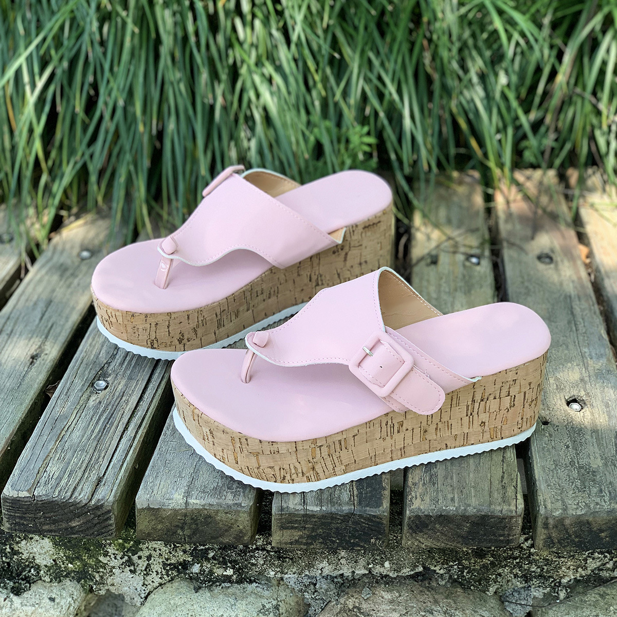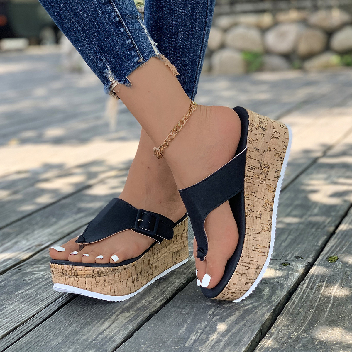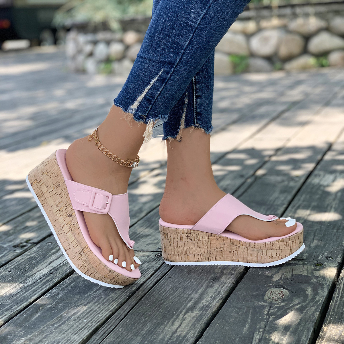 2023 새로운 대형 클램프 Toe 솔리드 컬러 두꺼운 슬리퍼 국경 독립 스탠드 웨지 여성용 버클 피쉬 입 플립 플롭스토어 가기