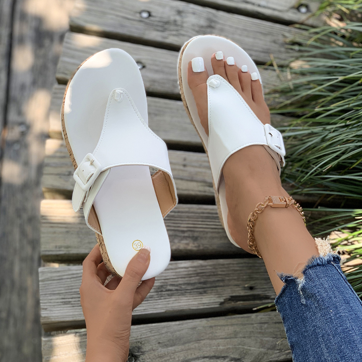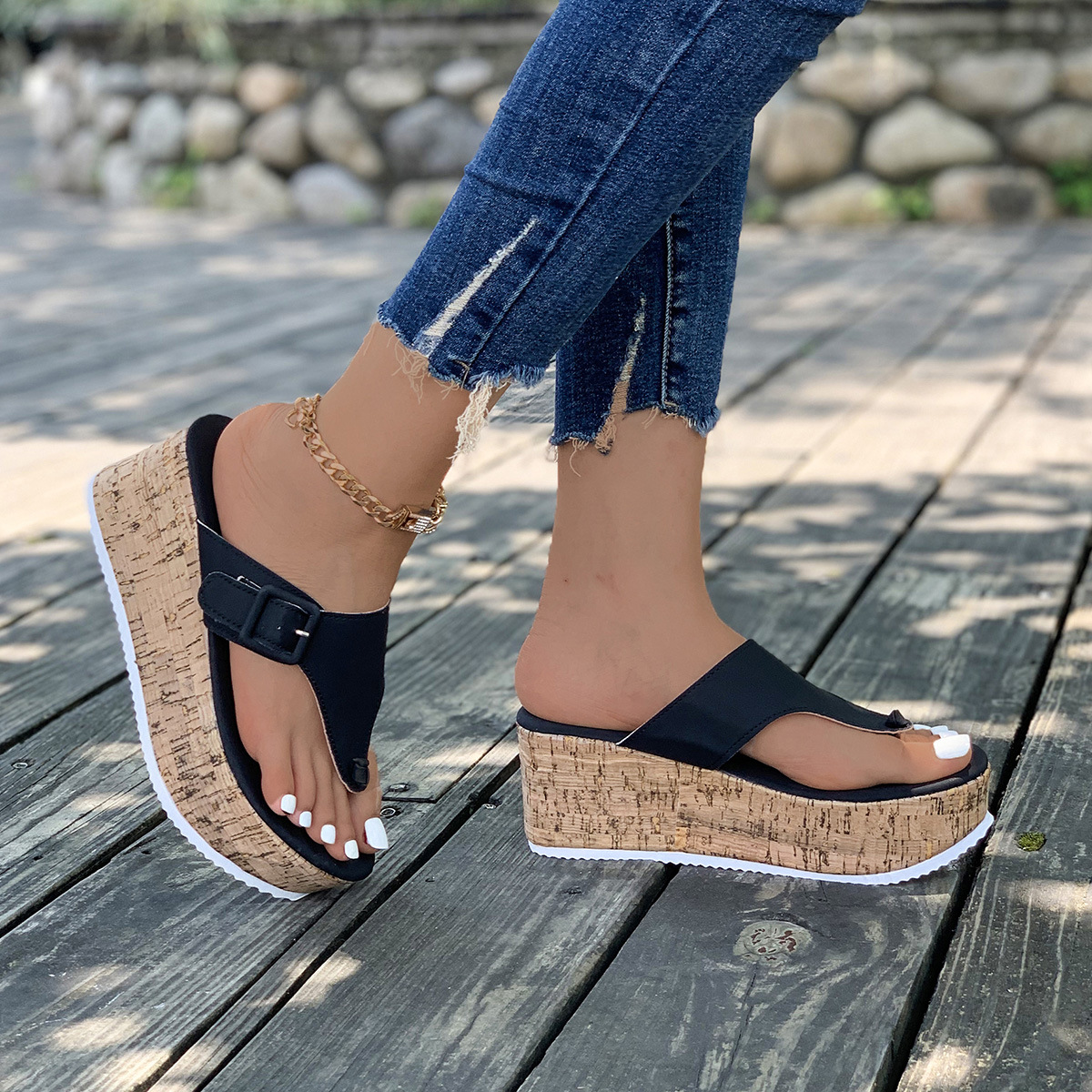 2023 새로운 대형 클램프 Toe 솔리드 컬러 두꺼운 슬리퍼 국경 독립 스탠드 웨지 여성용 버클 피쉬 입 플립 플롭