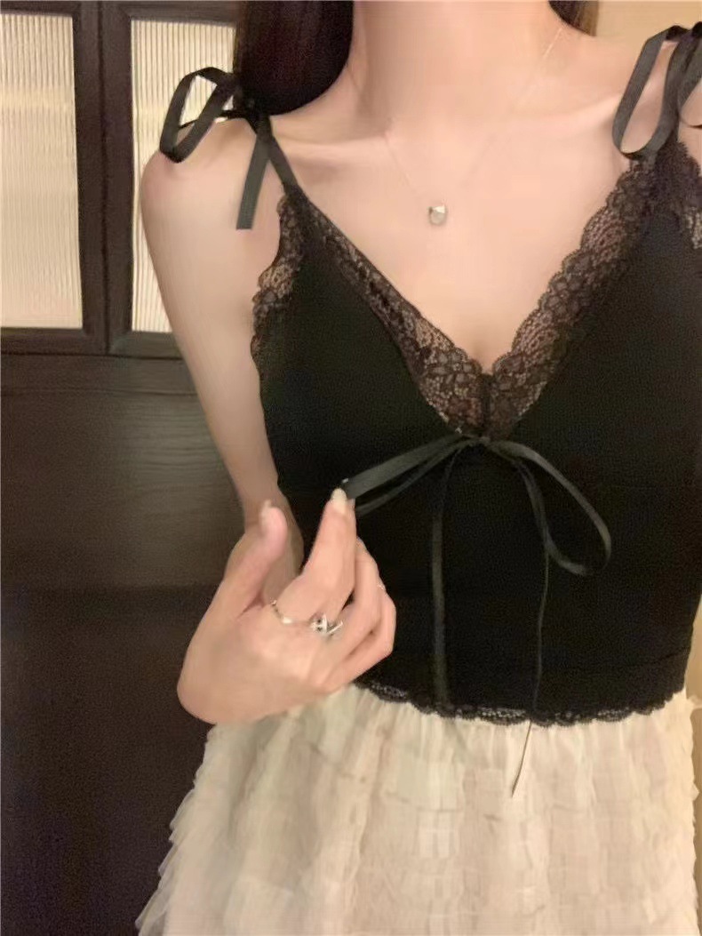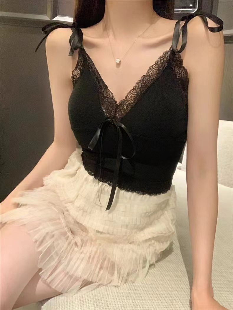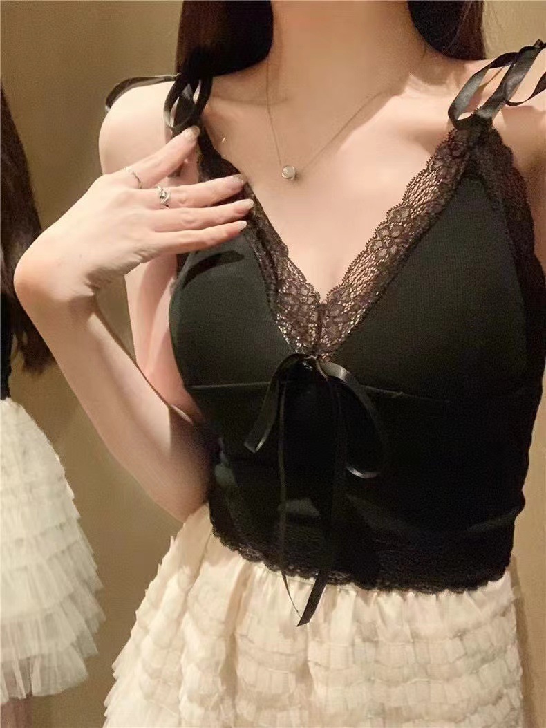 2024 새로운 순수한 욕망 스타일 레이스 스티칭 캐미솔 여성의 봄과 여름 나비 레이스 업 내부 짧은 탑