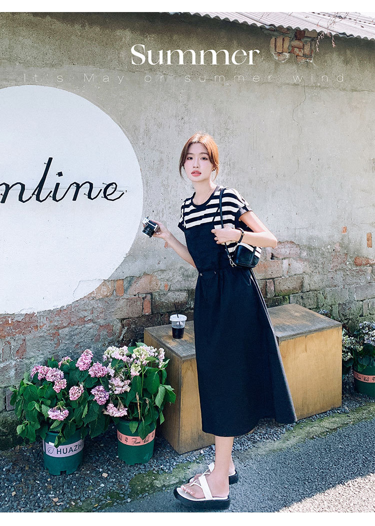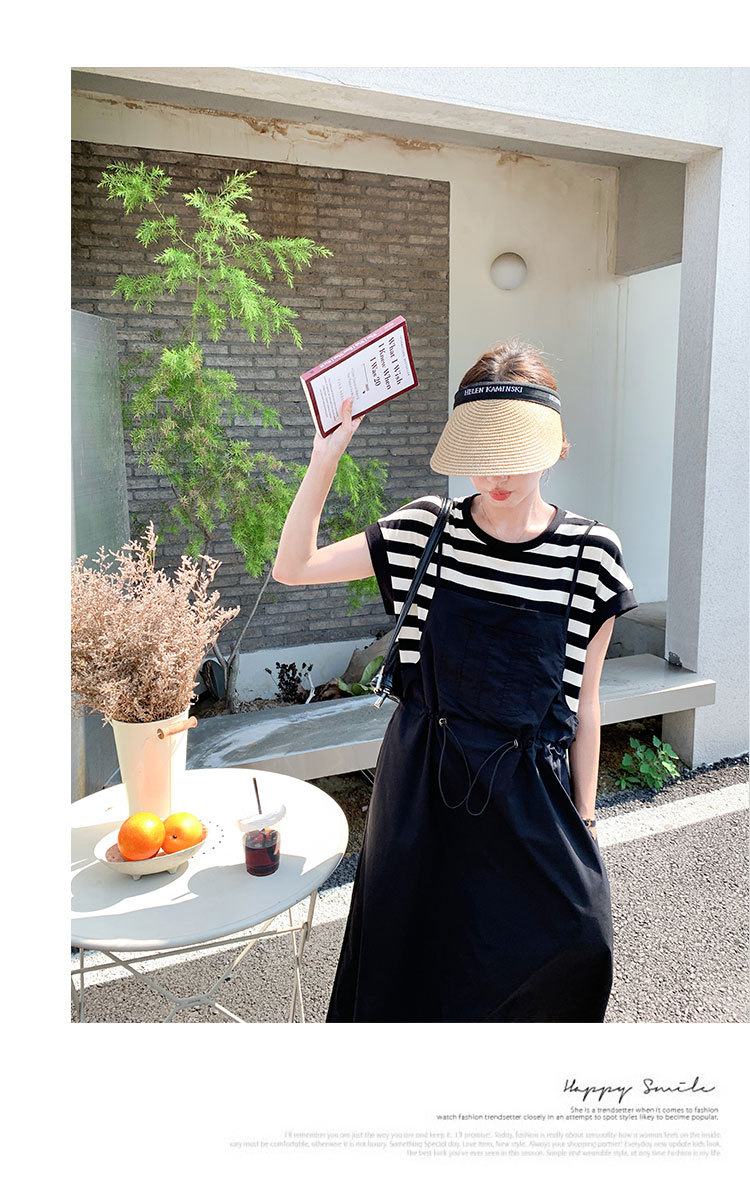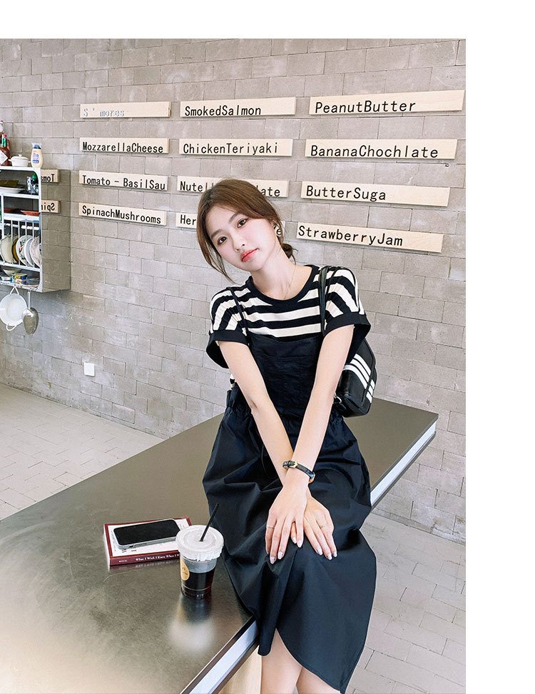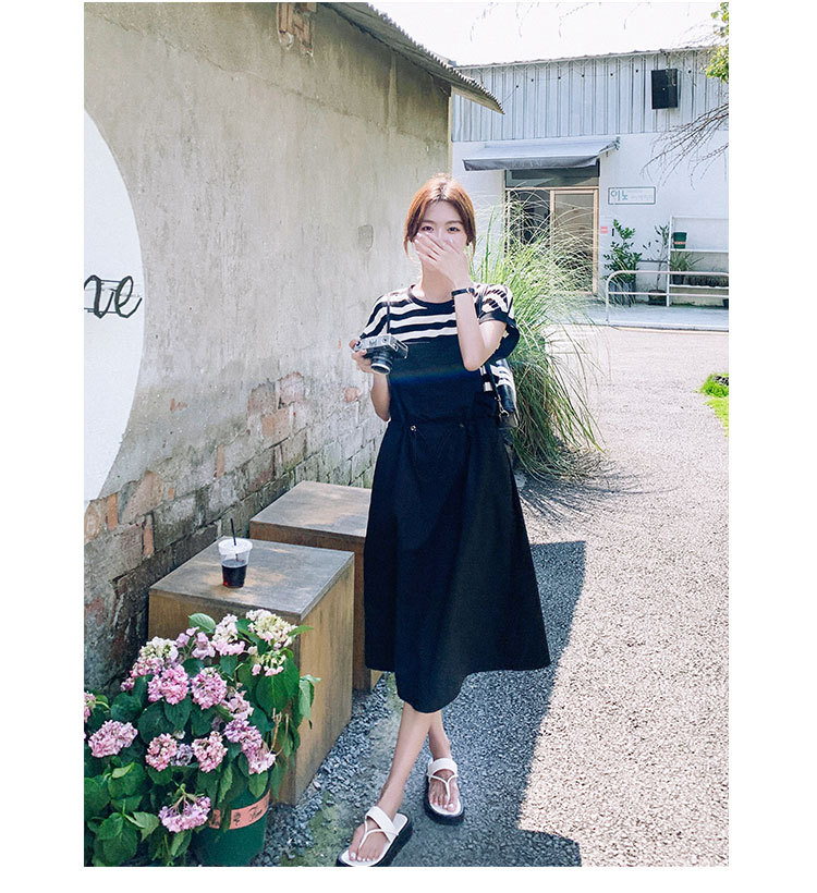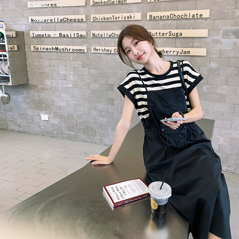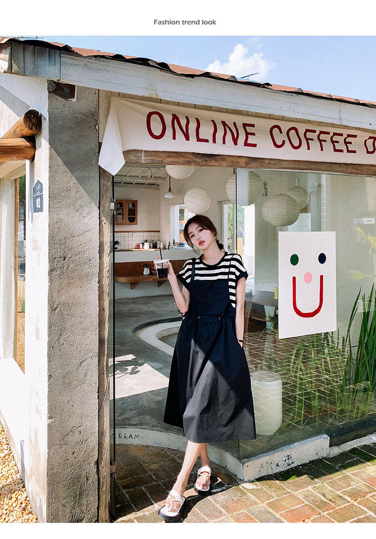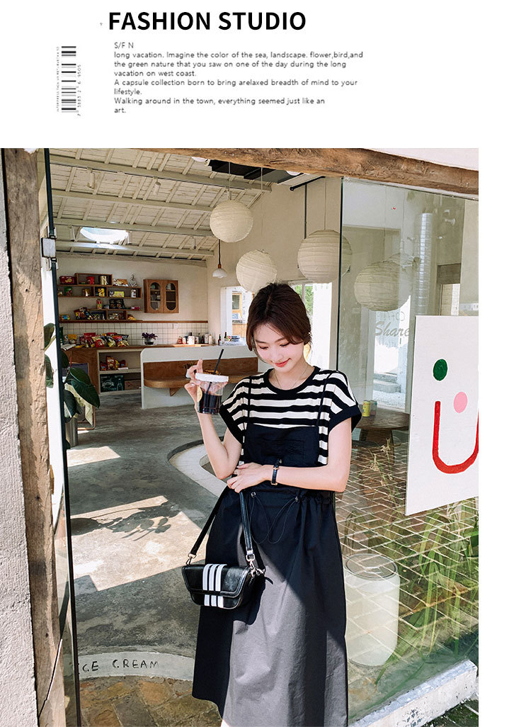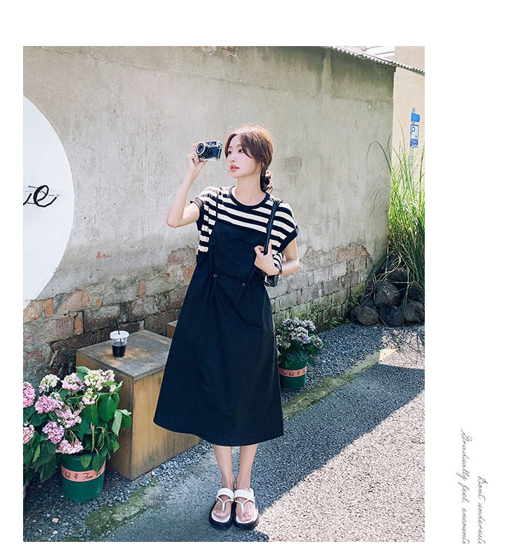 검은 가짜 투피스 원피스 여성 여름 프랑스 패션 캐주얼 독특한 세련된 디자인 줄무늬 티셔츠 원피스스토어 가기