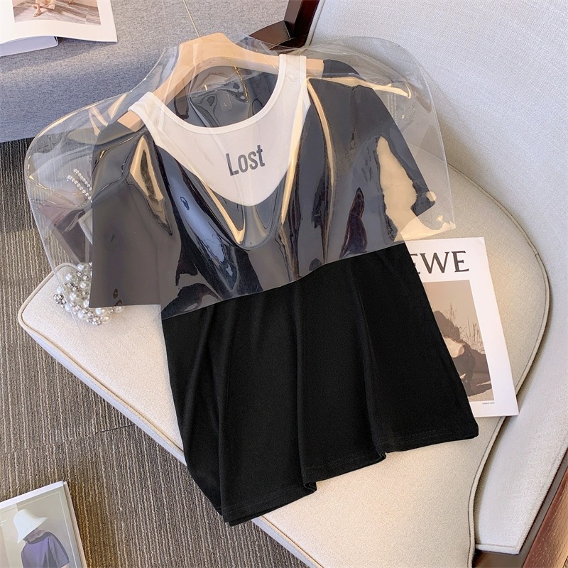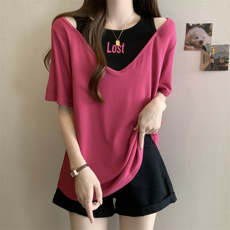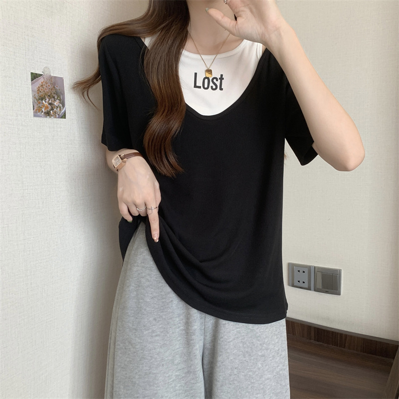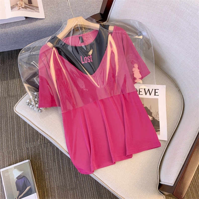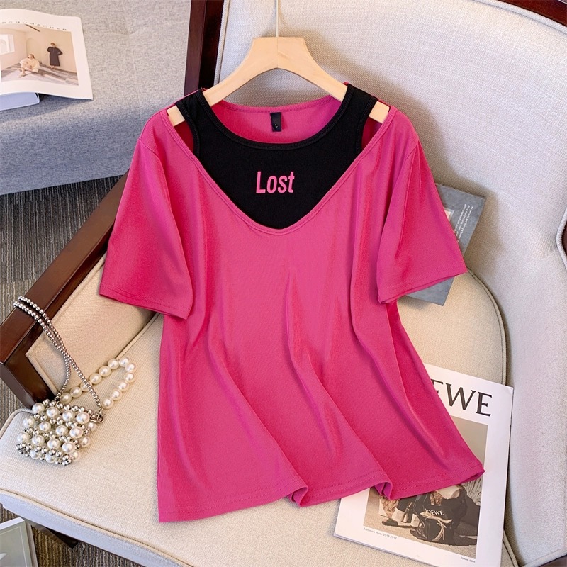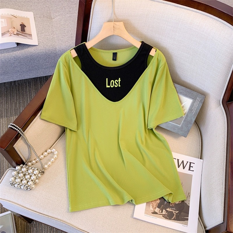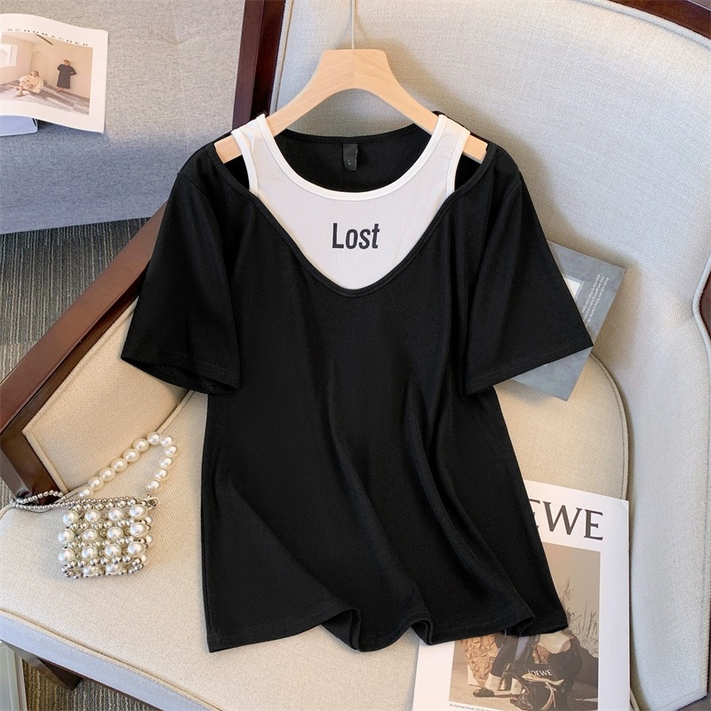 대형 여성 의류 여름 새로운 서양식 하이 엔드 반팔 티셔츠 여성용 가짜 투피스 디자인 센스 루즈 슬리밍 탑 여성