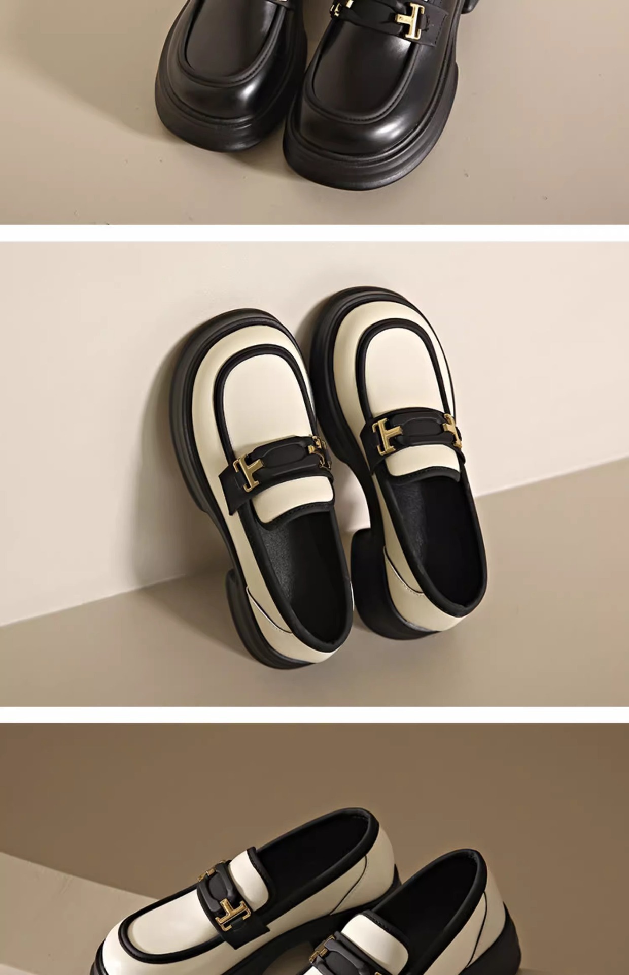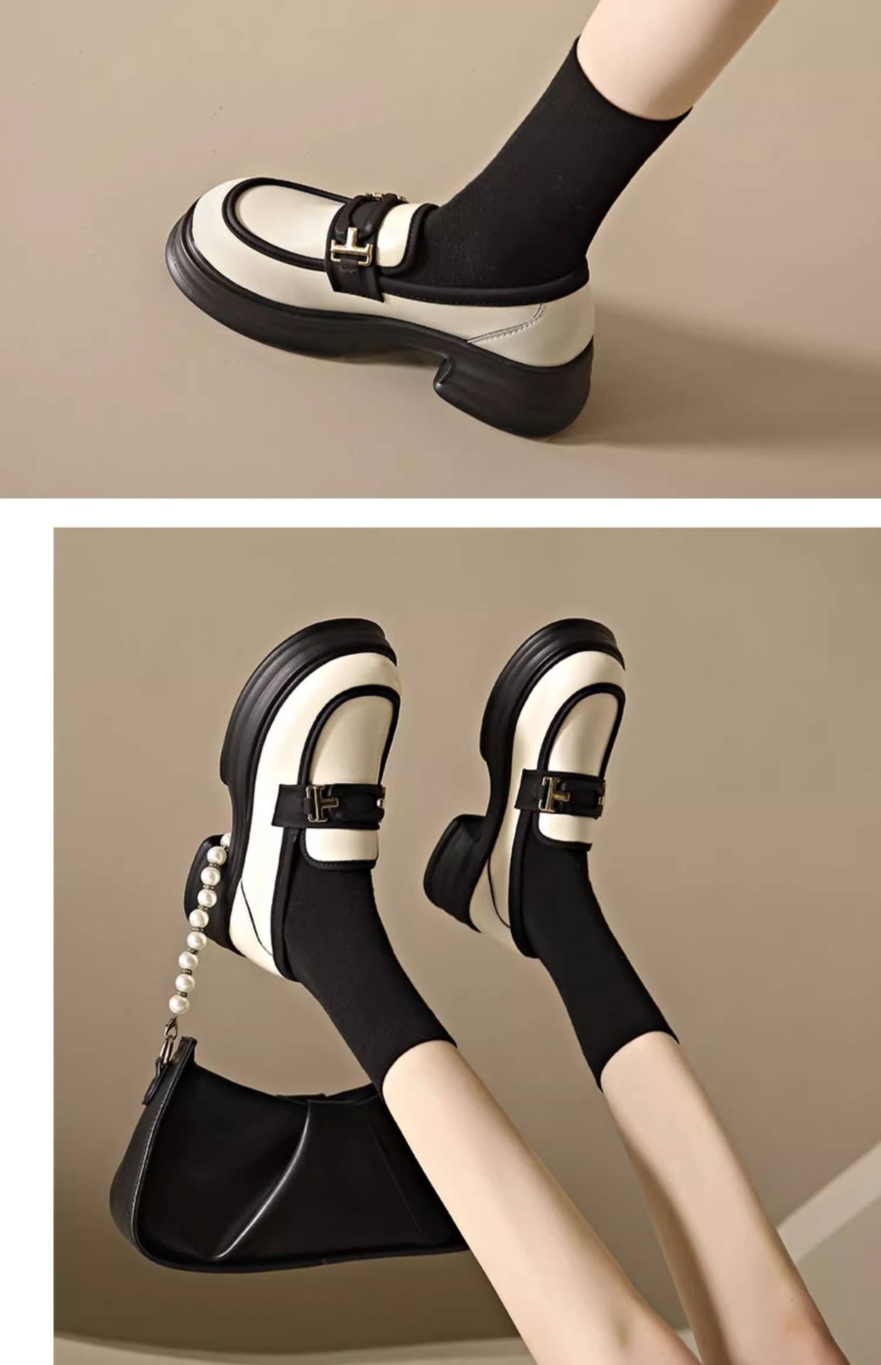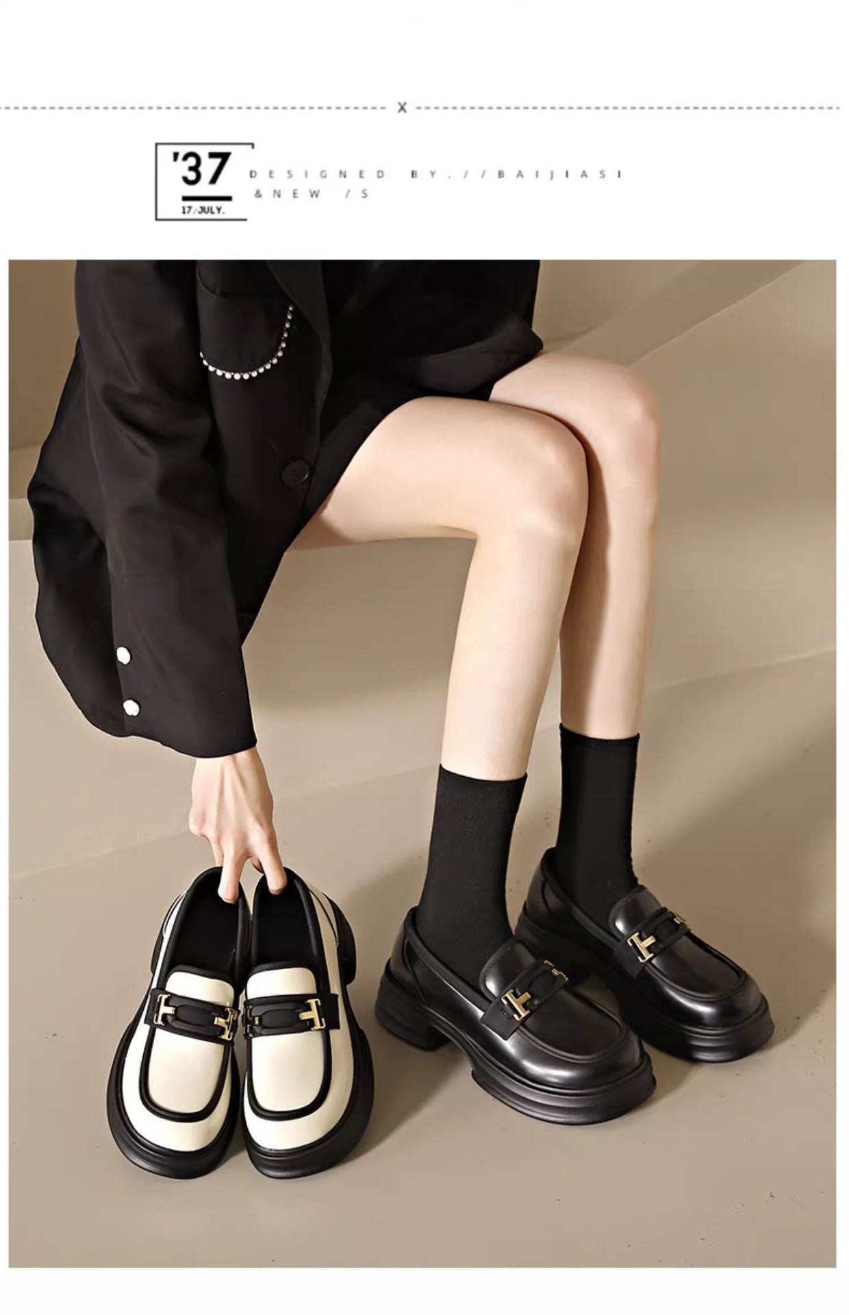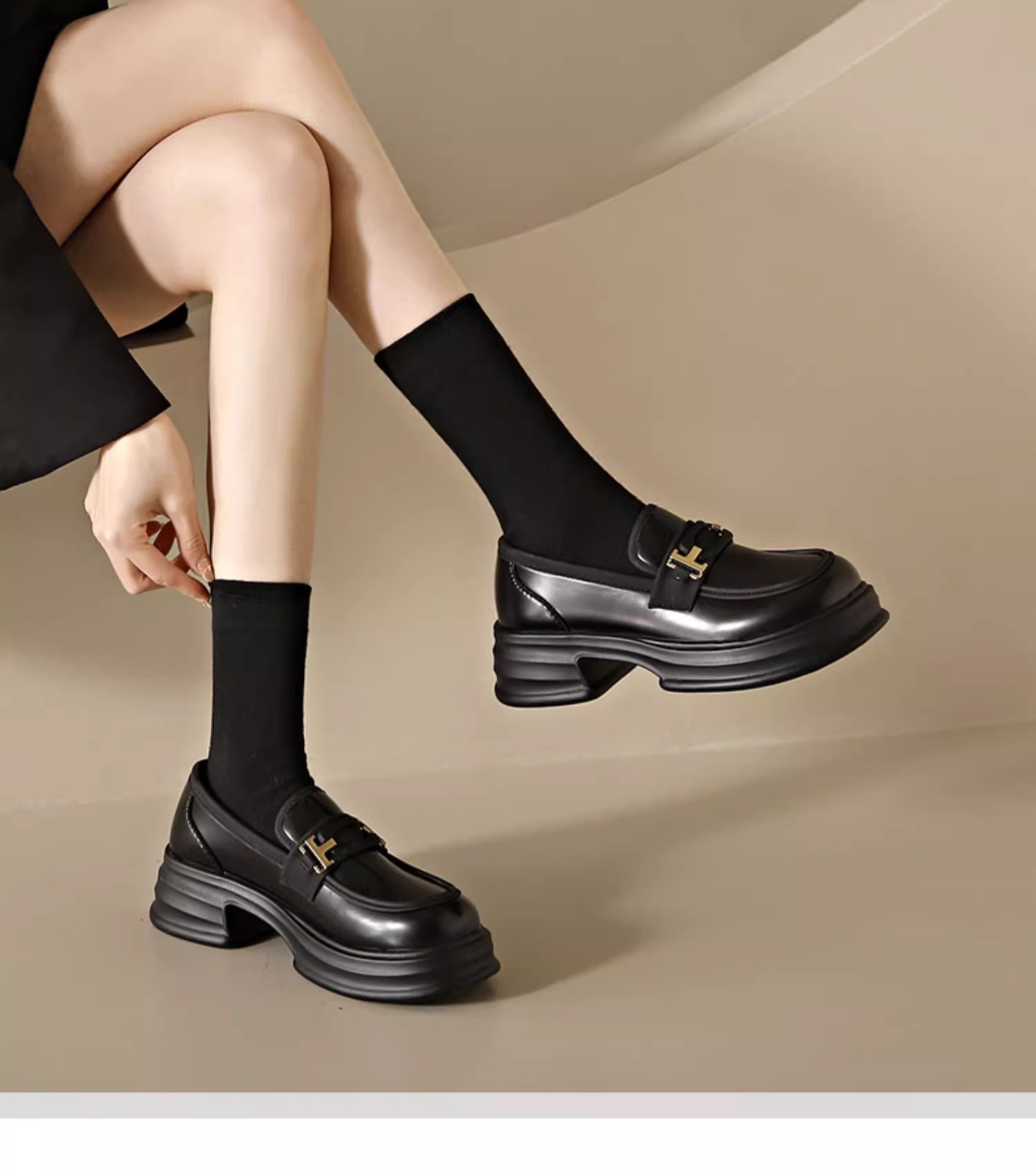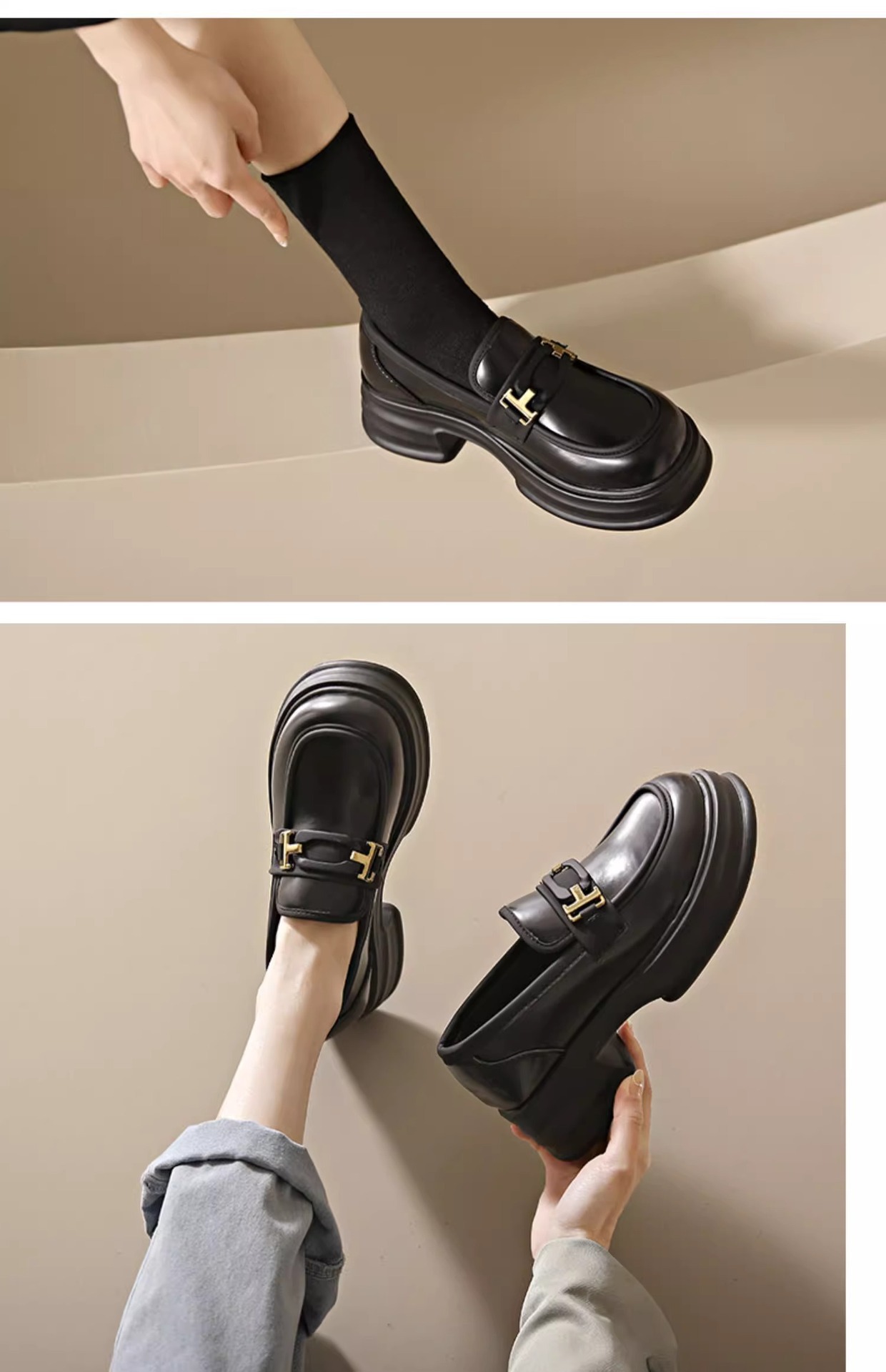 Qi Le 2024 새로운 봄과 여름 두꺼운 힐 패션 라운드 헤드 슬립 온 작은 올 매치 캐주얼 로퍼 가죽 신발 여성