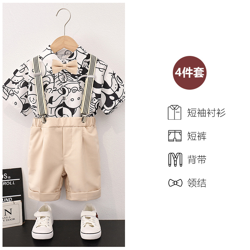 아동복 흑백 만화 반팔 셔츠 어린이 홍콩 스타일 스트랩 반바지 세트 새로운 스타일 더피 잘생긴 남자의 아기 꽃 셔츠