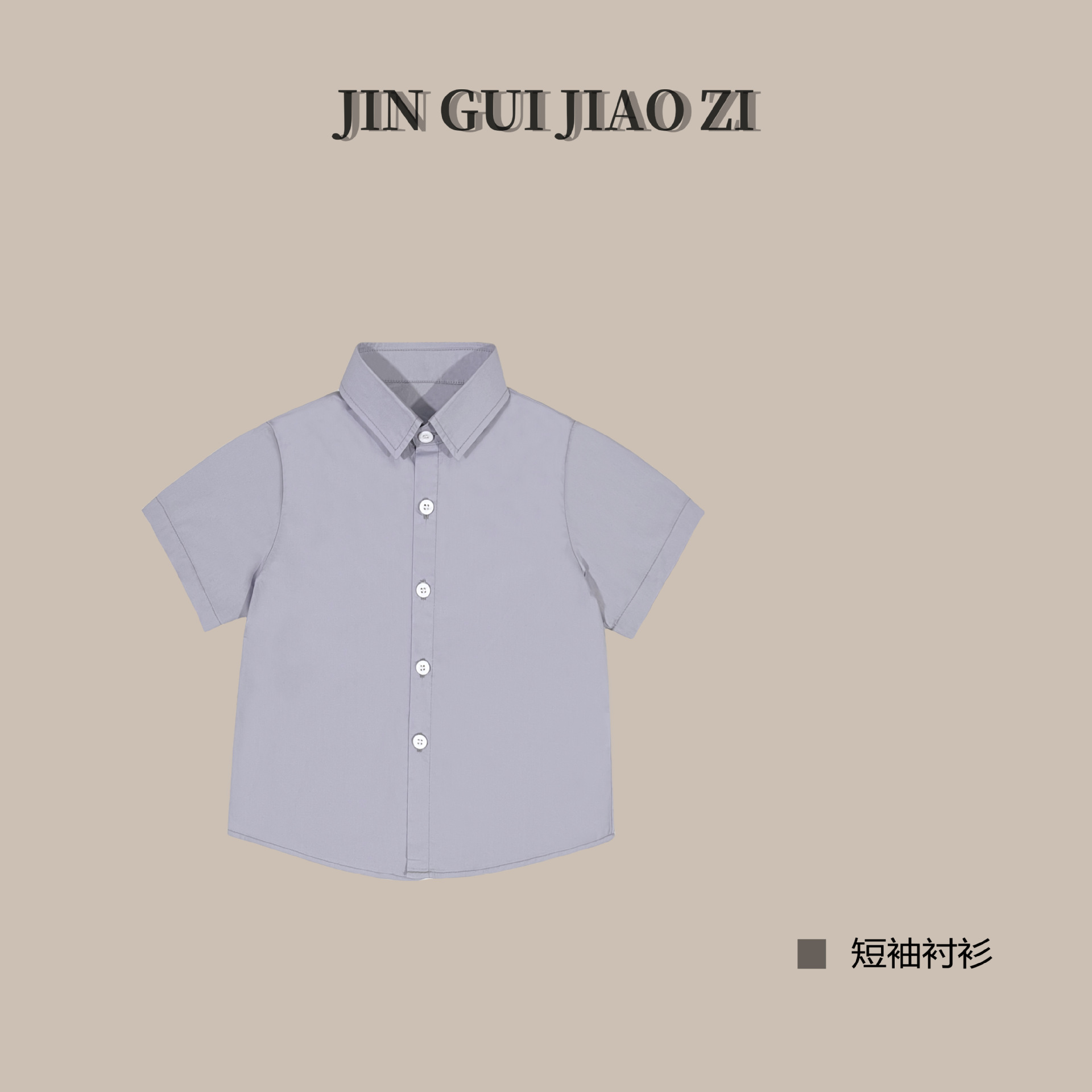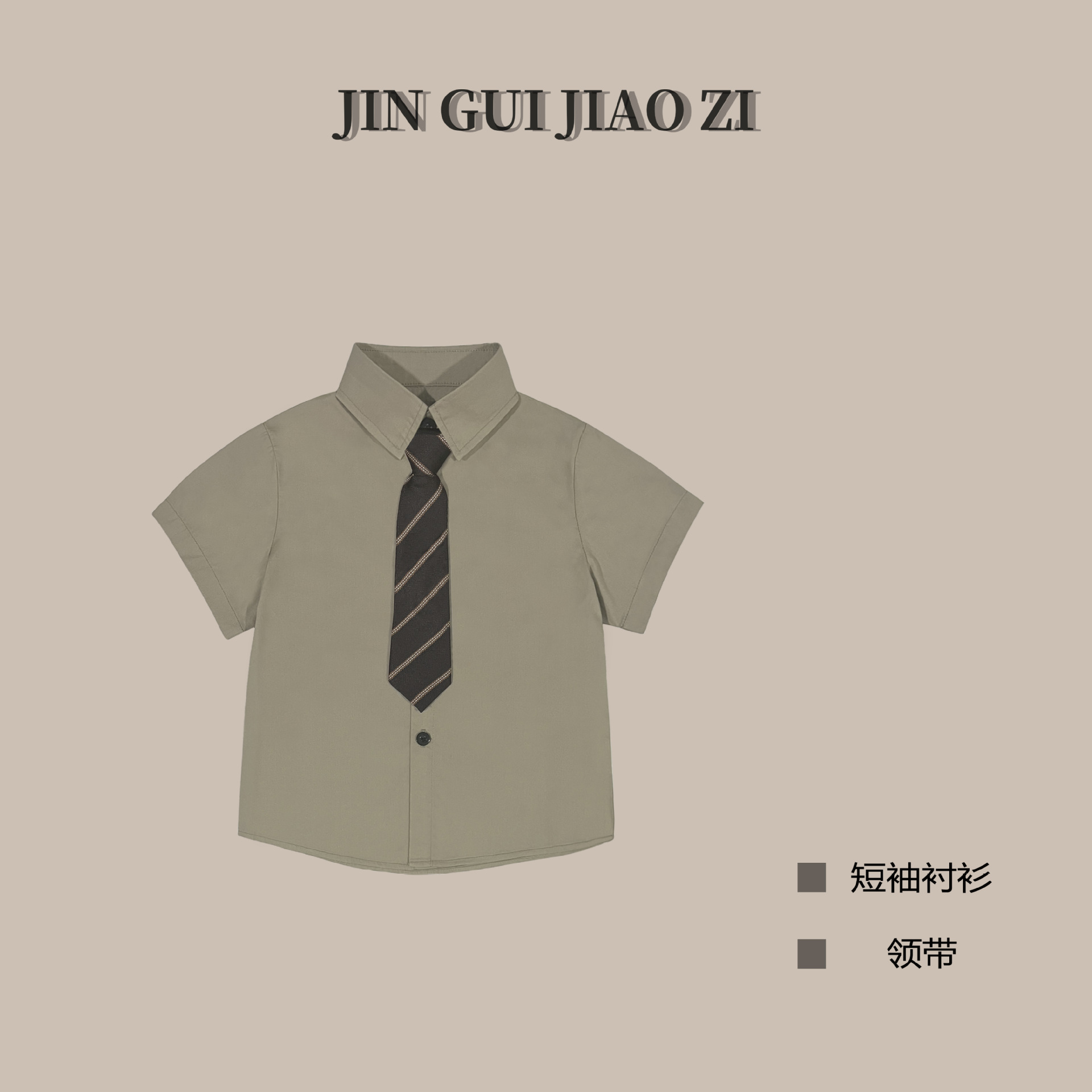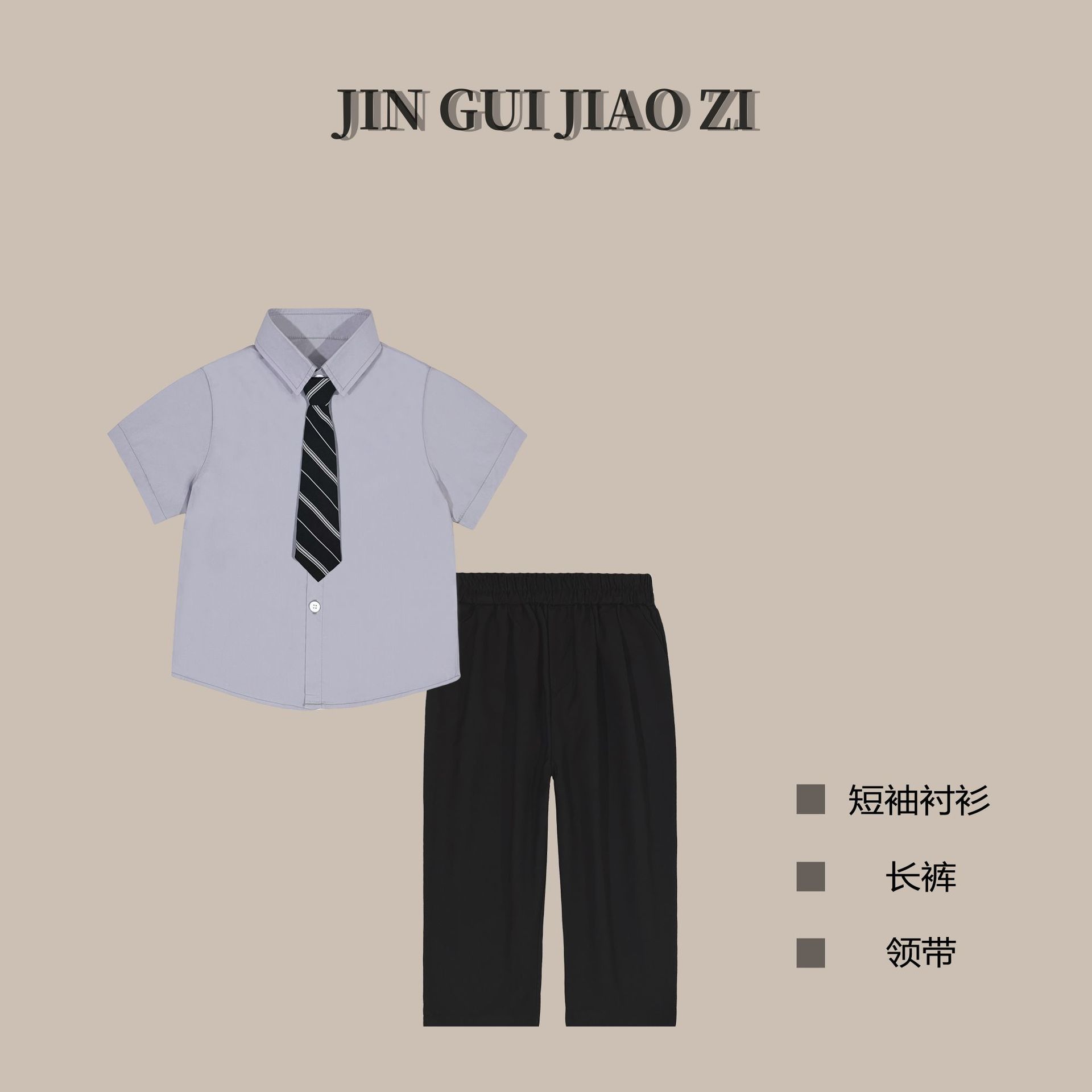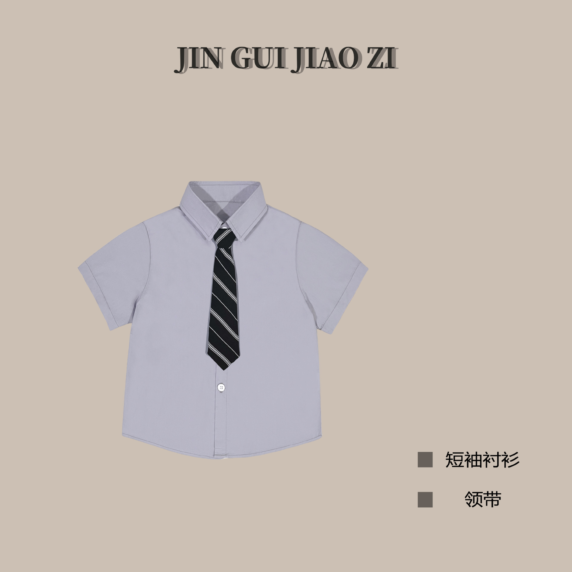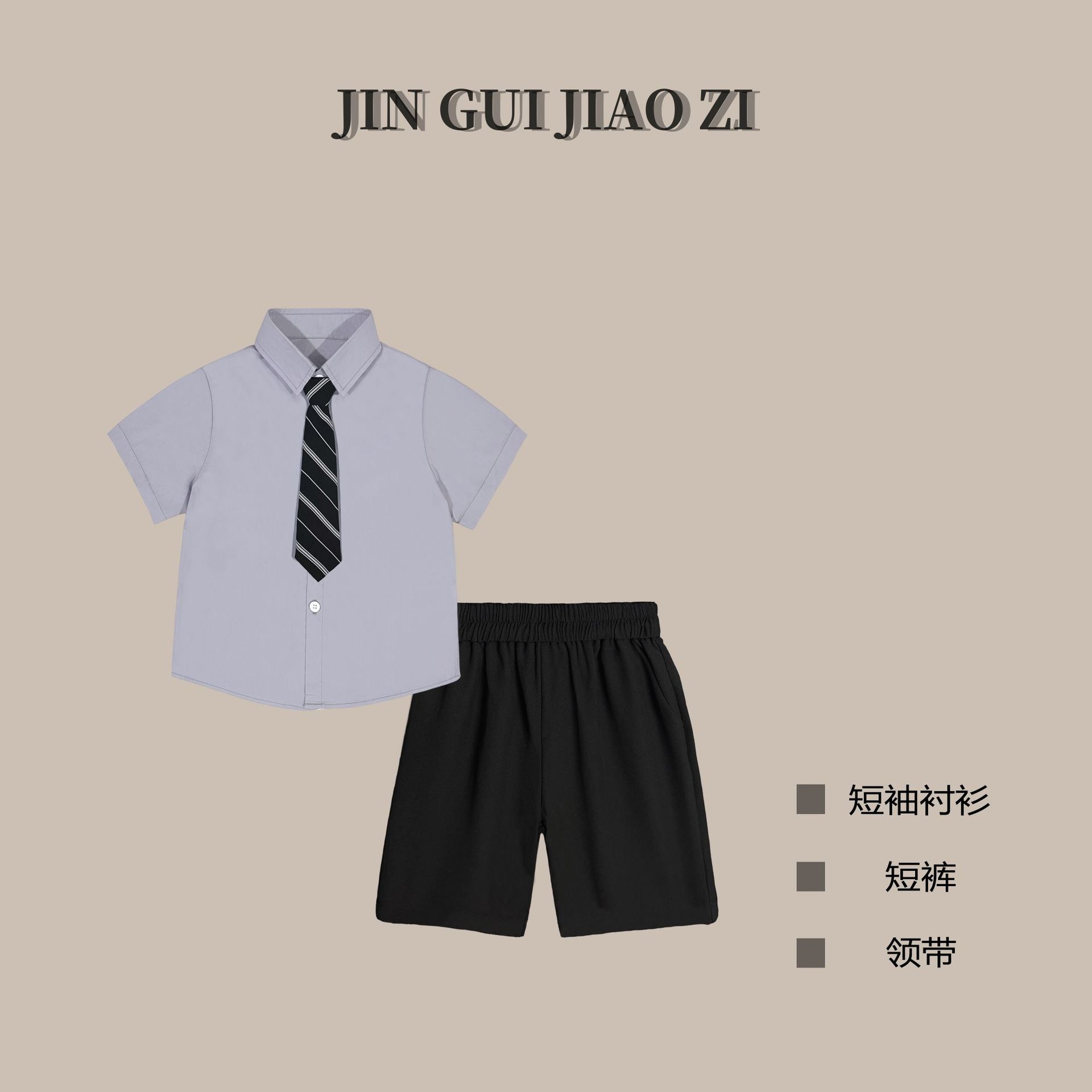 • 파란색 짧은 소매 셔츠 검은 반바지 흑백 줄무늬 넥타이