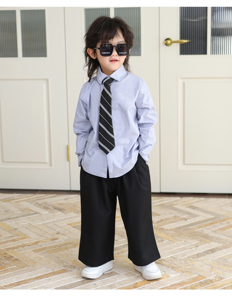 • 블루 긴 소매 셔츠 블랙 바지 흑백 줄무늬 넥타이