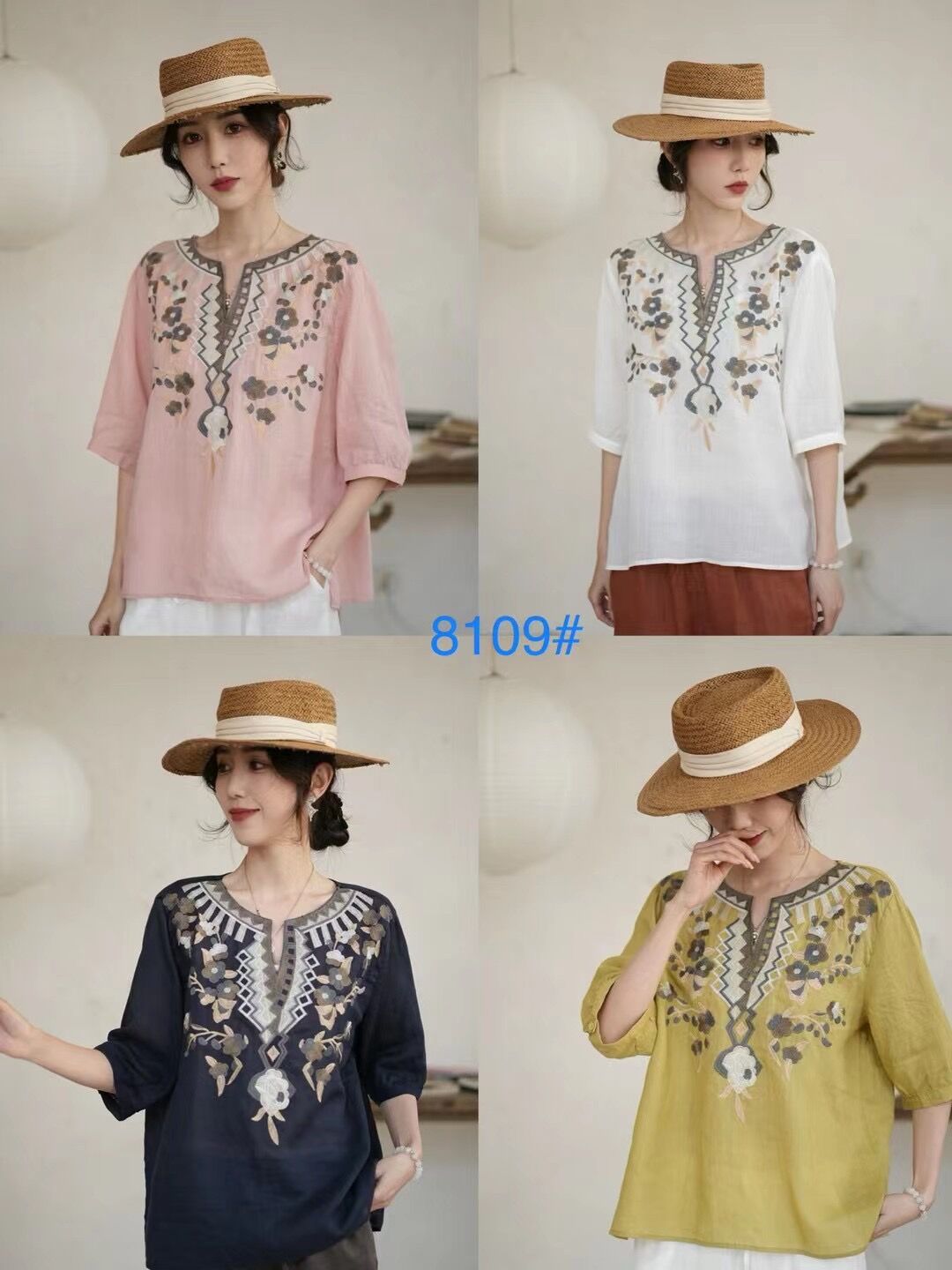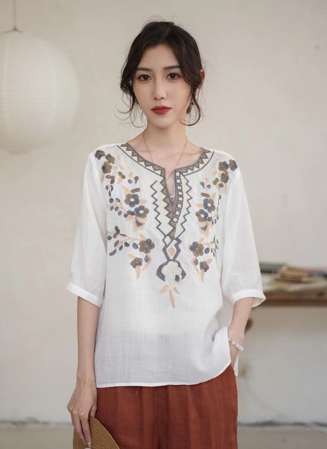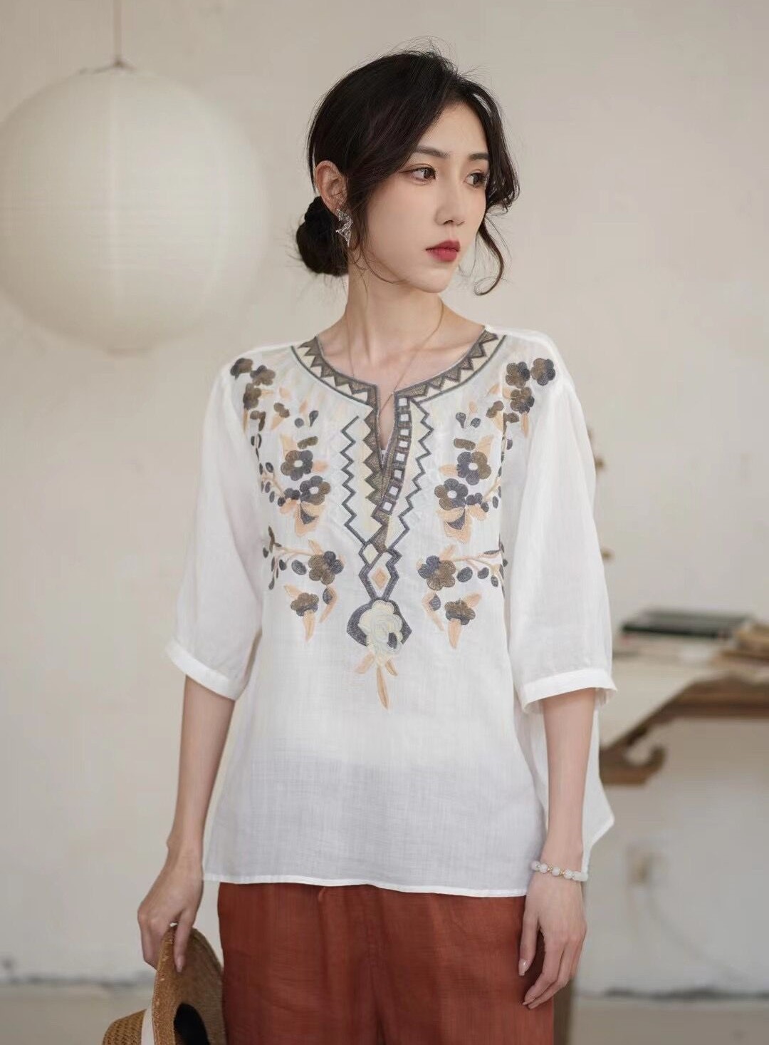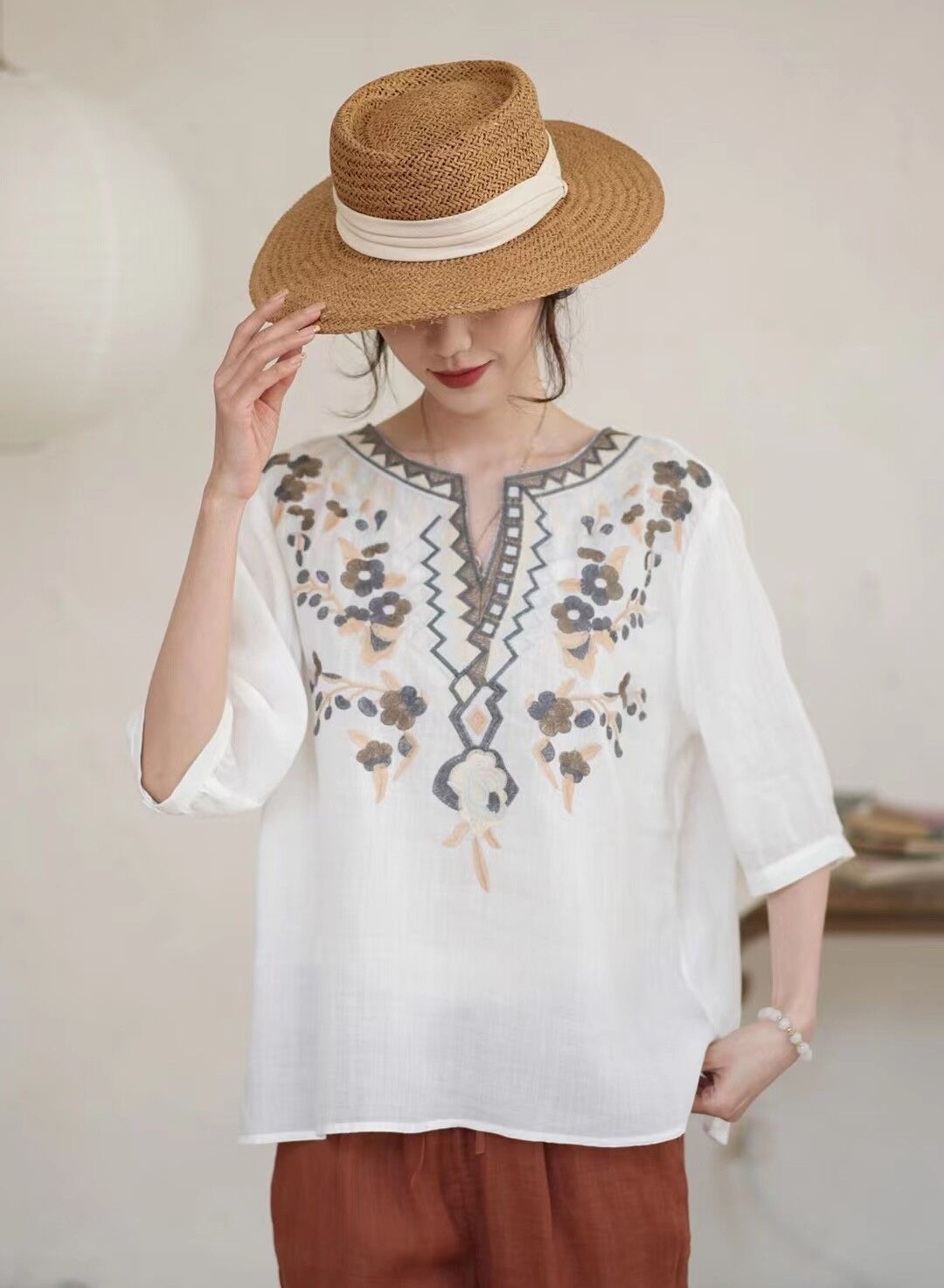 42 라미 작은 셔츠 2024 여름 새로운 V-목 풀오버 최고 여성의 예술적 복고풍 자수 셔츠 8109스토어 가기