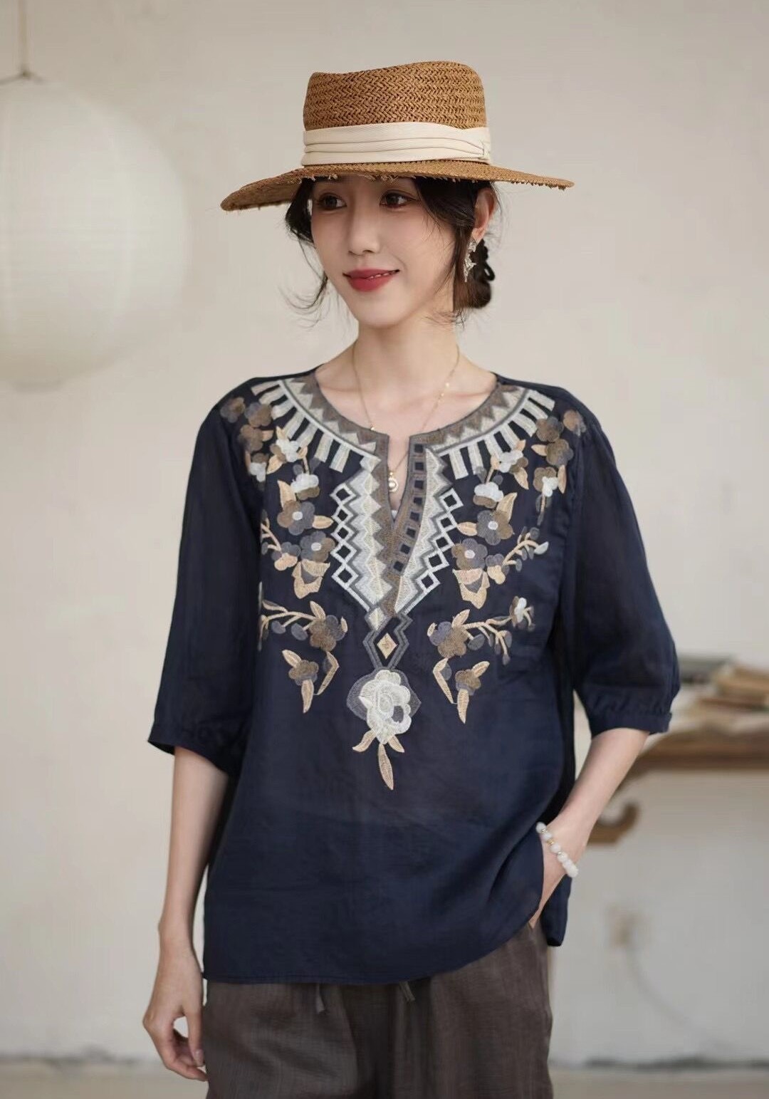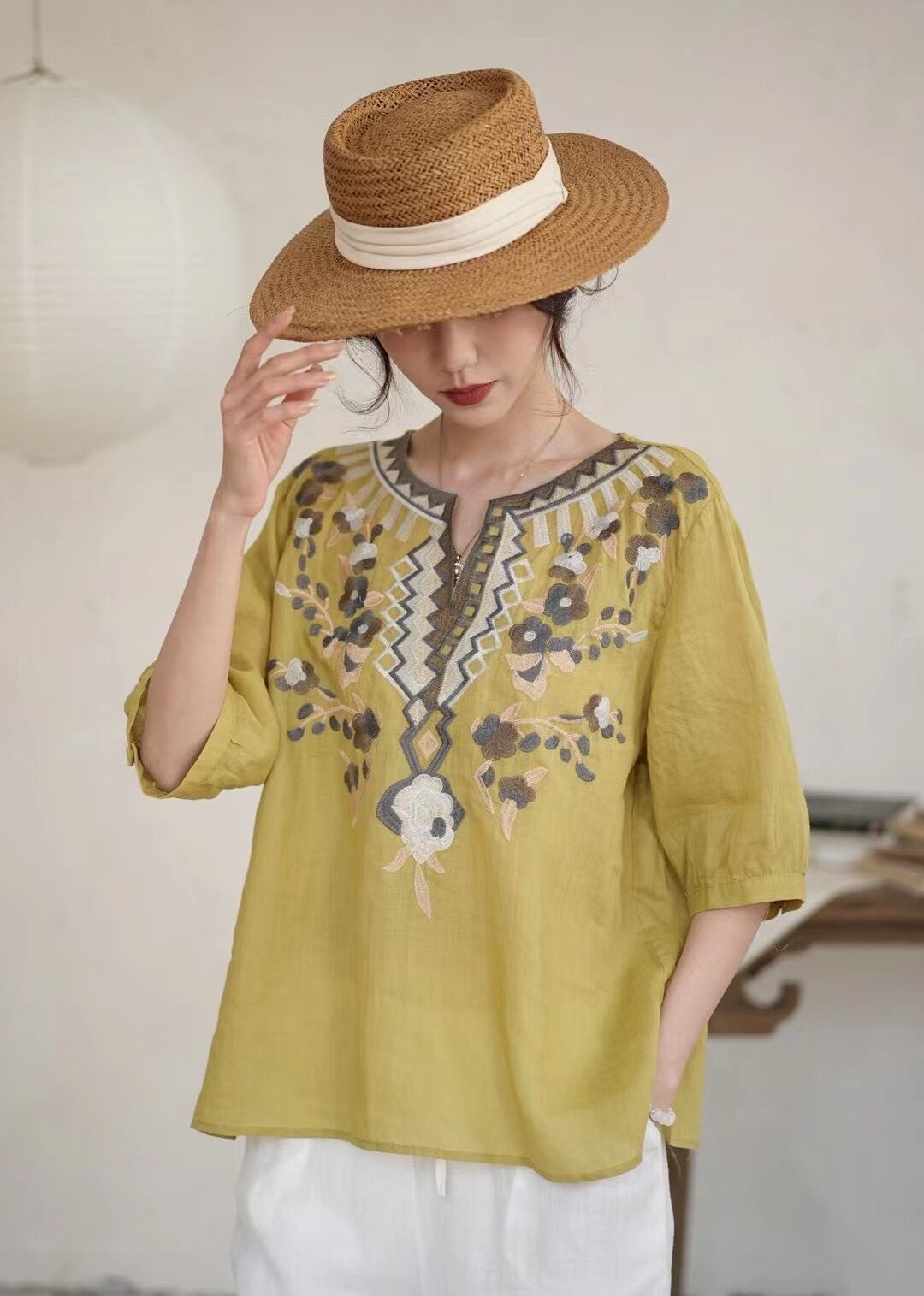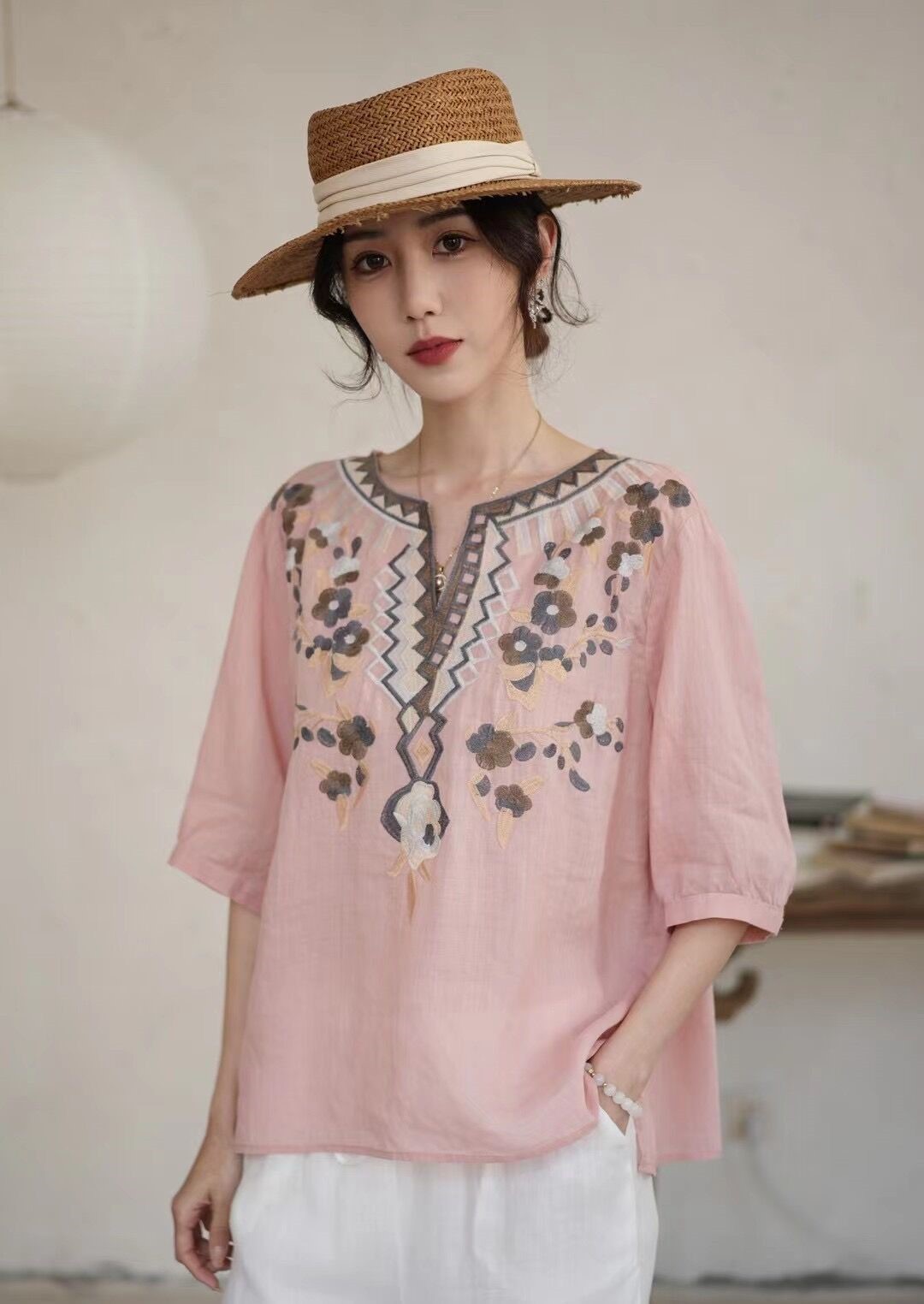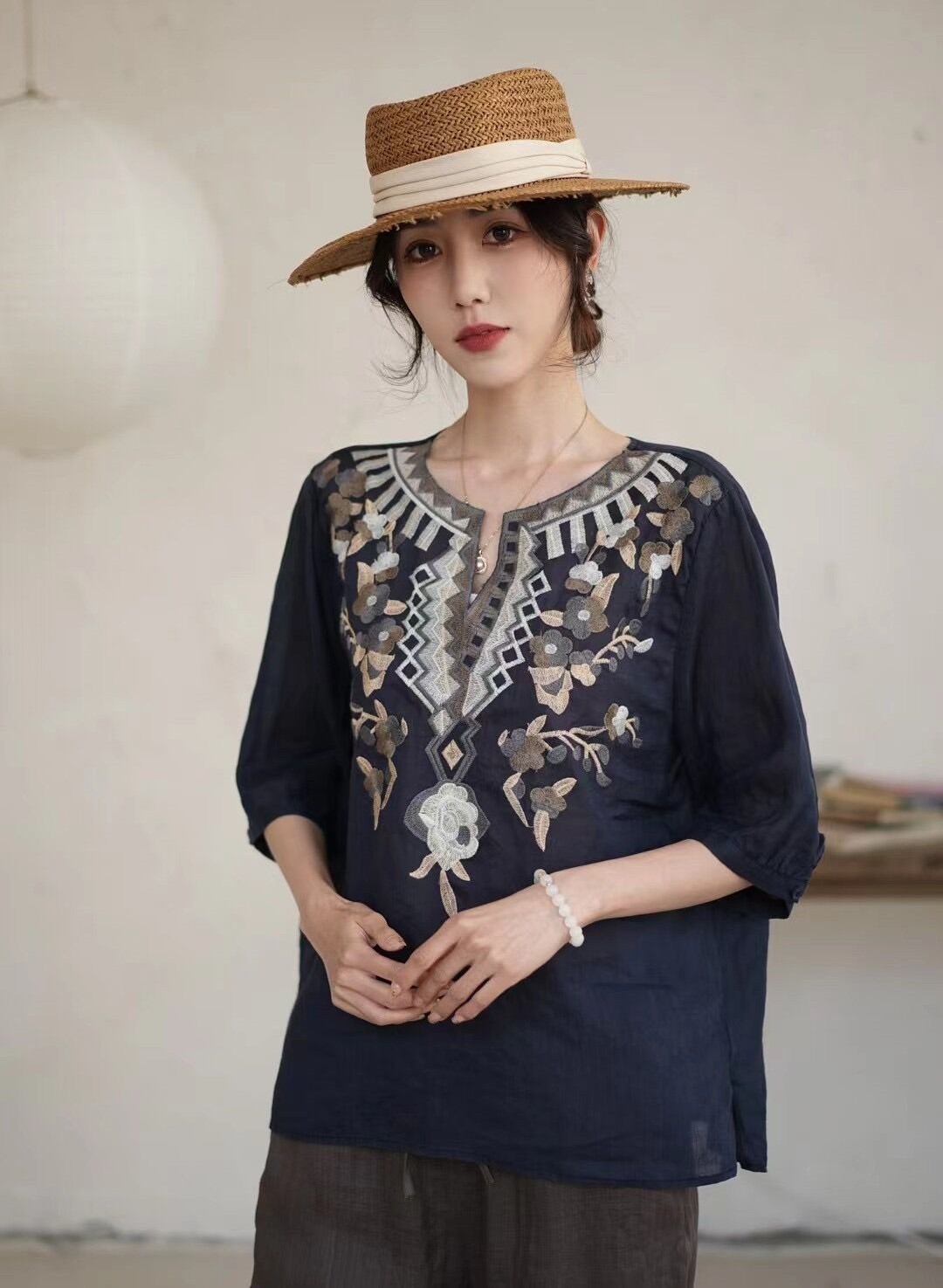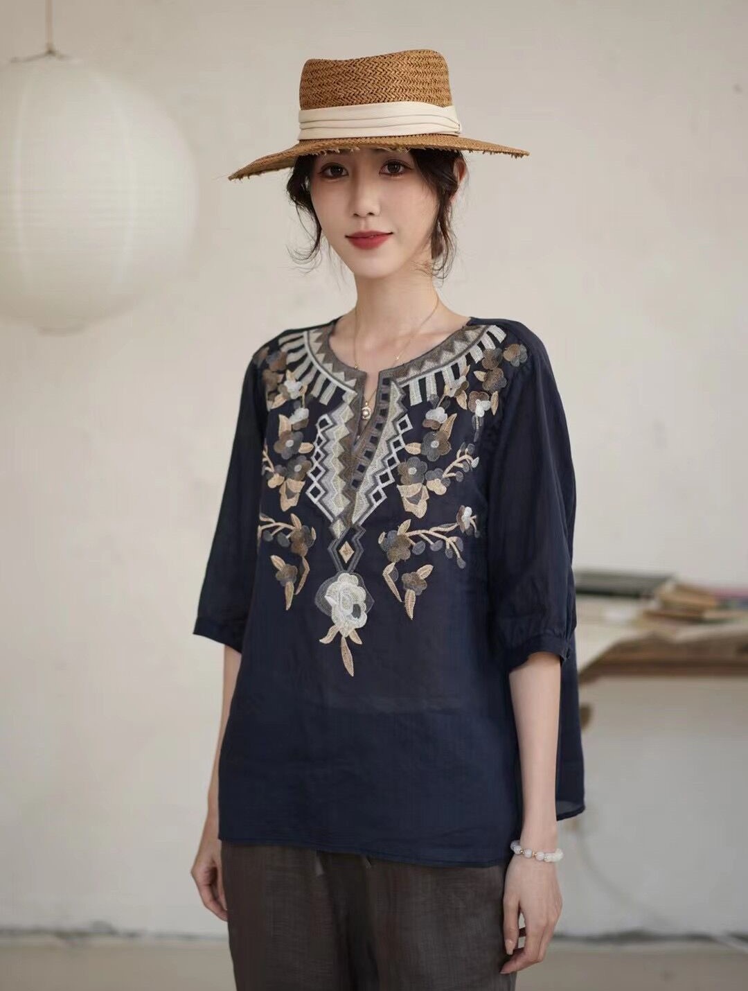 42 라미 작은 셔츠 2024 여름 새로운 V-목 풀오버 최고 여성의 예술적 복고풍 자수 셔츠 8109스토어 가기