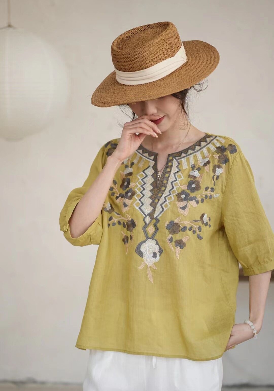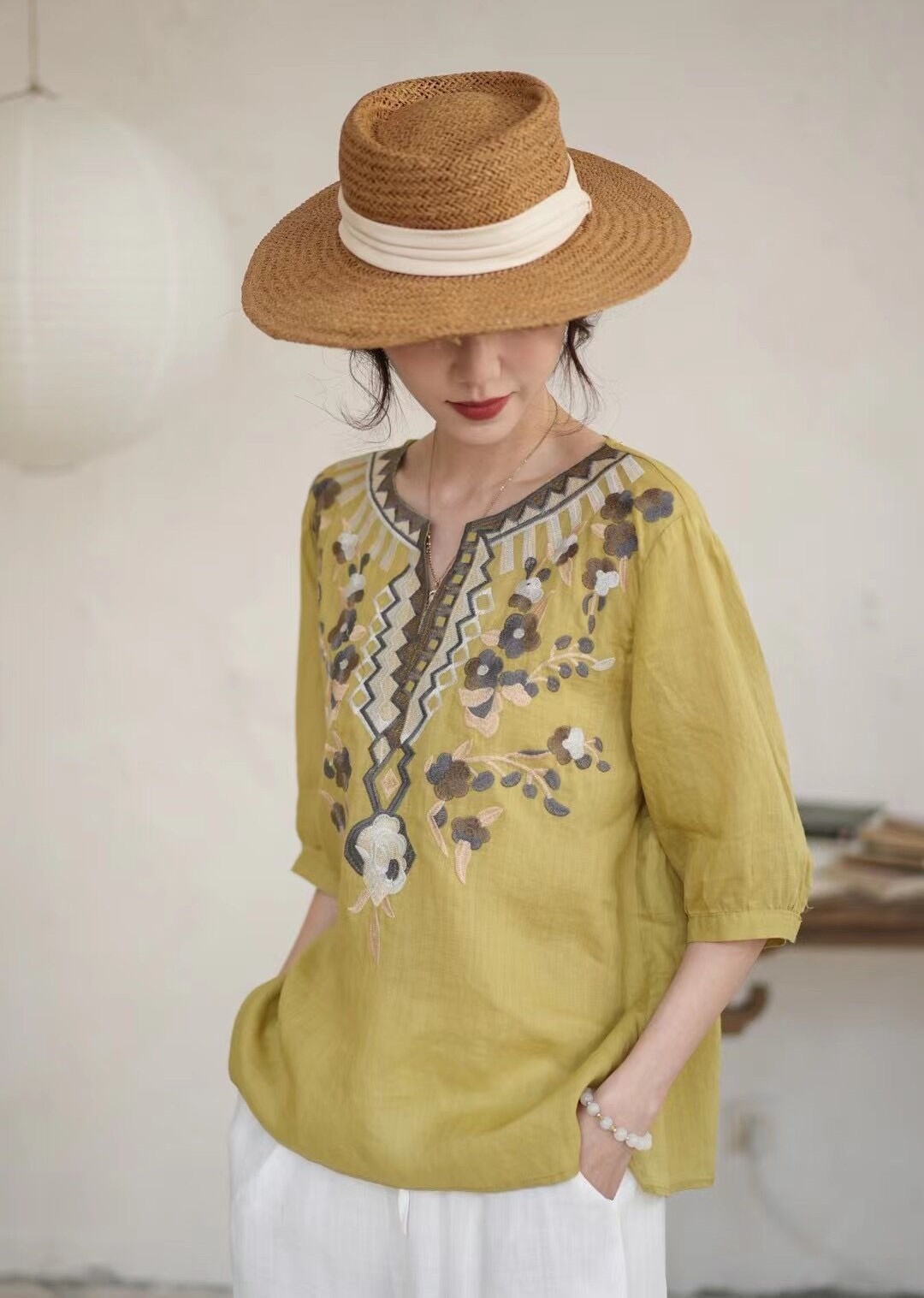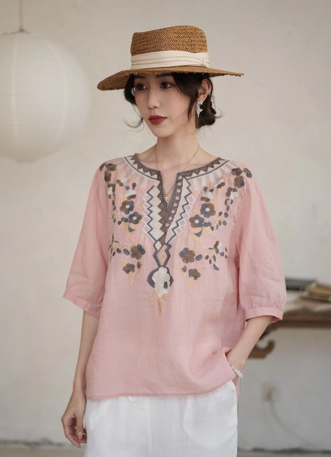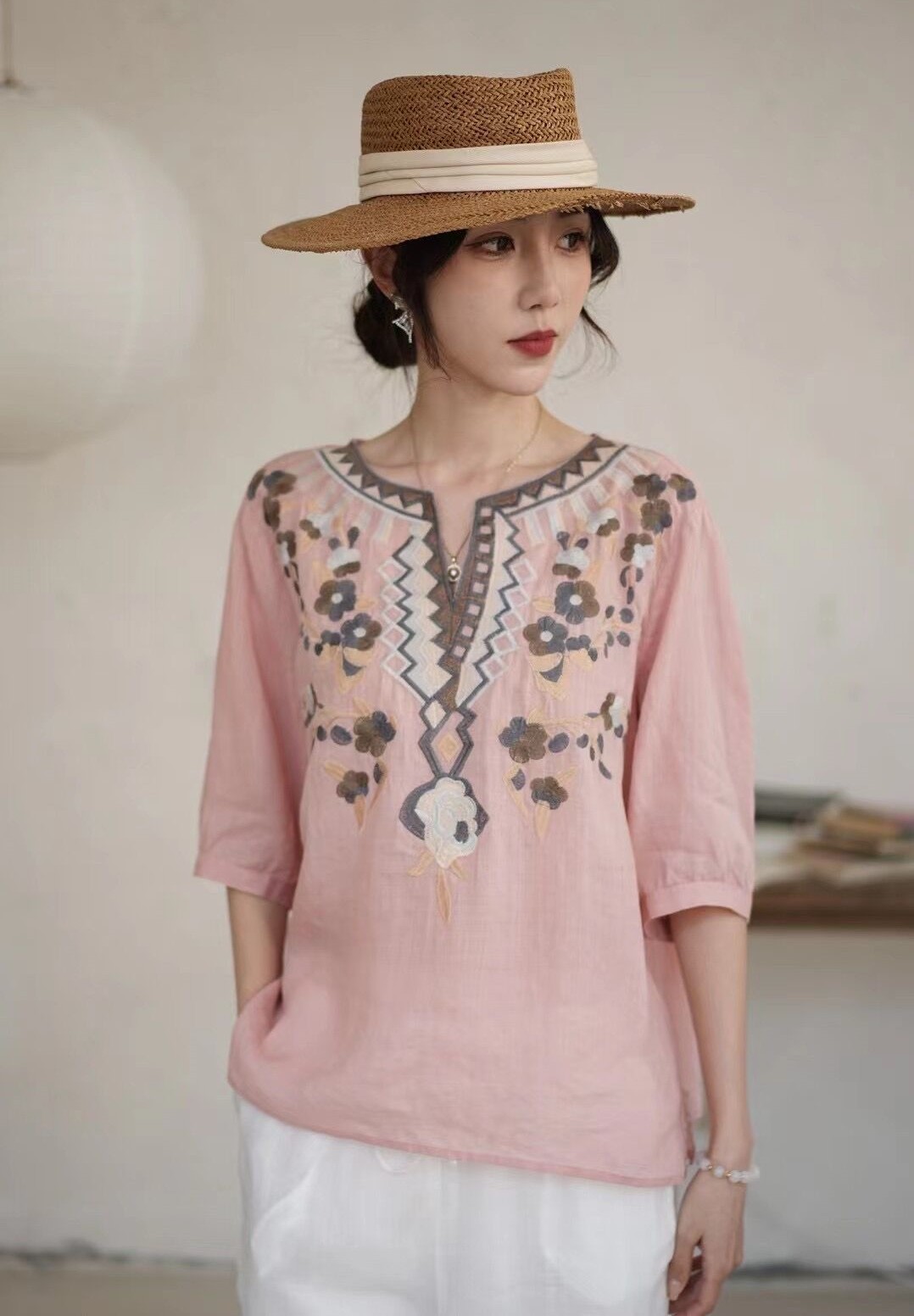42 라미 작은 셔츠 2024 여름 새로운 V-목 풀오버 최고 여성의 예술적 복고풍 자수 셔츠 8109스토어 가기