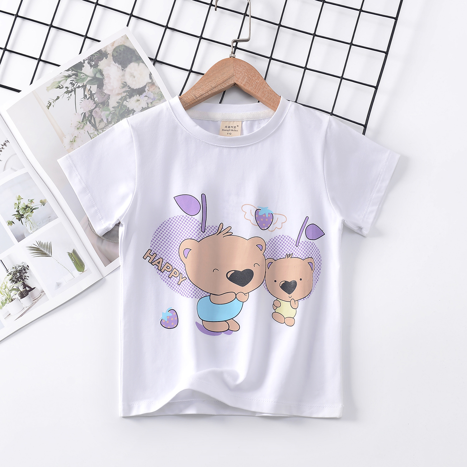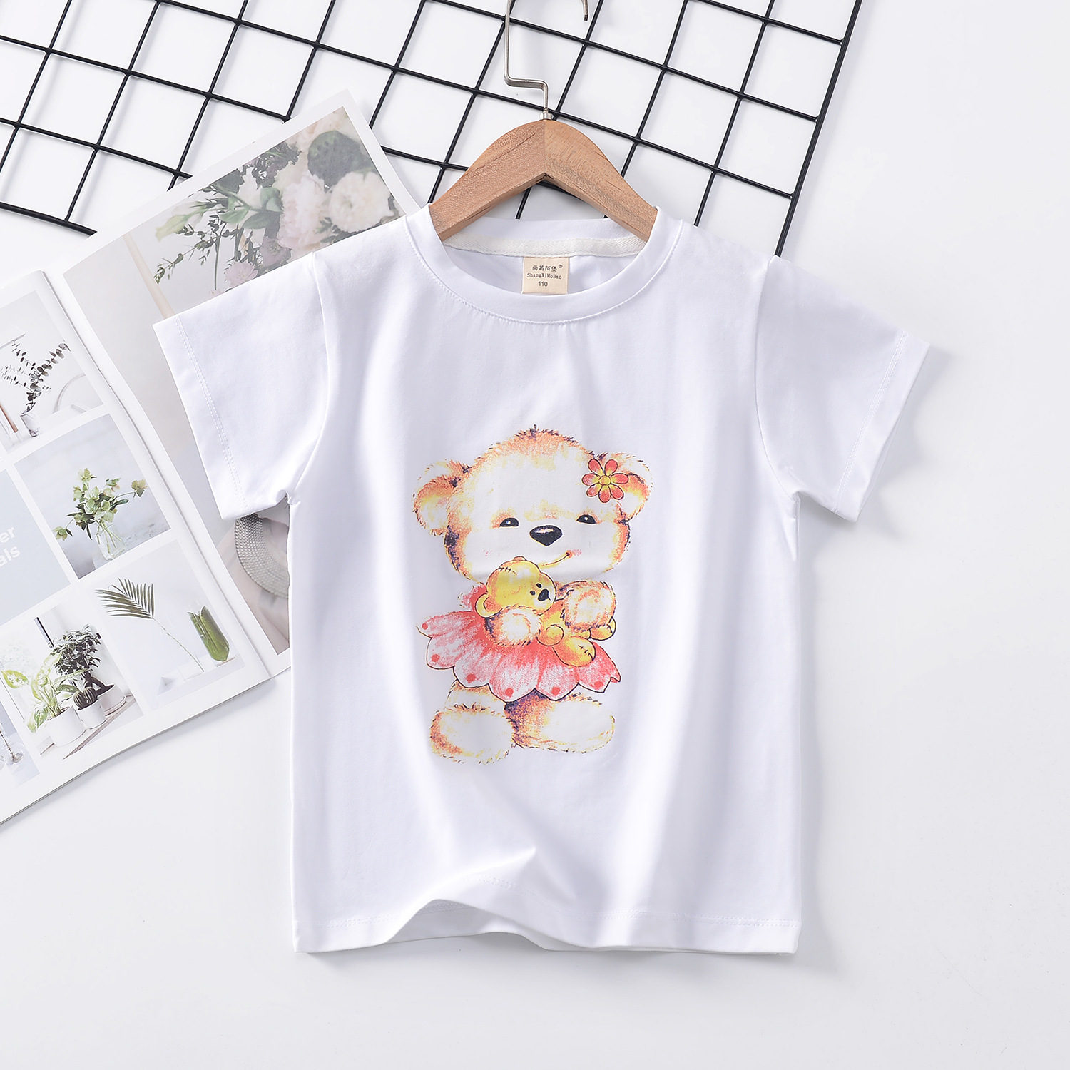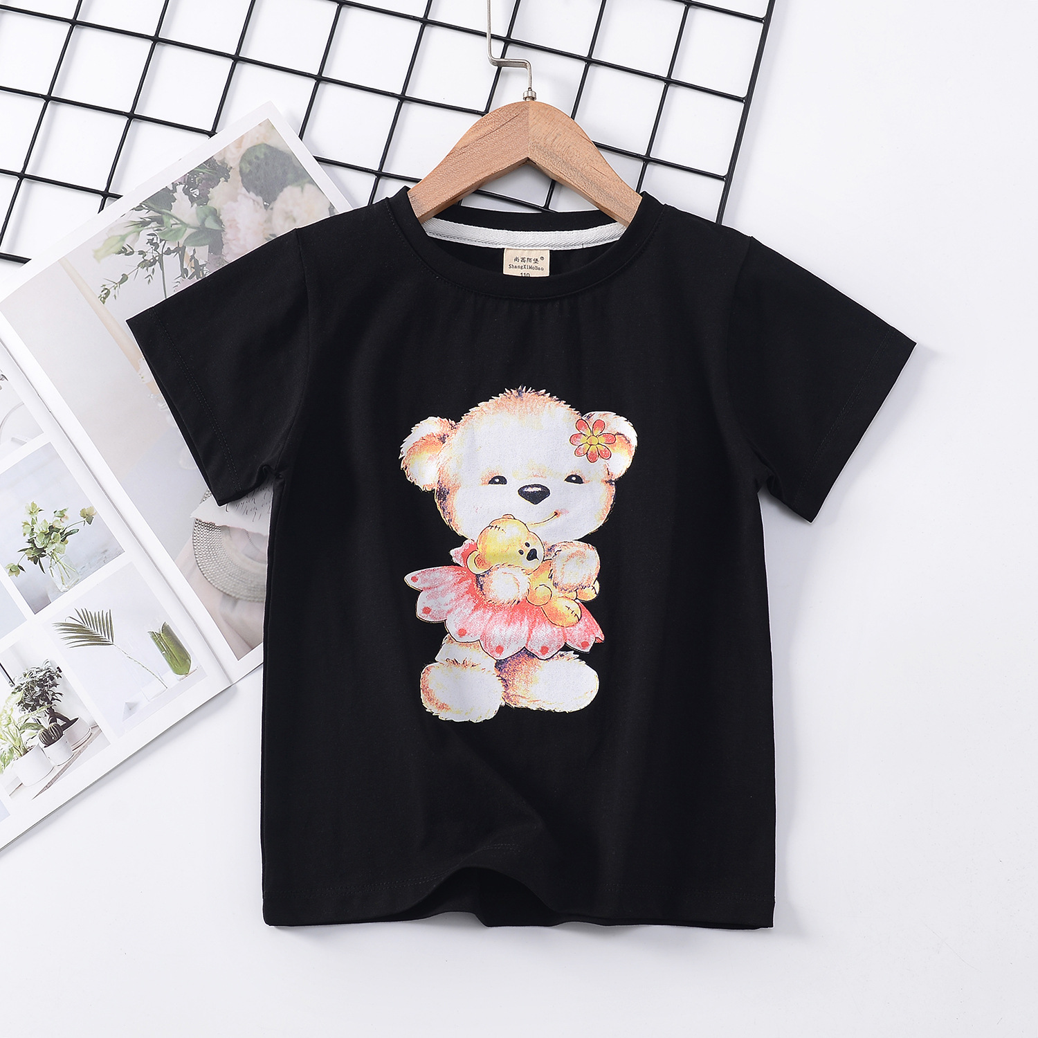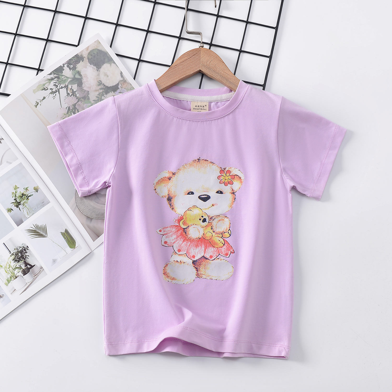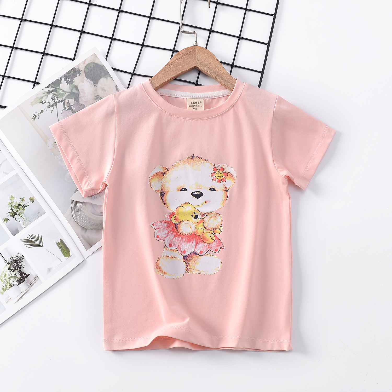 2024 년 여름 새로운 한국 스타일 어린이 반팔 곰 인쇄 소녀 티셔츠 얼음 도자기 면편지 소년 티셔츠 아동복스토어 가기