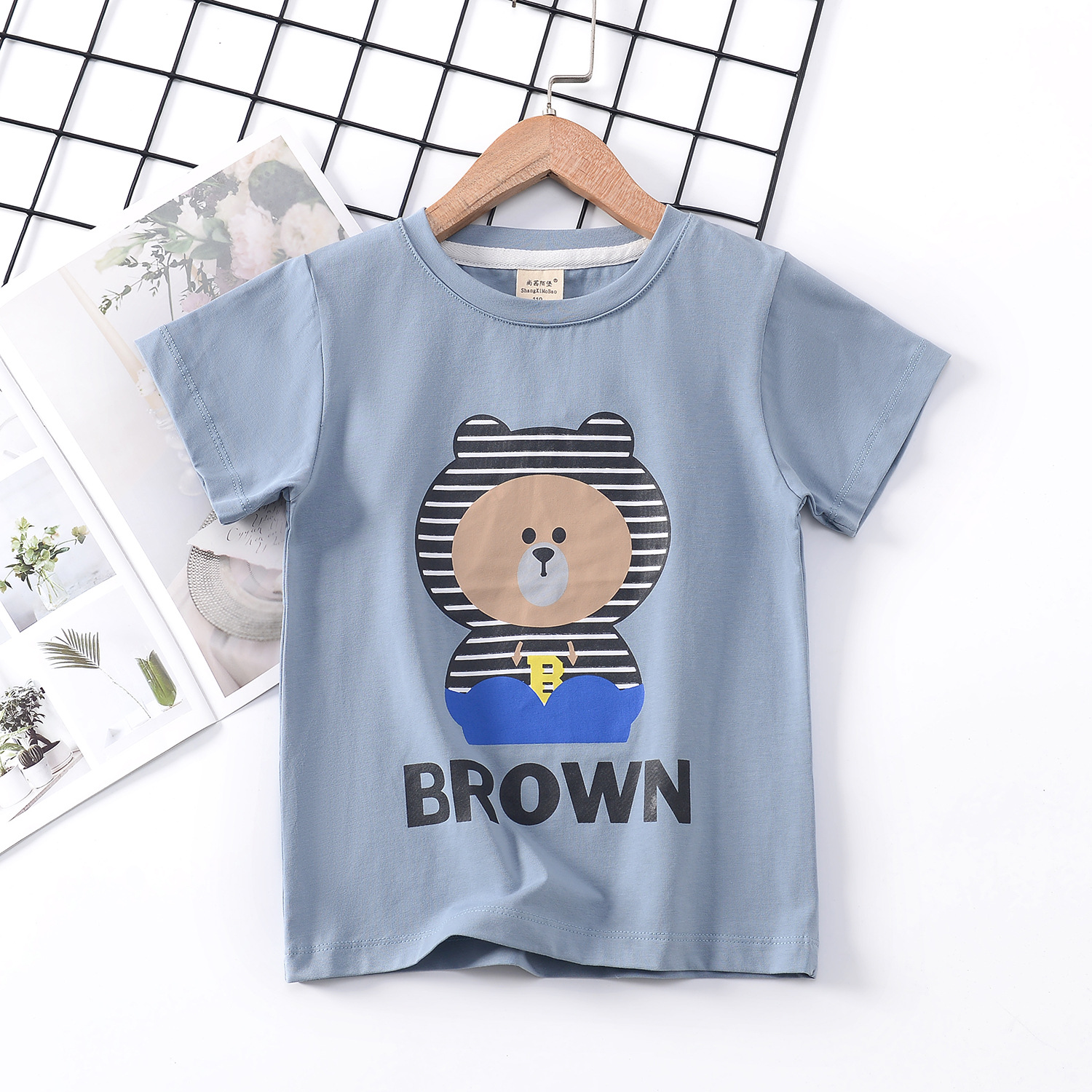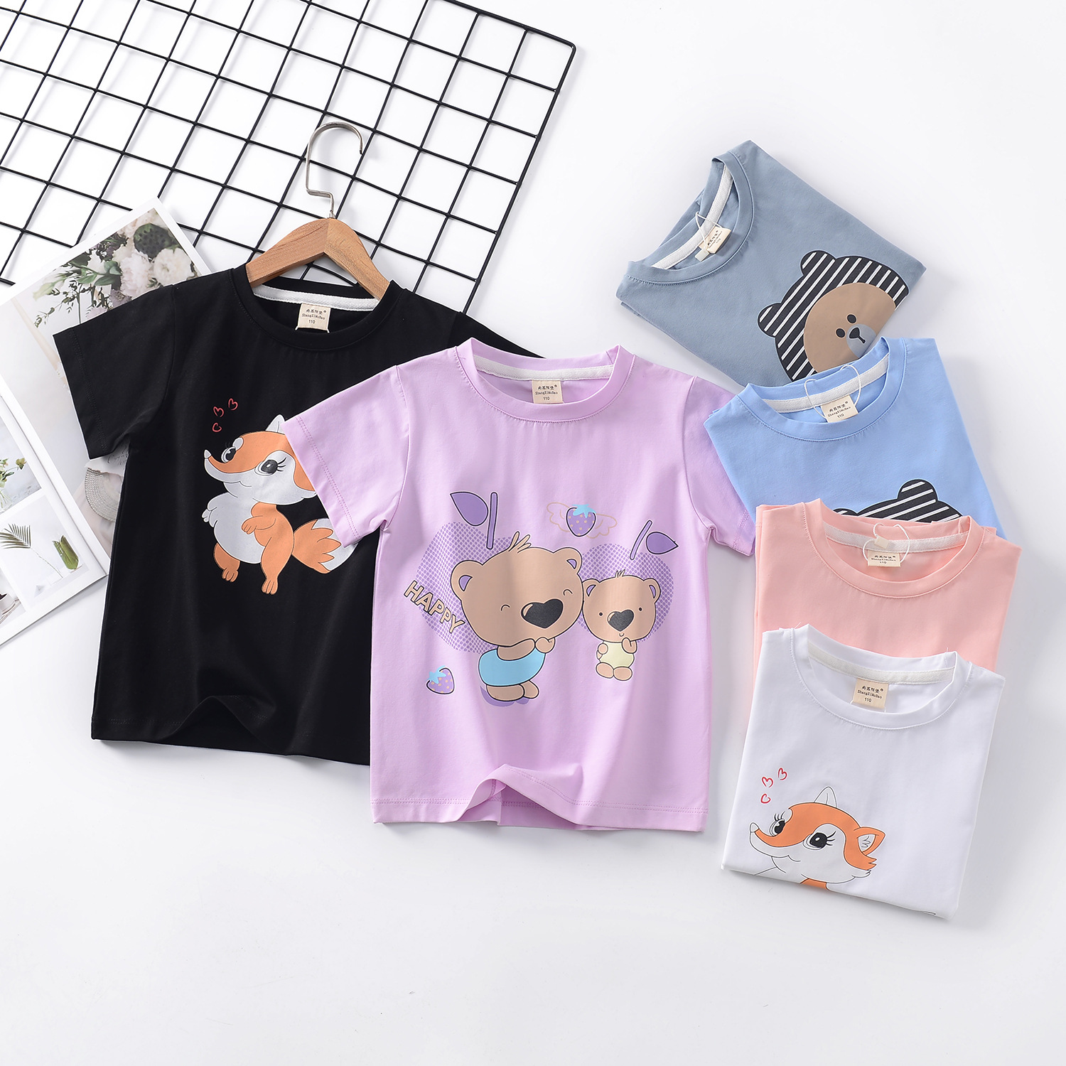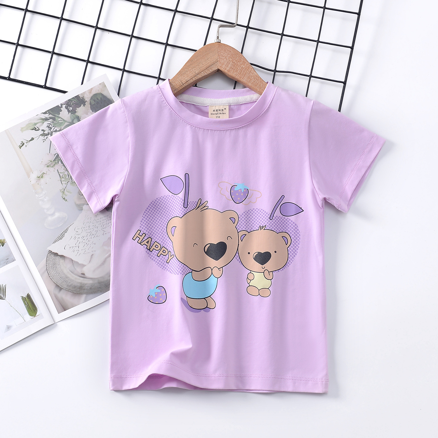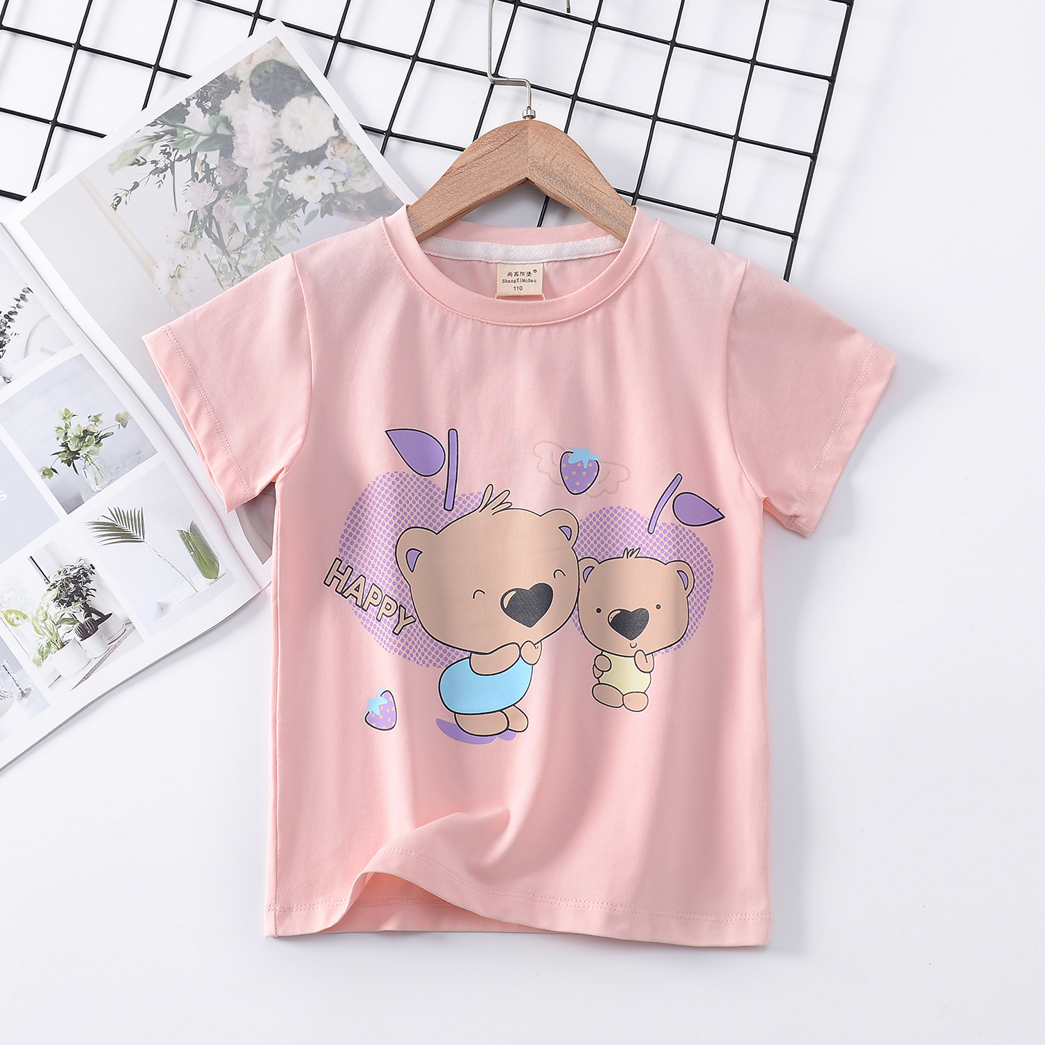 2024 년 여름 새로운 한국 스타일 어린이 반팔 곰 인쇄 소녀 티셔츠 얼음 도자기 면편지 소년 티셔츠 아동복스토어 가기