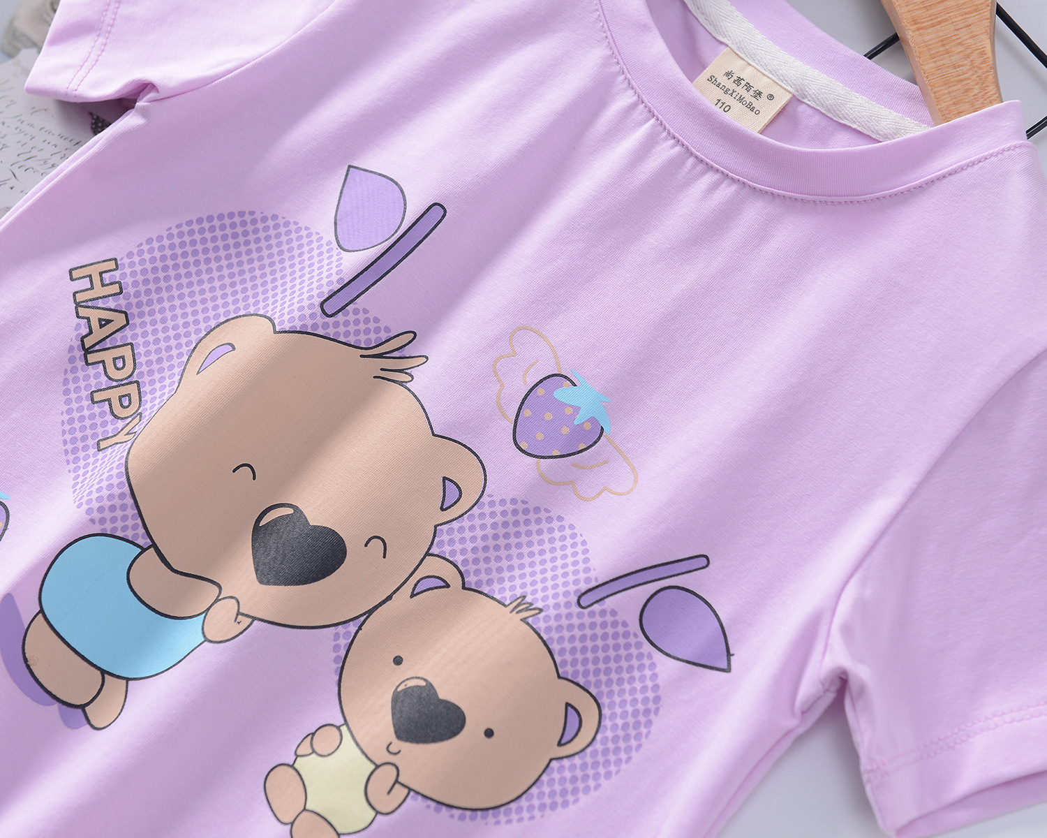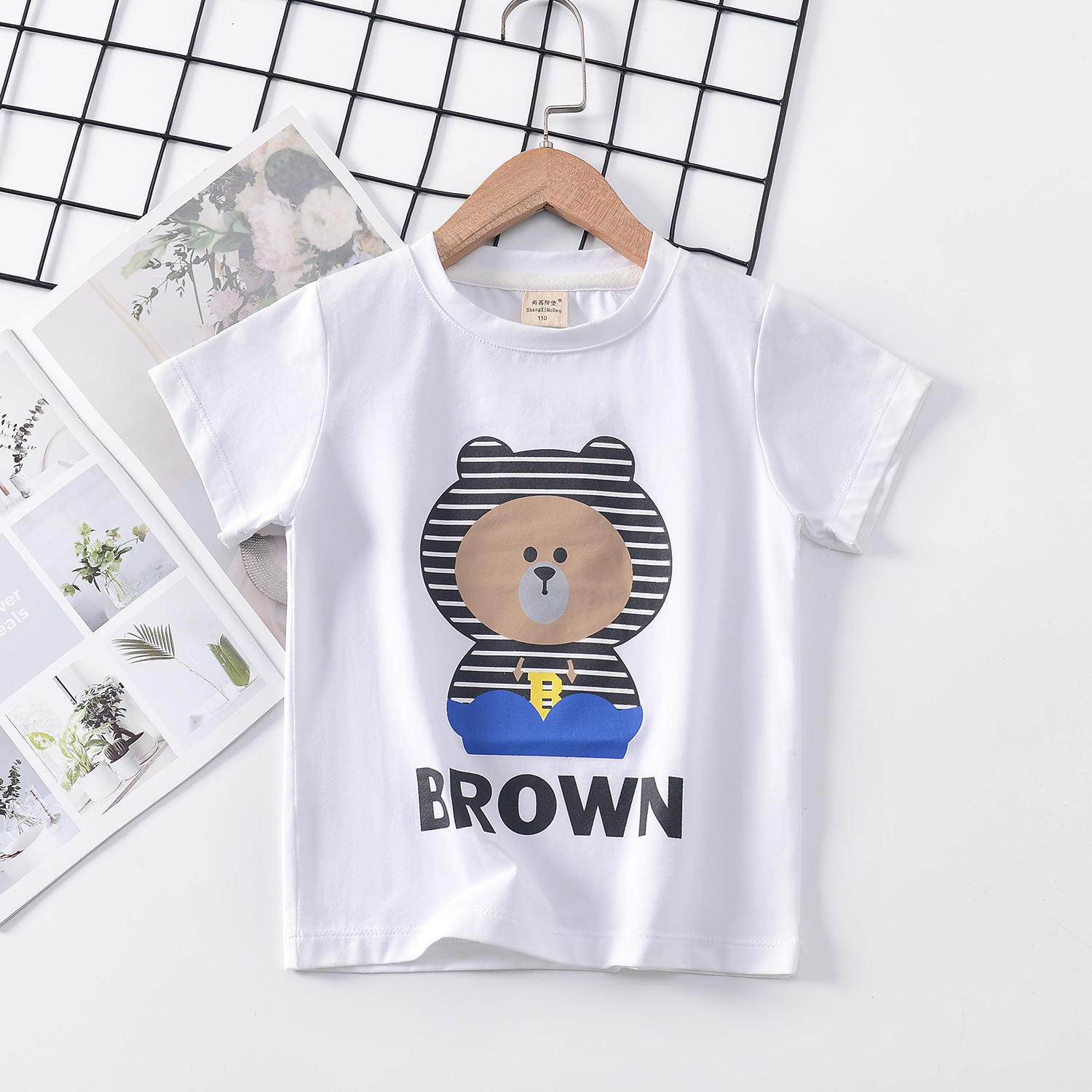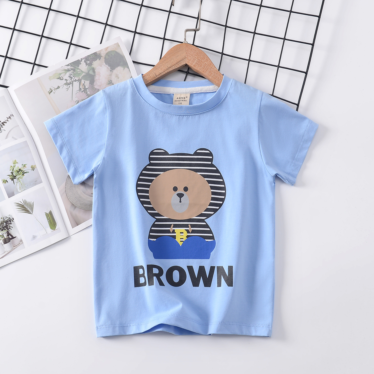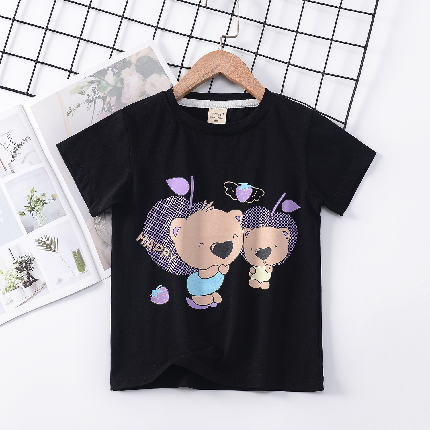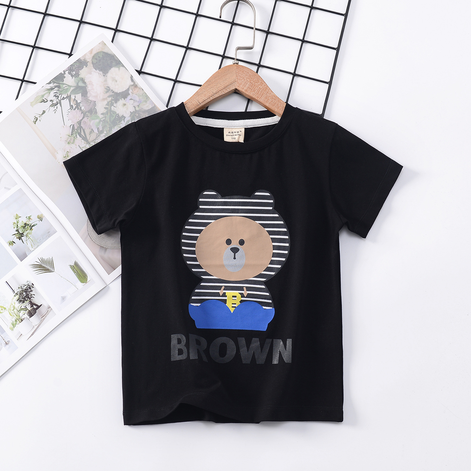 2024 년 여름 새로운 한국 스타일 어린이 반팔 곰 인쇄 소녀 티셔츠 얼음 도자기 면편지 소년 티셔츠 아동복스토어 가기