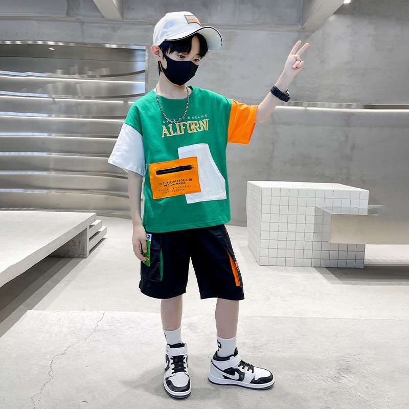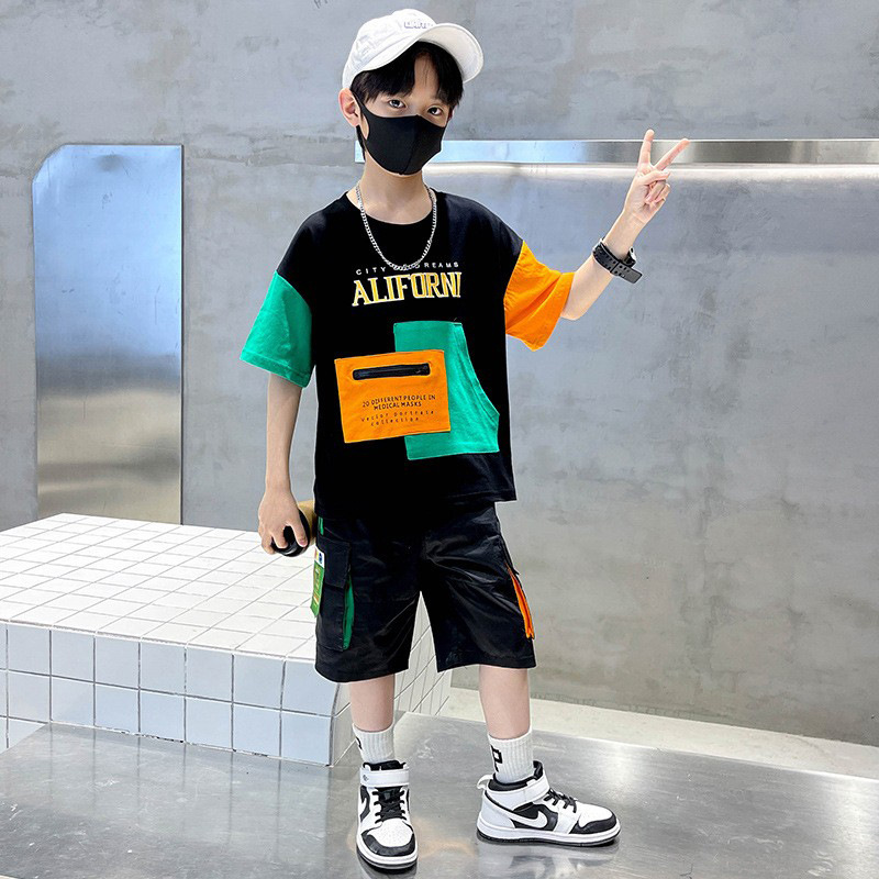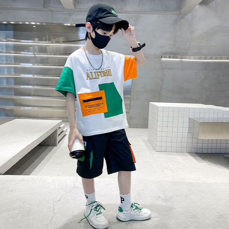 24 여름 어린이 패션 스타일 대조 컬러 느슨한 캐주얼 세트 소년 잘 생긴 반팔 5 점 바지 투피스 세트스토어 가기