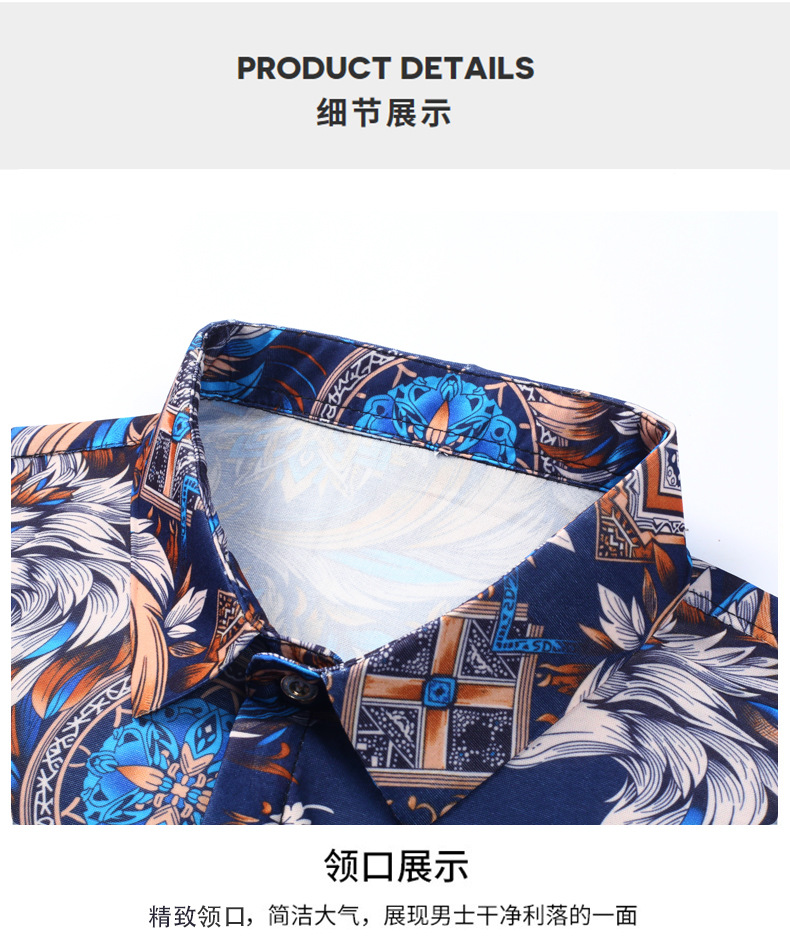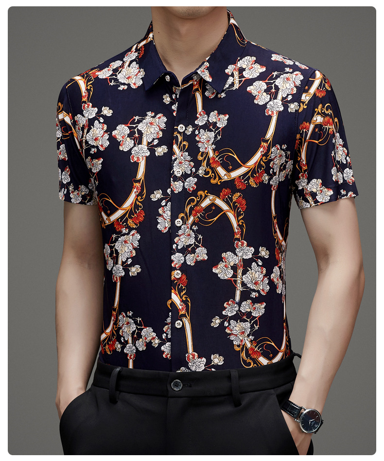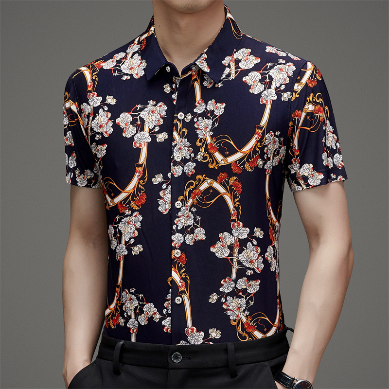 해변 여행 자카드 아이스 실크 셔츠 남자의 반팔 새로운 중년 및 젊은 여름 캐주얼 비 다림질 옷깃 최고 유행 남성