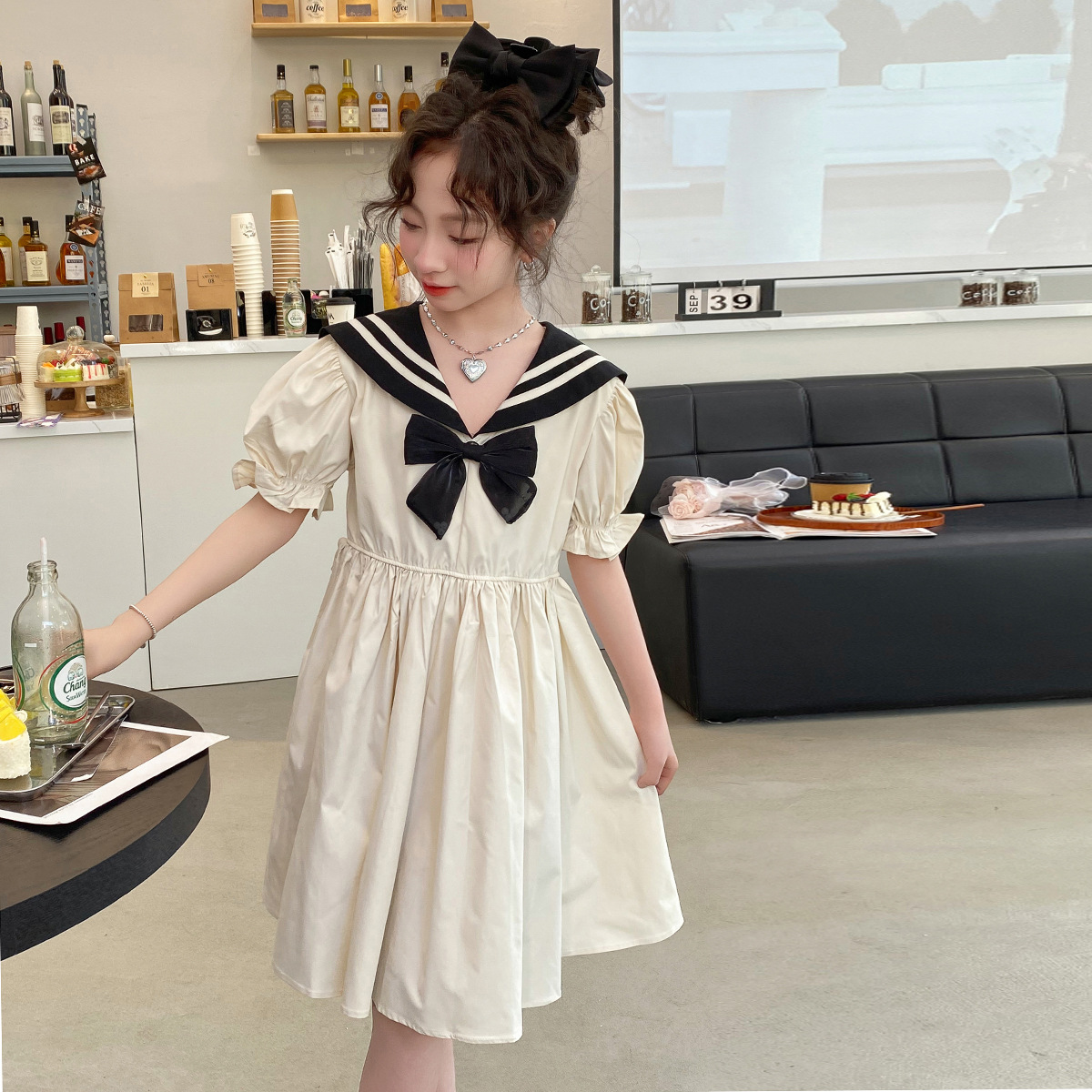 해군 칼라 원피스 소녀의 여름 원피스 2024 신형 중학교 고등학생 달콤한 한국 아카데미 스타일 스커트스토어 가기
