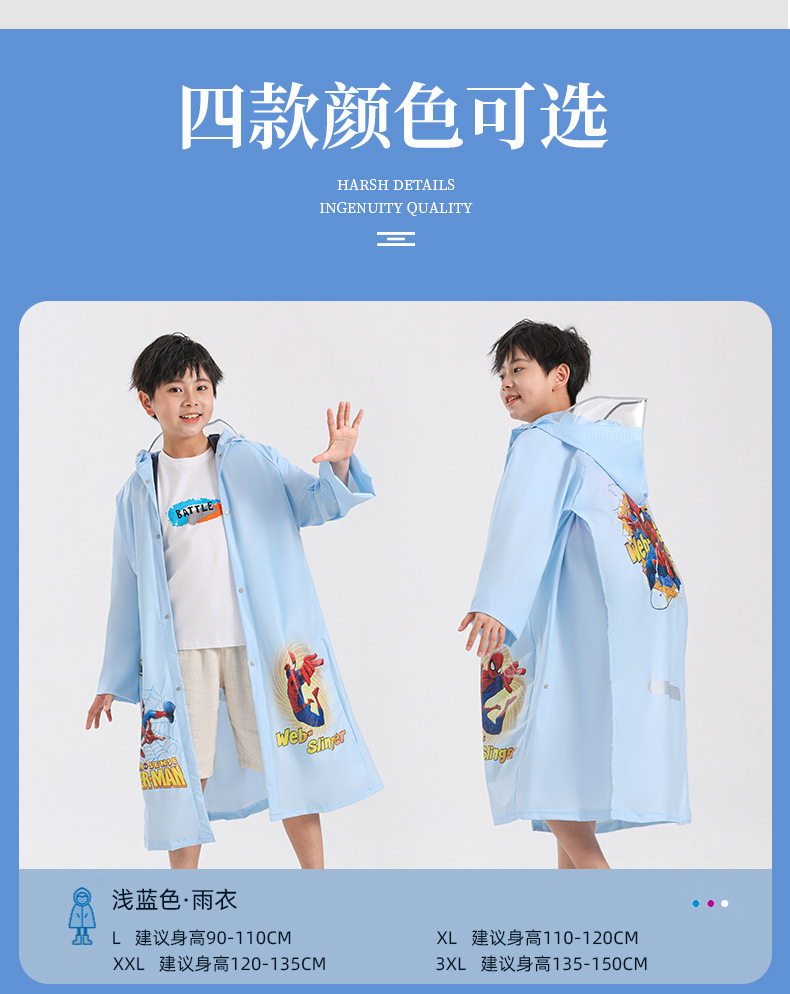 儿童雨衣PVC材质 因印花与材质原因,才收到时会稍有些味道的哦,一般用温水加洗衣液泡20几分钟 再在太阳下晒二天或通风二天基本没有味道的了,介意者请慎拍,现在冲量特价,喜欢就拍下的哦,量起来就涨价的哦  一件代发,量大从优!