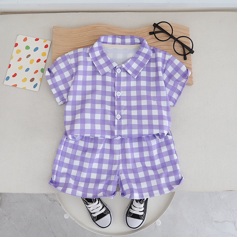 소년 소녀 여름 반팔 격자 무늬 셔츠 반바지 투피스 세트 어린이 여름 서양식 캐주얼 세트 아기 옷스토어 가기