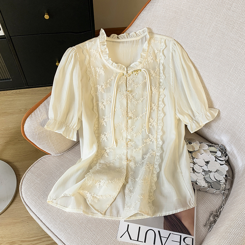 버클이 달린 새로운 중국 스타일의 레이스 블라우스 여성 여름 착용 2024 새로운 중공업 자수 말 얼굴 스커트 탑스토어 가기
