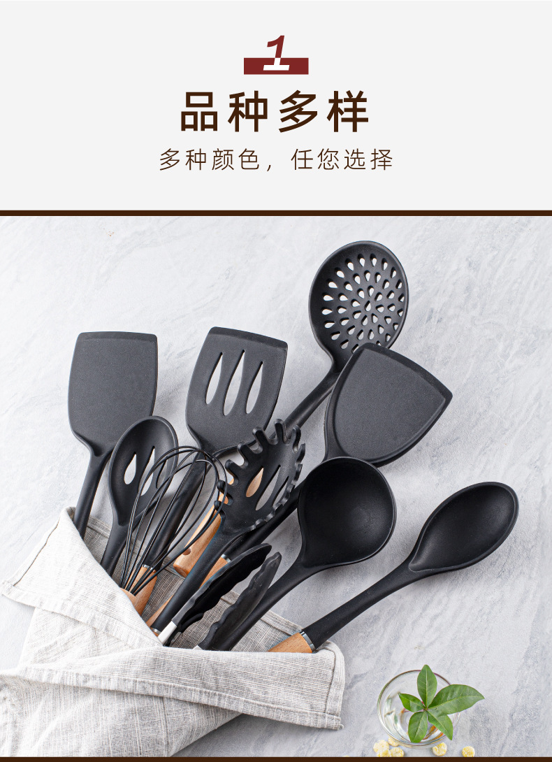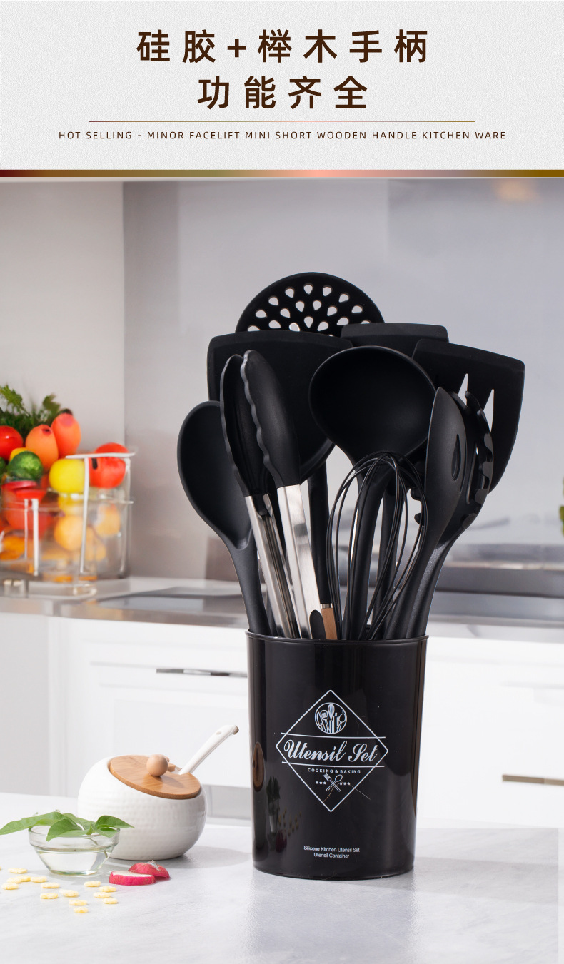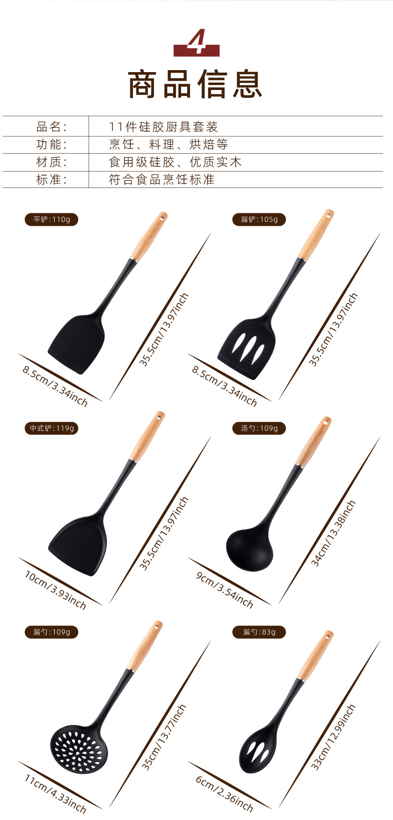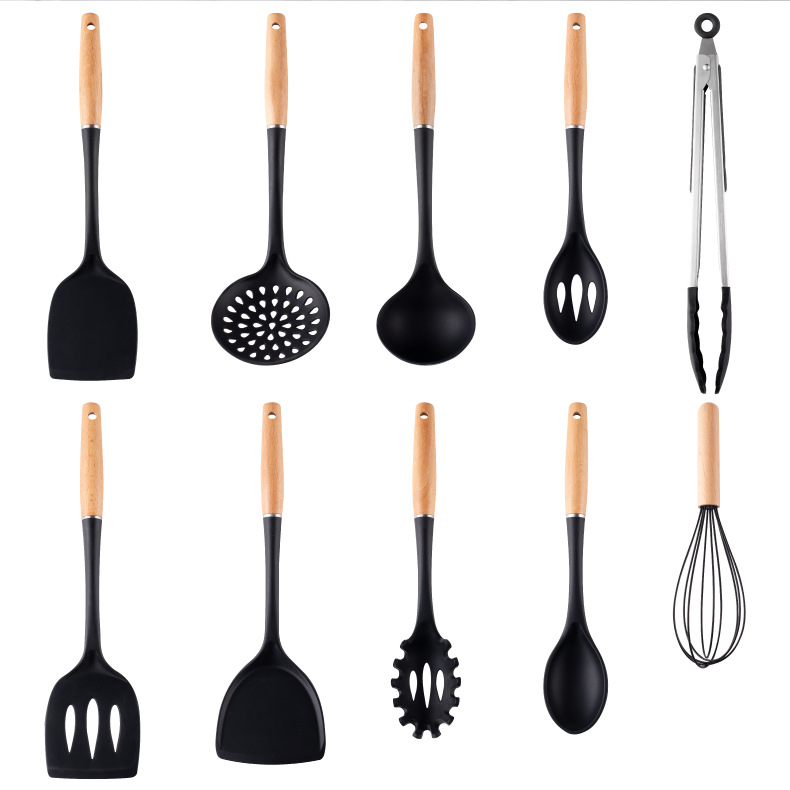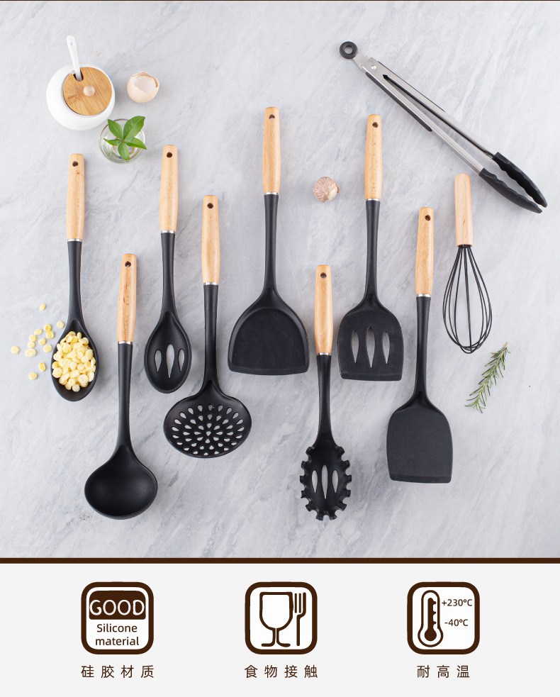나무 손잡이 실리콘 주방용품 세트 11 조각 요리 숟가락 삽 유럽과 미국 스타일 간단한 긁지 않는 냄비 주방 도구 세트