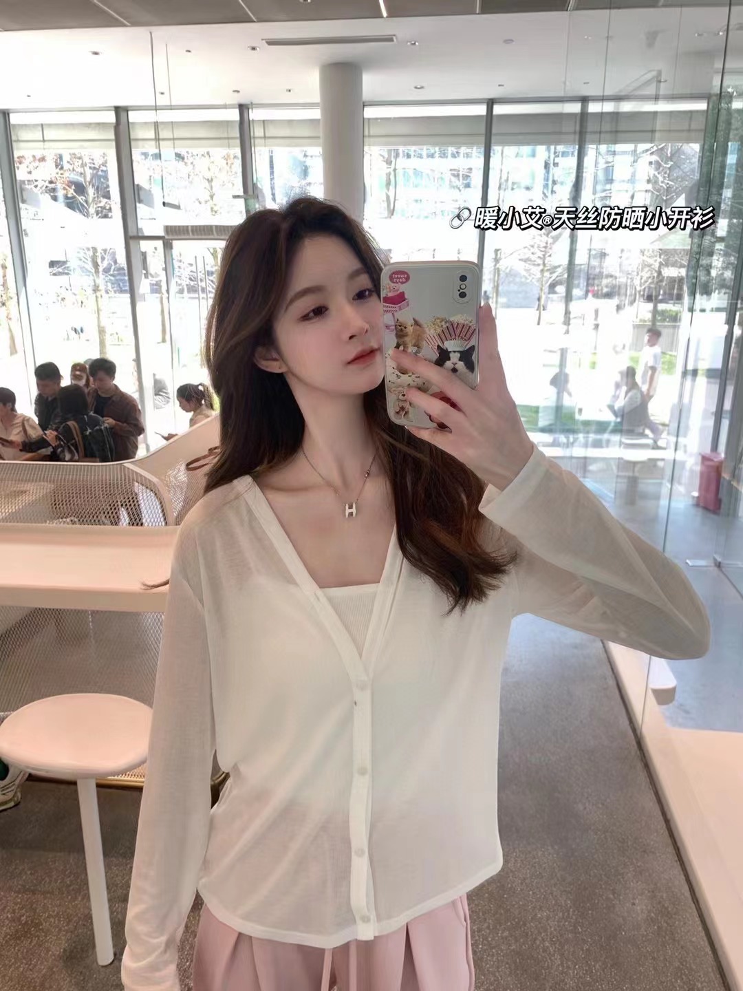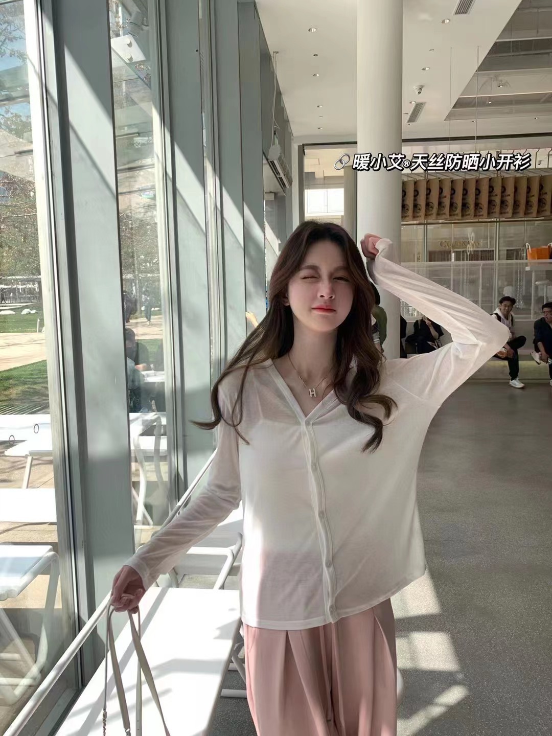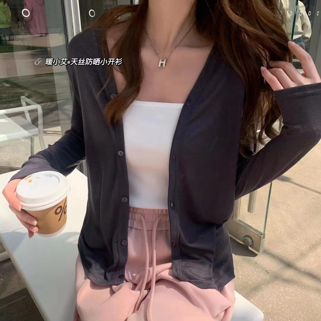 카스티야 ~ 여름 일본 텐셀 카디건 여성용 긴팔 얇은 슬링 아우터 블라우스 V넥 에어컨 셔츠 탑