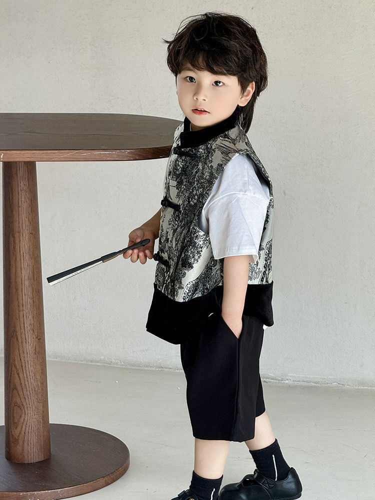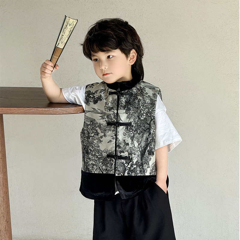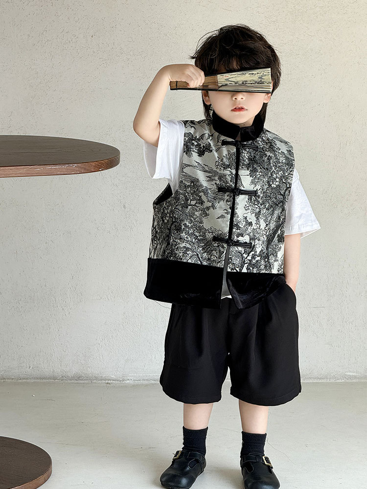 어린이 의류 중국 스타일 조끼 봄 새로운 복고풍 잉크 페인팅 벨벳 스티칭 조끼 세트 모조 세대