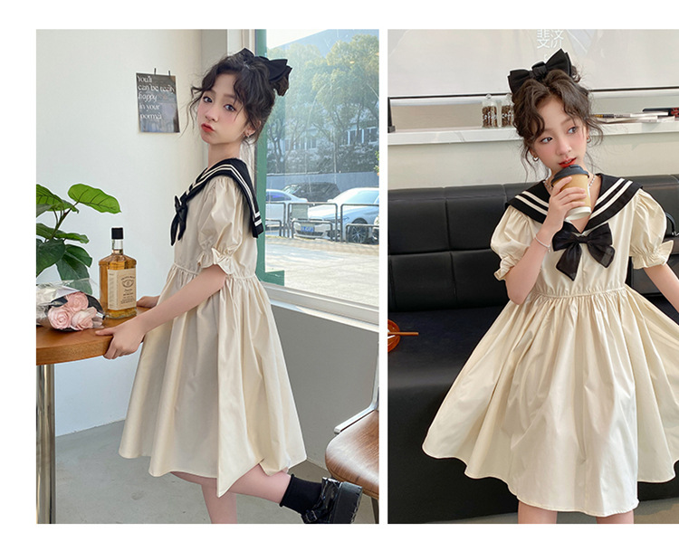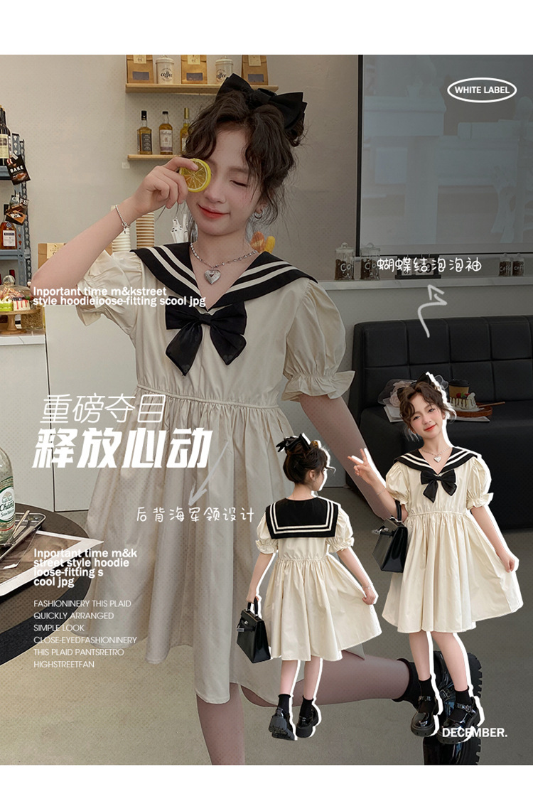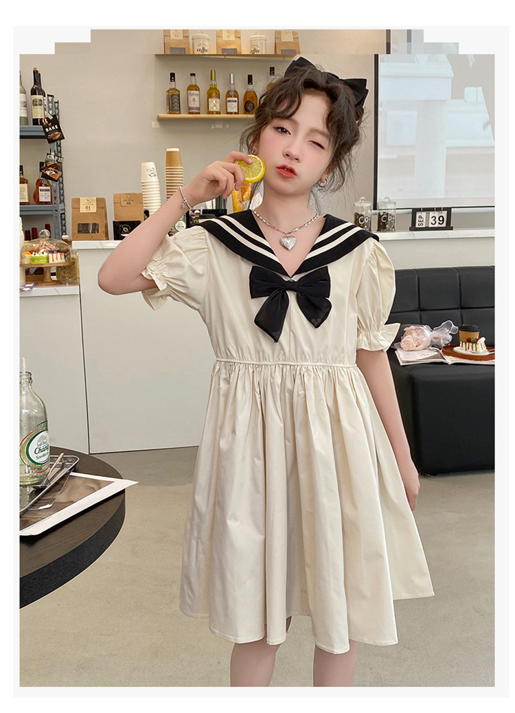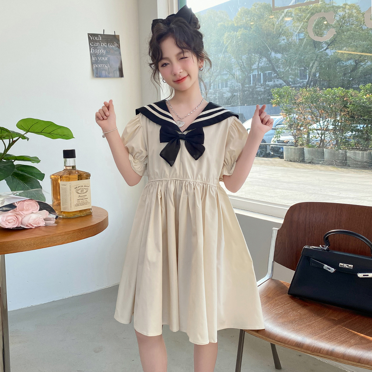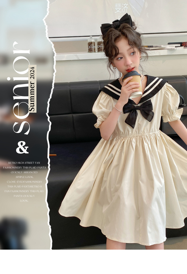 소녀의 원피스 여름 2024 새로운 스타일 웨스턴 스타일 미드 빅 키즈 여름 원피스 대학 스타일 반팔 해군 칼라 중간 길이 원피스스토어 가기