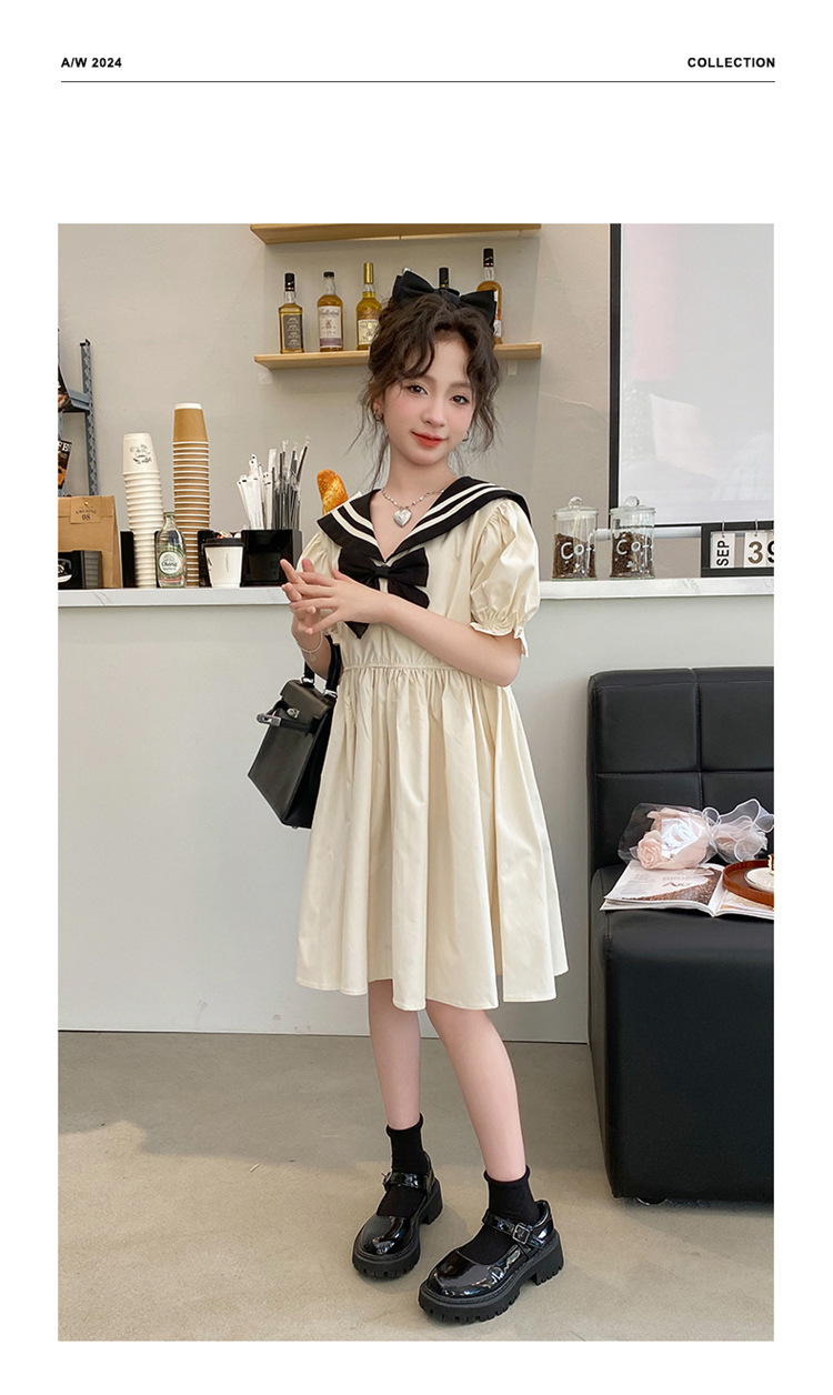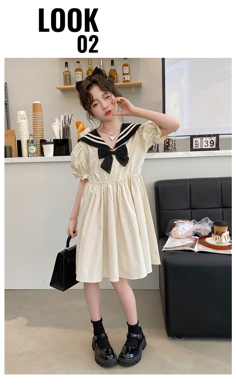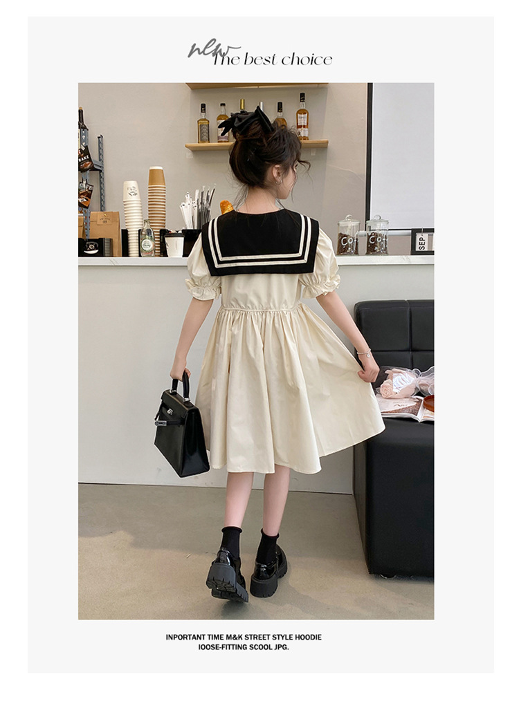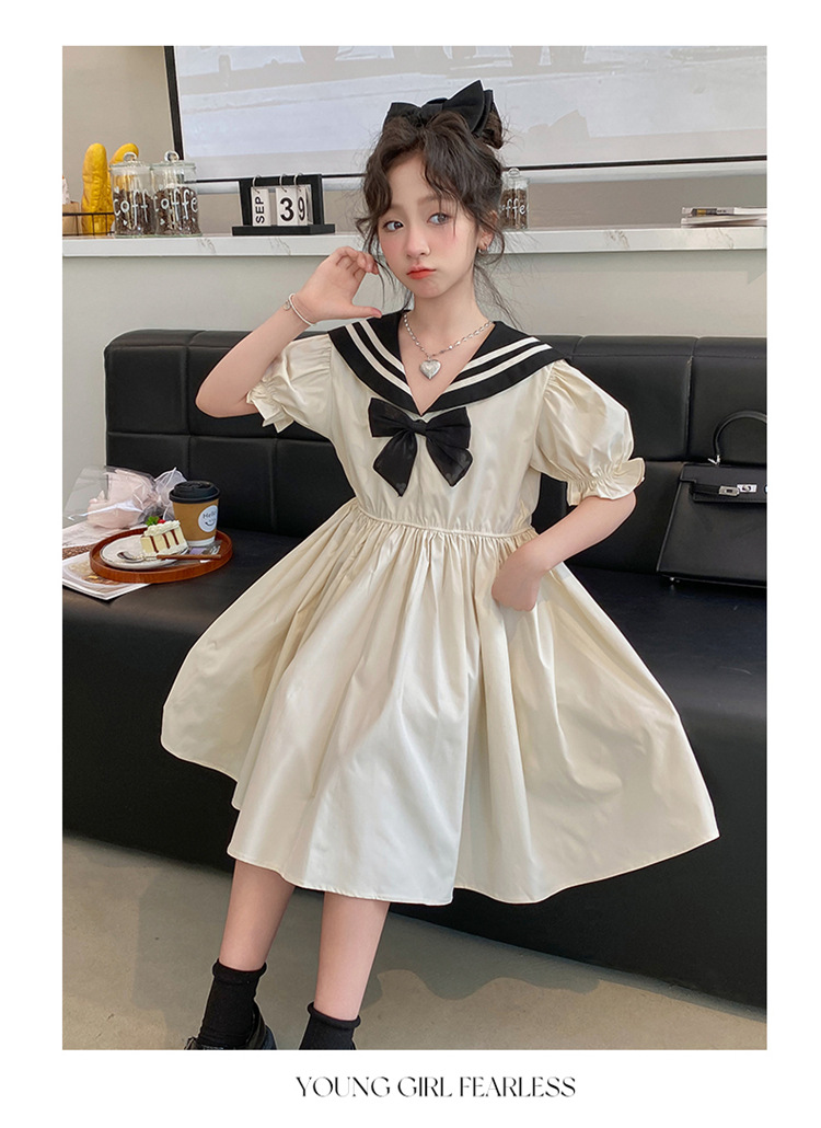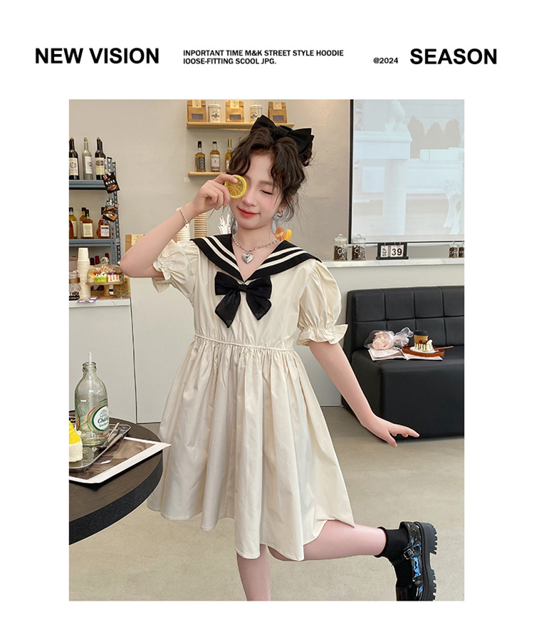 소녀의 원피스 여름 2024 새로운 스타일 웨스턴 스타일 미드 빅 키즈 여름 원피스 대학 스타일 반팔 해군 칼라 중간 길이 원피스스토어 가기
