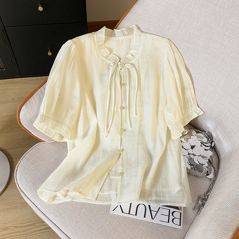 2024 여름 새로운 중국 스타일 짧은 소매 쉬폰 셔츠 여성용 슬리밍 빈티지 스타일 셔츠 최고 트렌디스토어 가기