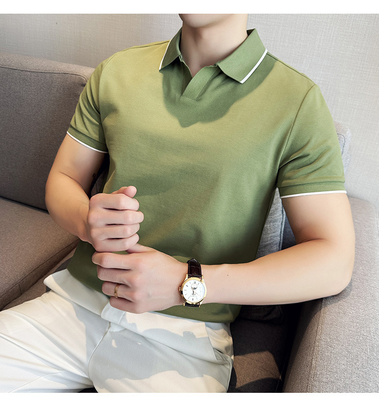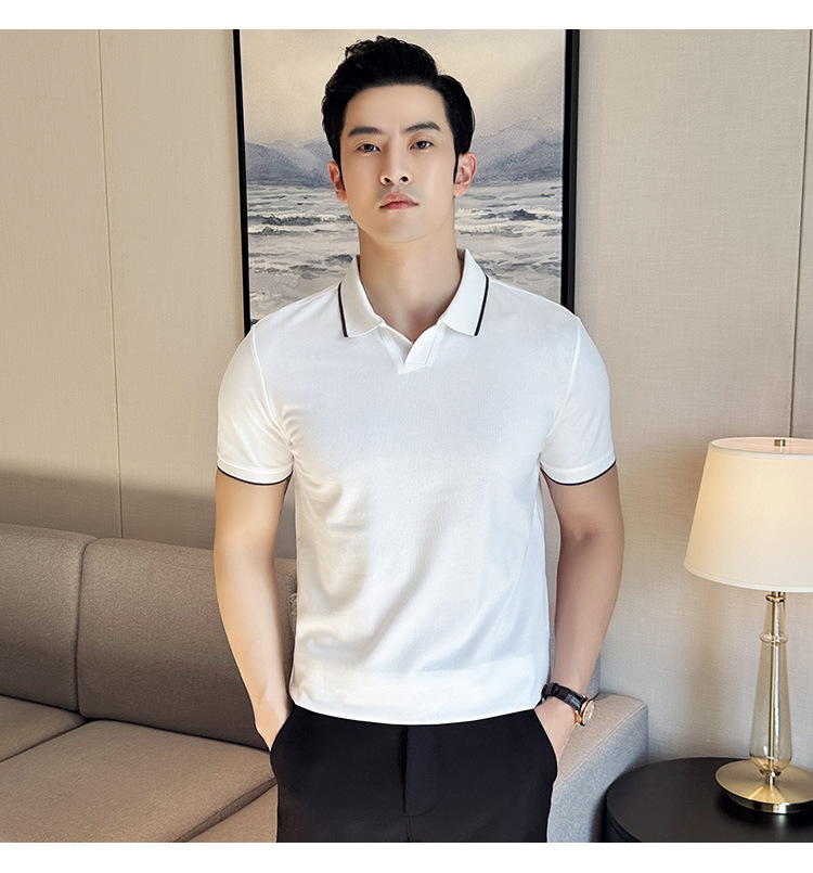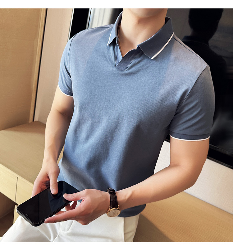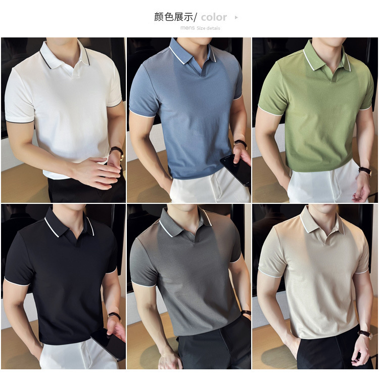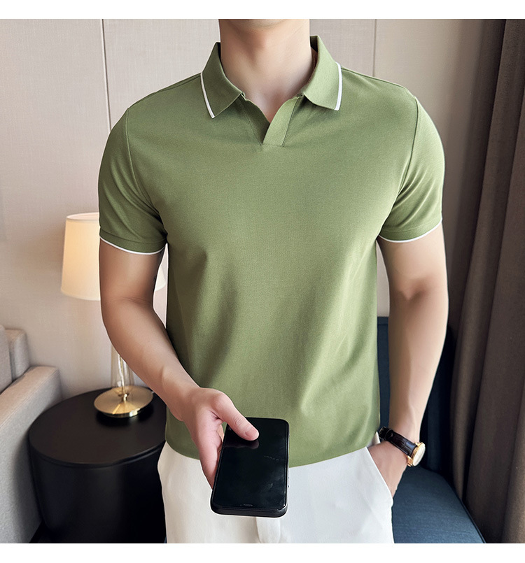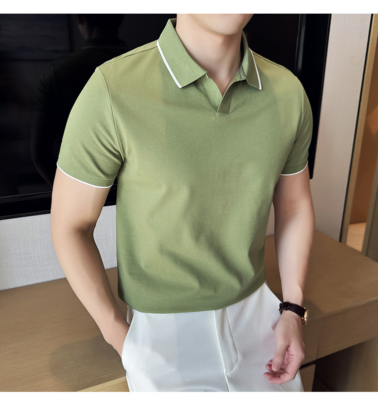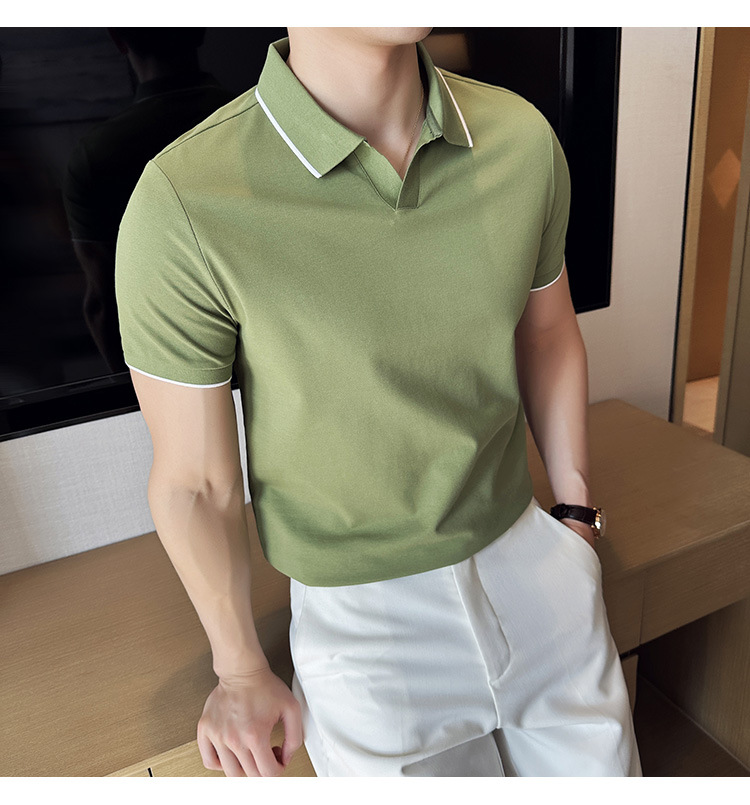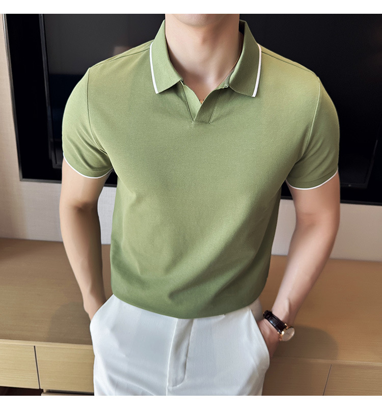 여름 머서라이즈 피케 코튼 라펠 반팔 폴로 셔츠 남성 비즈니스 라이트 럭셔리 솔리드 컬러 캐주얼 탑 v 넥 티셔츠 트렌디스토어 가기