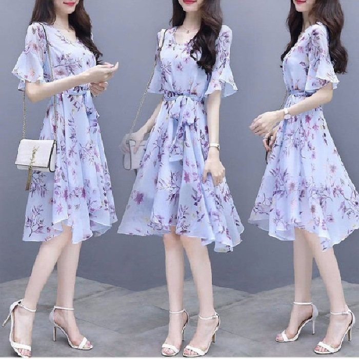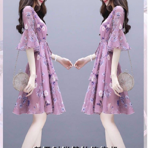 인쇄 된 우아한 원피스 여성 여름 새로운 한국 스타일 긴 원피스 타이트 허리 슬리밍 요정 원피스 중간 길이 치마스토어 가기